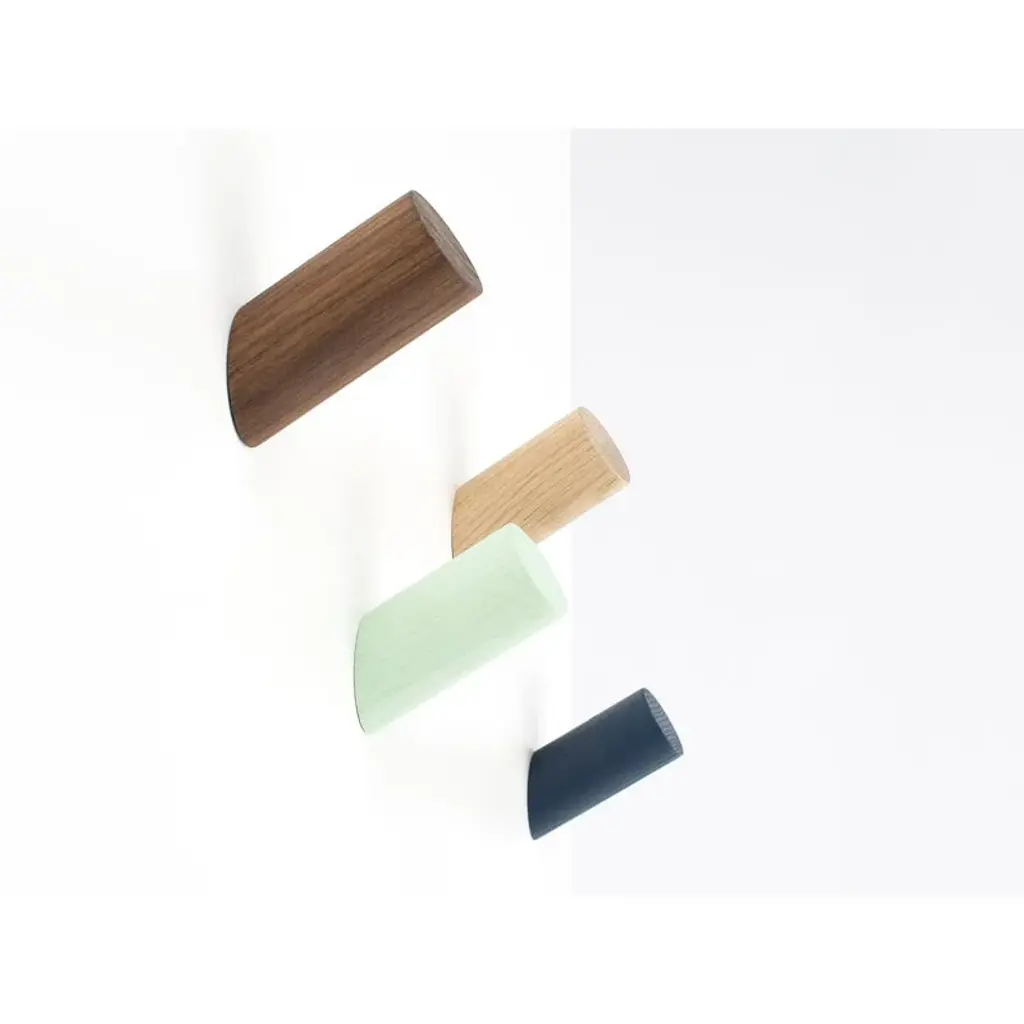 The Peg wall hook by Hem charms with its simple, diagonal shape and vivid surface of wood. Designed by Jonah Takagi, the Peg hooks can be used in any room, from the hallway to the kitchen, and they look great both alone and in groups. Inside the solid wood hook is an aluminum mechanism that makes wall-mounting easy.