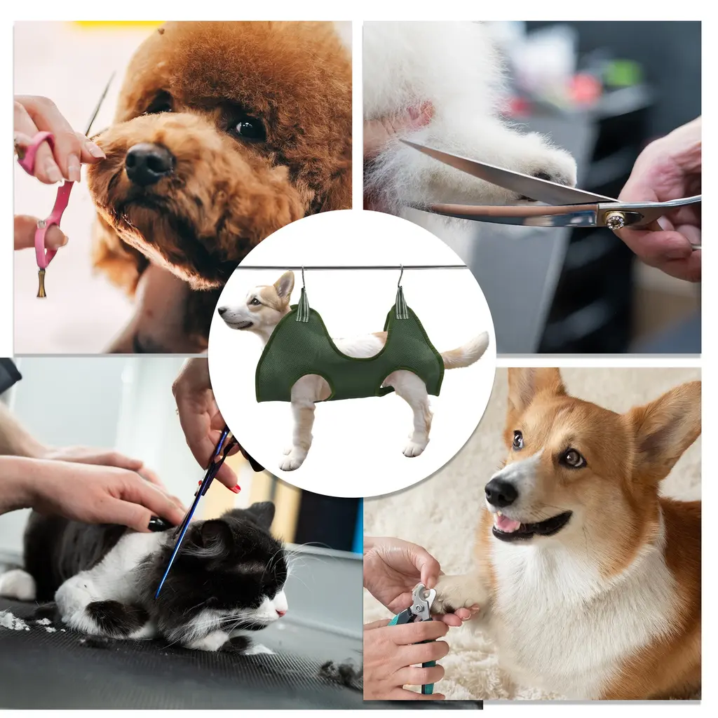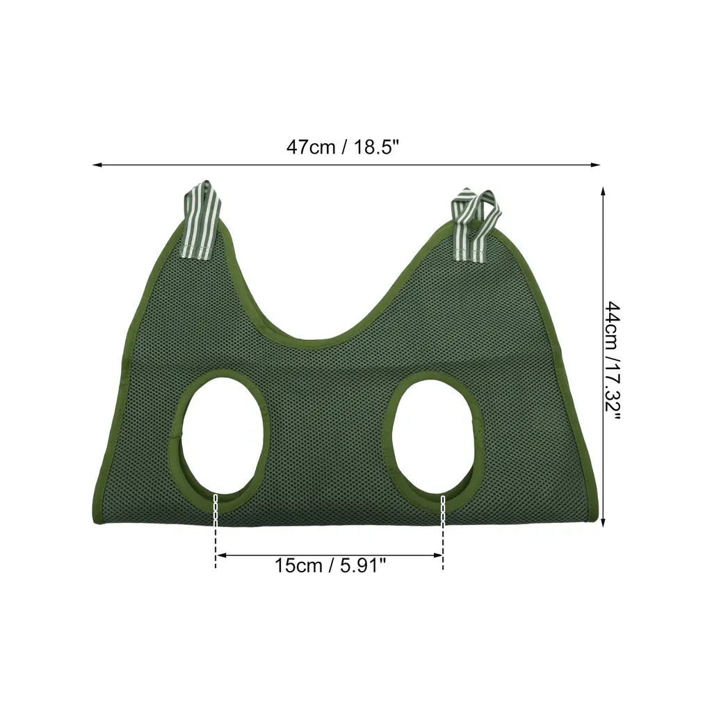 Feature:As a pet owner, you can easily complete various pet grooming projects. It is more convenient to feed pets medicine, clean teeth and ears, and use eye dropsThe hammock is foldable and easy to use and store. Breathable fabric protects pet skin from harmEasy to clean, ensuring the cleanliness of the hammock.Specification:Color: GreenMaterial: PolyesterDistance Between Two Holes: 15cm / 5.91"Size: 47x44cm / 18.5"x17.32"(L*W)Package Included:1 Pcs Pet Grooming Hammock2 Pcs Hooks