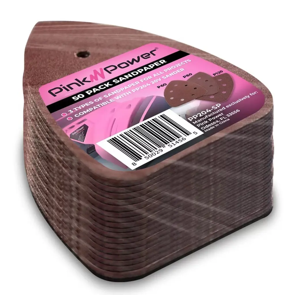 This detail sandpaper is suitable for Pink Power PP204 20V cordless palm sanders. It consists of a 50-piece assortment of sanding pads for P60/P80/P120, suitable for wood furniture, metal or non-metal walls, and other types of materials.