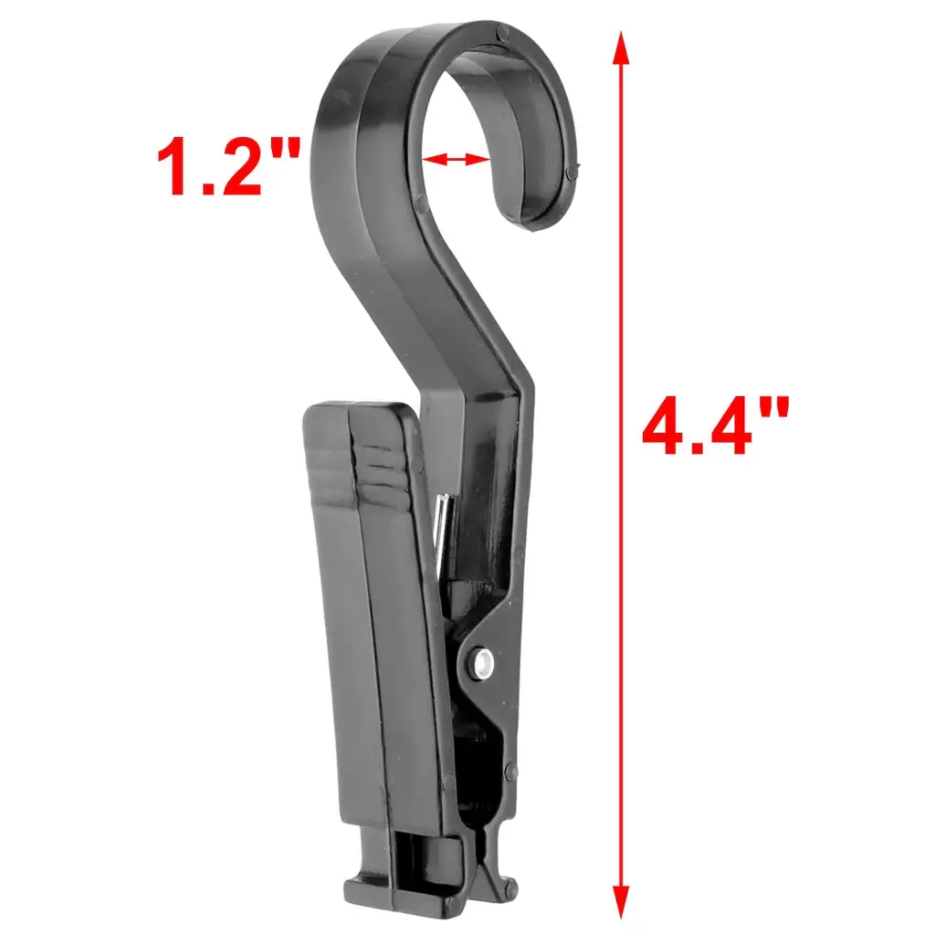 Color: Black,Silver Tone; Material: Plastic,MetalPackage Content: 10 x Clothes Hook Clips; Product Name: Clothes Hook ClipNet Weight: 206gTotal Size: 11.3 x 4.5 x 1.8cm/4.4" x 1.8" x 0.7"(L*W*T)Hook Inner Diameter: 3cm/1.2"It is a good helper to anti wind when your clothes, socks, little things bask in the outside.Spring loaded design clips are easy to open and clamp.Ideal for use to hold laundry bags in the bathroom or socks outdoor.