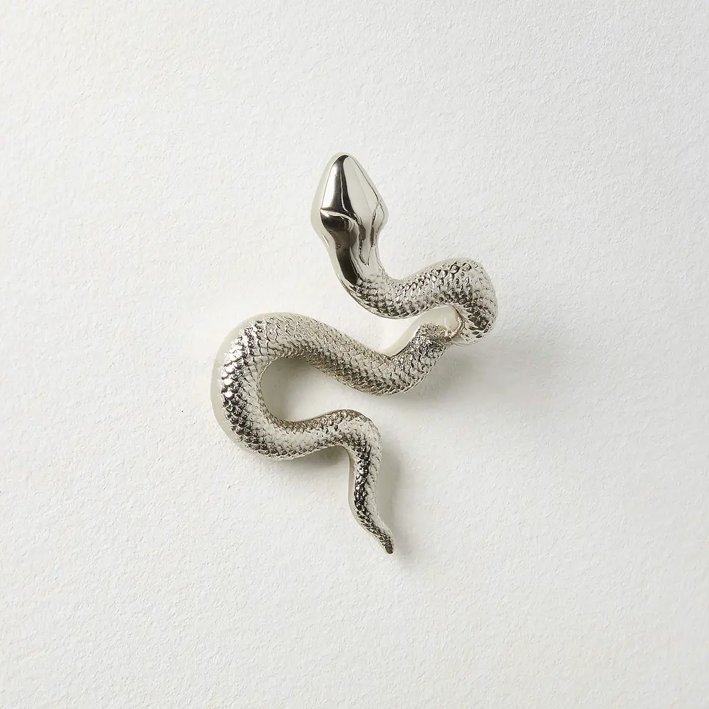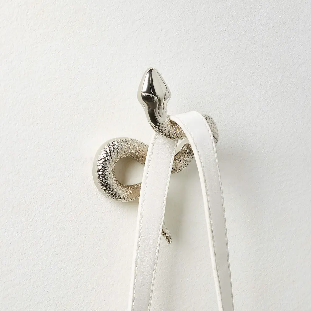 Designed by Brett Beldock, snake wall hook is boldly modern. Cast of solid brass with a polished nickel finish, Beldock incorporates scale-like texture throughout her design for a fun, modern effect. CB2 exclusive.