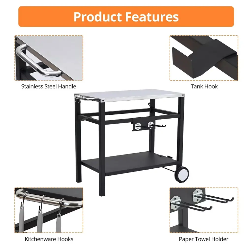 Stainless Steel Outdoor Grill Cart - Portable Pizza Oven Stand with Gas Tank Hooks & Prep TableWhether you’re hosting a backyard BBQ, camping with friends, or tailgating before a game, this professional-grade stainless steel grill cart transforms your outdoor cooking setup. It blends all-weather durability, smart storage, and easy mobility—keeping your pizza oven, grilling tools, and ingredients organized, accessible, and protected from the elements.1. Commercial-Grade 304 Stainless Steel Construction: All-Weather DurabilityBuilt to withstand the harshest outdoor conditions, this cart features heavy-duty 304 stainless steel—the gold standard for outdoor cookware and storage. It resists three common outdoor threats:• Rust & corrosion: Even in humid climates, rain, or near saltwater (for coastal backyards), the stainless steel won’t rust or degrade.• Heat damage: The surface handles temperatures up to 500°F, so you can place hot pizza ovens or grill accessories on it without warping or discoloration.• Scratches & wear: The scratch-resistant black finish keeps the cart looking sleek, even after years of hauling tools, moving over rough terrain, or exposure to dirt and debris.Unlike flimsy plastic or low-grade steel carts that crack or rust after one season, this 304 stainless steel build ensures it’s a long-lasting companion for all your outdoor cooking adventures.2. Smart Storage Solutions: Everything Within ReachThis cart is designed to eliminate "grill chaos" with purpose-built storage for all your cooking essentials:• 2 adjustable shelves: With 6.69" clearance between tiers, you can customize the space to fit tall items (like a 16" pizza oven on top, or a stack of plates and napkins below) or small tools (like spatulas and tongs). Each shelf supports up to 50 lbs, so you can safely store heavy gear.• Integrated gas tank hooks: A built-in hook holds a 20-lb propane tank (standard for most grills and pizza ovens), keeping it secure and off the ground (prevents tipping or damage).• Tool hangers & side hooks: Multiple hangers on the side let you store grilling utensils (spatulas, brushes, tongs) within arm’s reach, while extra hooks hold towels, oven mitts, or even a small cooler bag.No more running back and forth to the kitchen—all your cooking gear stays organized right next to your grill or pizza oven.3. Stable Mobility: 2 Fixed Legs + 2 Locking WheelsOutdoor terrain (patios, grass, campgrounds) is rarely perfectly flat, so this cart balances mobility and stability with a smart design:• 2 locking 360° swivel wheels: Glide the cart easily across decks, driveways, or campgrounds—perfect for moving it from storage to your cooking spot, or adjusting its position to avoid wind. The wheels lock securely to keep the cart steady while you’re prepping food or tending to the grill.• 2 fixed legs: Pair with the locking wheels to create a stable base on uneven ground (like grass or gravel). The legs prevent the cart from wobbling, even when you’re chopping ingredients on the prep surface or lifting a heavy pizza oven.This design means you can use the cart anywhere—no need for a perfectly flat surface to cook comfortably.4. Multi-Functional Workspace: More Than Just a Grill StandWhile it excels as a grill or pizza oven stand, this cart’s 22.64"W prep surface and versatile design make it useful for almost any outdoor activity:• Pizza oven station: The top shelf fits 16" pizza ovens, with space below for wood, charcoal, or pizza peels.• BBQ island: Use the prep surface to chop veggies, season meat, or plate food, while storing grill tools and propane below.• Buffet table: During parties, load it with appetizers, drinks, or desserts—roll it around to serve guests.• Camping storage: On camping trips, use it to organize cookware, food supplies, and lanterns—keeps items off the dirty ground.Its multi-use design makes it a valuable tool for any outdoor gathering, not just grilling.5. Quick Tool-Free Assembly: Ready in 15-20 MinutesYou won’t spend hours fighting with complicated instructions or missing parts—this cart ships with pre-attached components to cut down on assembly time. Most people can fully assemble it in 15-20 minutes with minimal tools (included in the package). The clear, step-by-step instructions walk you through each step, so even if you’re not "handy," you’ll have it ready to use for your next BBQ or camping trip. No need to hire a professional—unbox, assemble, and start cooking.