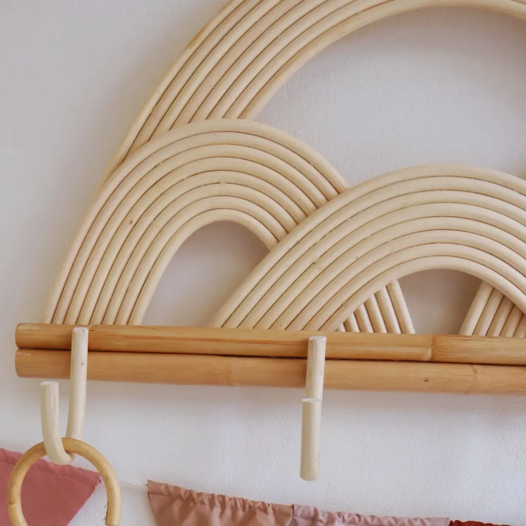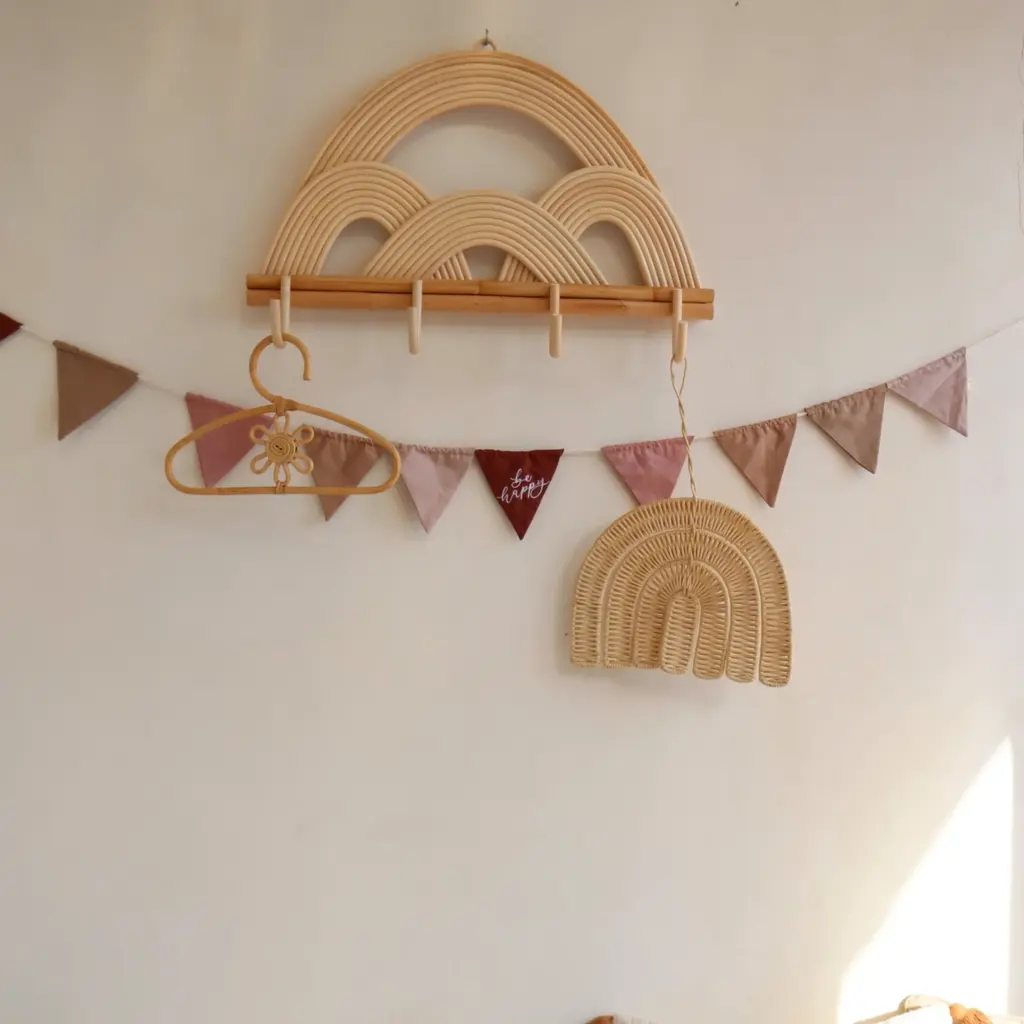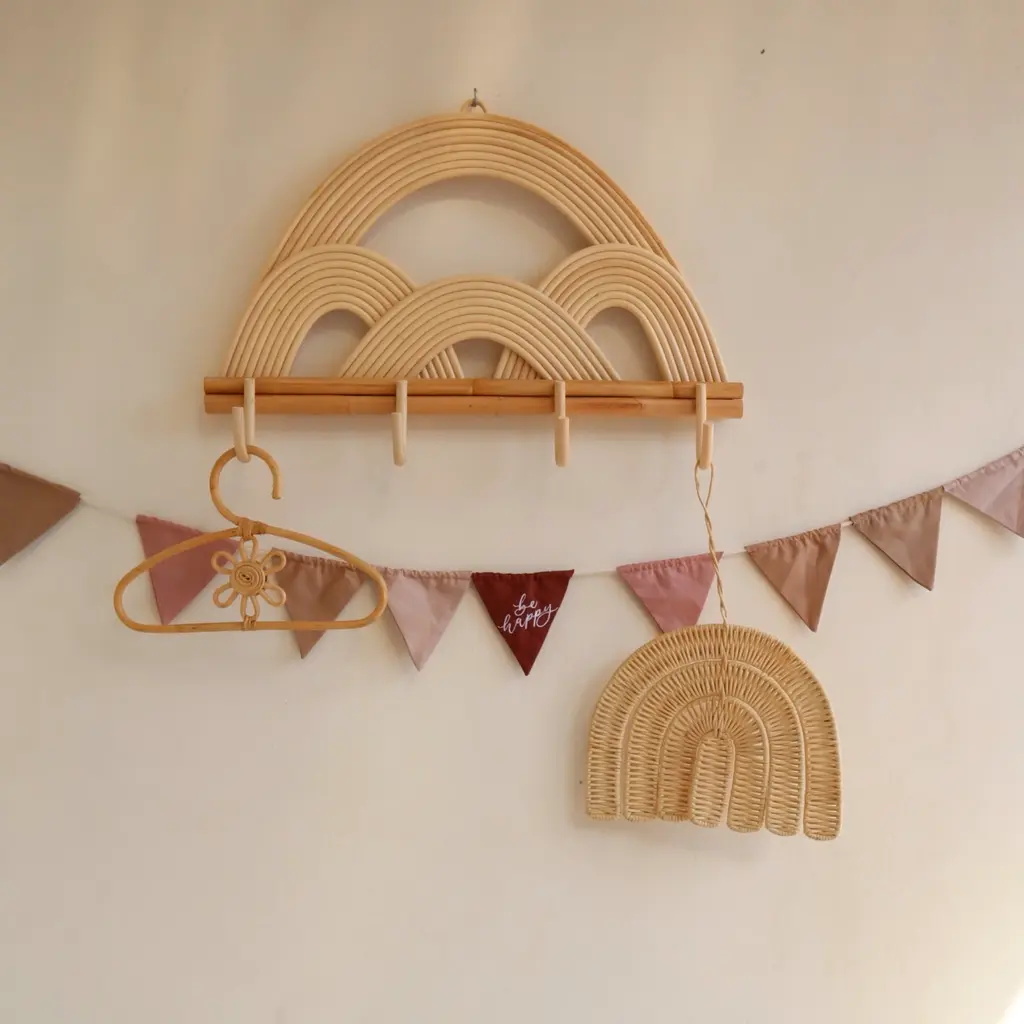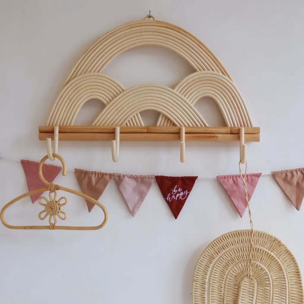 Add a nice rainbow-style touch to any of your rooms with our rattan rainbow wall hook. This rainbow hook is handcrafted by our artisan with quality natural rattan. The natural, unique rainbow shape will bring a smile to your face and offers a lovely touch of texture in any of your room's space.Lightweight and easy to hang.Featuring 4 hooks.Handcrafted in Bali.Due to the nature of rattan and the beauty of craftsmanship, each wall hook might have slight variations in color and size, making each piece unique. It is not considered a flaw.