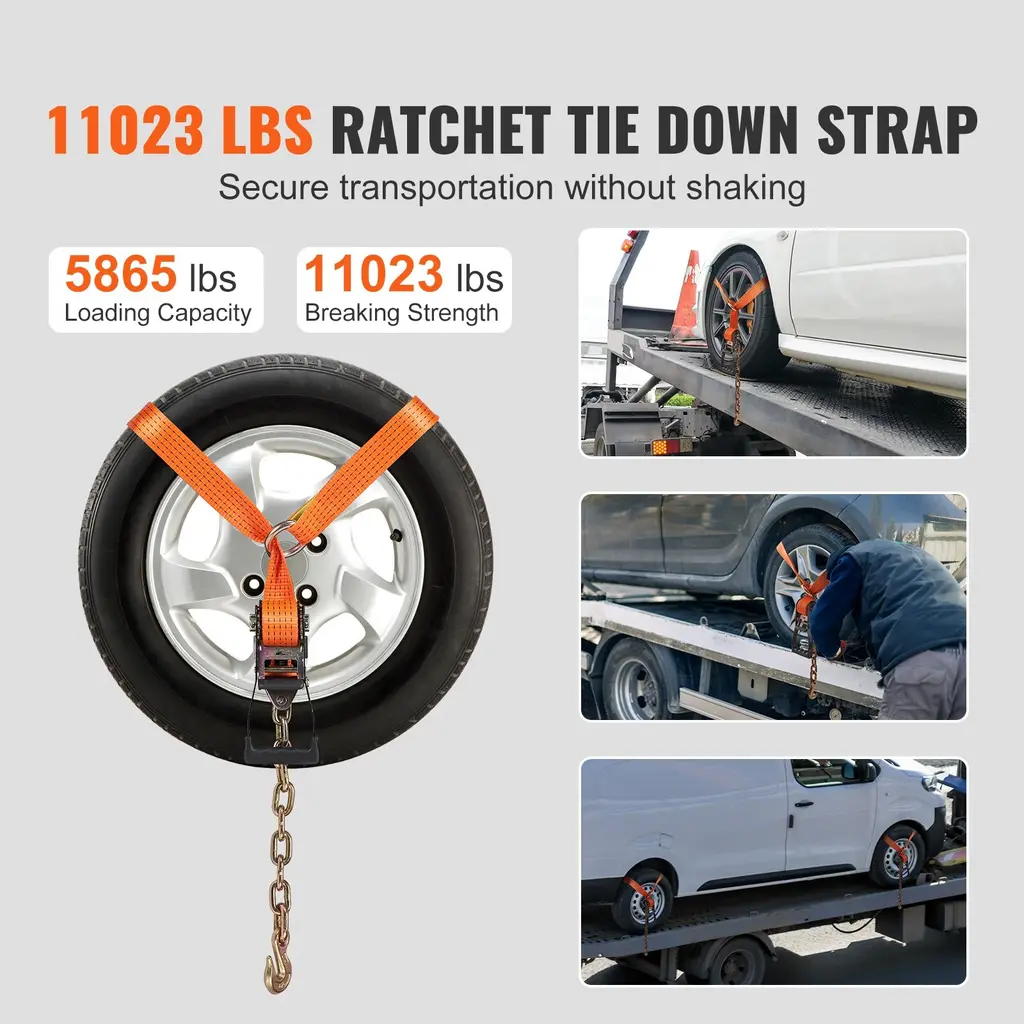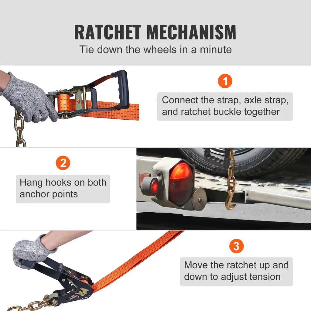 Stable and Secure Load: Our 2"×120" ratchet tie down straps are designed for heavy vehicle transportation, with a working load of 5,865 pounds (for Chain Hook option) / 5,512 pounds (for Snap Hook option) and maximum breaking strength of 11,023 pounds. Rest assured; your vehicles will be securely transported without any worries of shifting instability. Exceptional Durability: Crafted with industrial-grade polyester material, our tire straps are UV-resistant and wear-resistant, ensuring long-lasting performance. The protective wear pads also reduce strap, wheel, and vehicle damage. A smooth O-ring minimizes strap wear, while the metal ratchet prevents rust and corrosion, ensuring exceptional durability. Versatile Adaptability: With a length of 120 inches, the car tie down straps provide 20% more length than standard straps. This makes them suitable for securing vehicles such as UTVs, ATVs, pickup trucks, or SUVs to any trailer or flatbed. The chain hooks are compatible with most anchor points and fit for passenger cars, ATVs, motorcycles, vans, SUVs, and trailers. Effortless Operation: Simply connect the tire straps and ratchet buckle (and axle straps for with axle straps option). And attach the hooks to the anchor points after securing the wheels. The ratchet buckle allows for easy adjustment, and the molded handle provides excellent grip and comfort. The ratchet side is designed for easy operation with low clearance, preventing any scratches or damage to your vehicle's bottom. Multi-Scenario Application: These tie down straps are not limited to vehicle transportation alone. They are also a great helper for automobile, ATV, and off-road vehicle maintenance. Furthermore, they can be utilized for securing cargo on freight transports or ships, offering multi-scenario functionality. Package Content 4 x Ratchet+Chain Hook / Snap Hook 4 x Tire Straps 1 x Storage Bag 4 x Axle Straps (only for with axle straps option)