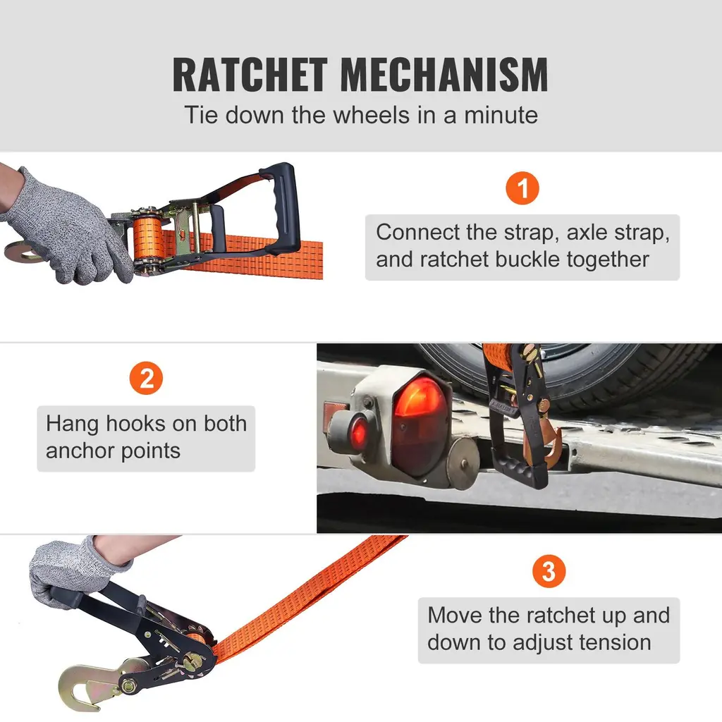 Stable and Secure Load: Our 2"×120" ratchet tie down straps are designed for heavy vehicle transportation, with a working load of 5,865 pounds (for Chain Hook option) / 5,512 pounds (for Snap Hook option) and maximum breaking strength of 11,023 pounds. Rest assured; your vehicles will be securely transported without any worries of shifting instability. Exceptional Durability: Crafted with industrial-grade polyester material, our tire straps are UV-resistant and wear-resistant, ensuring long-lasting performance. The protective wear pads also reduce strap, wheel, and vehicle damage. A smooth O-ring minimizes strap wear, while the metal ratchet prevents rust and corrosion, ensuring exceptional durability. Versatile Adaptability: With a length of 120 inches, the car tie down straps provide 20% more length than standard straps. This makes them suitable for securing vehicles such as UTVs, ATVs, pickup trucks, or SUVs to any trailer or flatbed. The chain hooks are compatible with most anchor points and fit for passenger cars, ATVs, motorcycles, vans, SUVs, and trailers. Effortless Operation: Simply connect the tire straps and ratchet buckle (and axle straps for with axle straps option). And attach the hooks to the anchor points after securing the wheels. The ratchet buckle allows for easy adjustment, and the molded handle provides excellent grip and comfort. The ratchet side is designed for easy operation with low clearance, preventing any scratches or damage to your vehicle's bottom. Multi-Scenario Application: These tie down straps are not limited to vehicle transportation alone. They are also a great helper for automobile, ATV, and off-road vehicle maintenance. Furthermore, they can be utilized for securing cargo on freight transports or ships, offering multi-scenario functionality. Package Content 4 x Ratchet+Chain Hook / Snap Hook 4 x Tire Straps 1 x Storage Bag 4 x Axle Straps (only for with axle straps option)