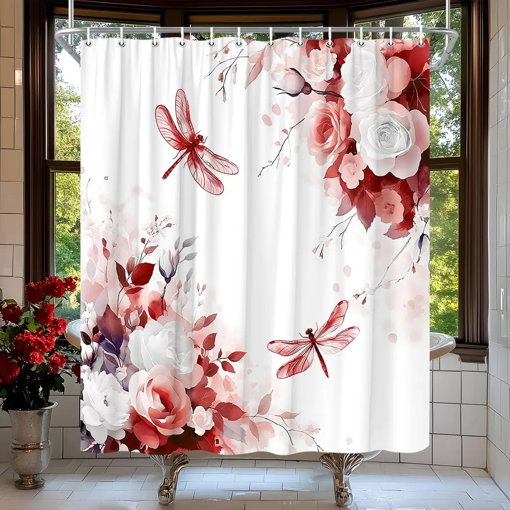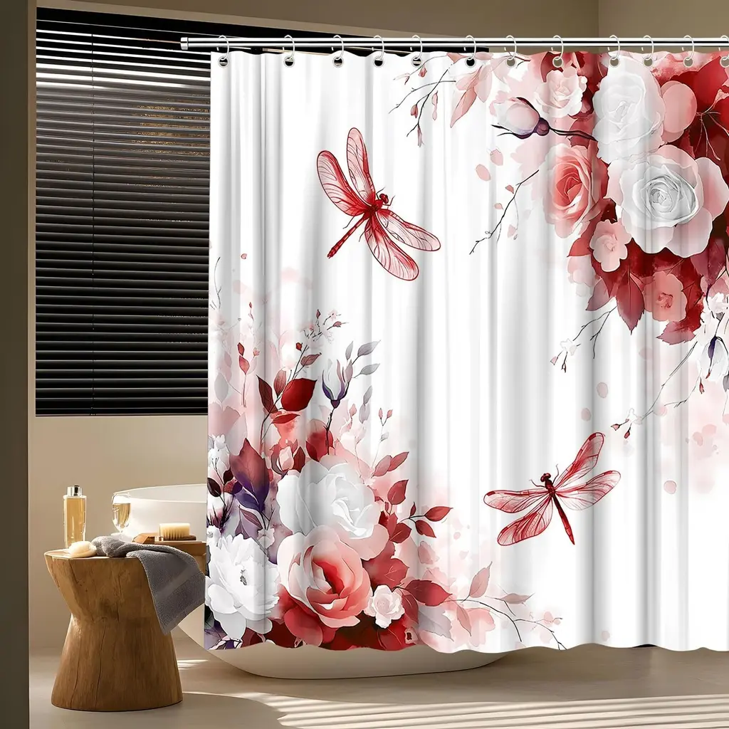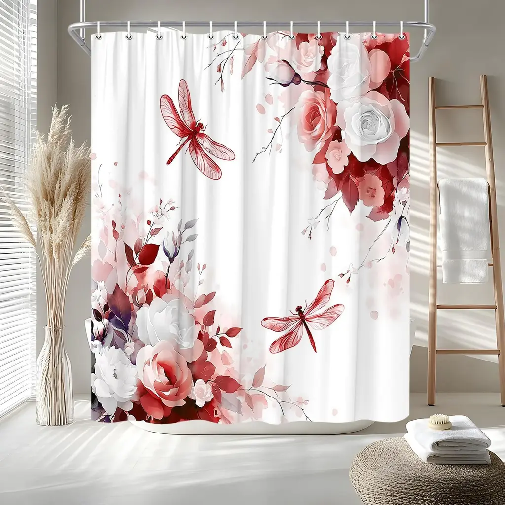 Red Flower Dragonfly Shower Curtain 70wx70l - Floral Design With Hooks - Multicolor