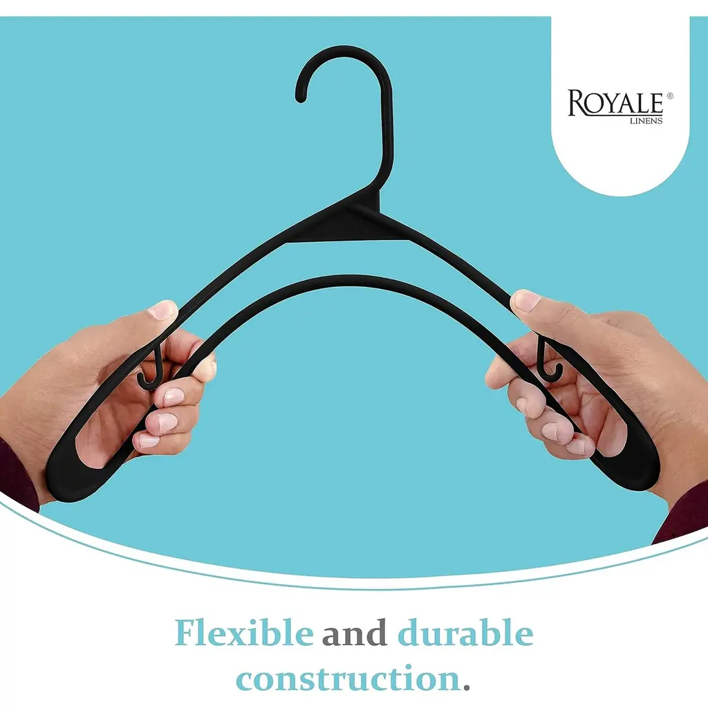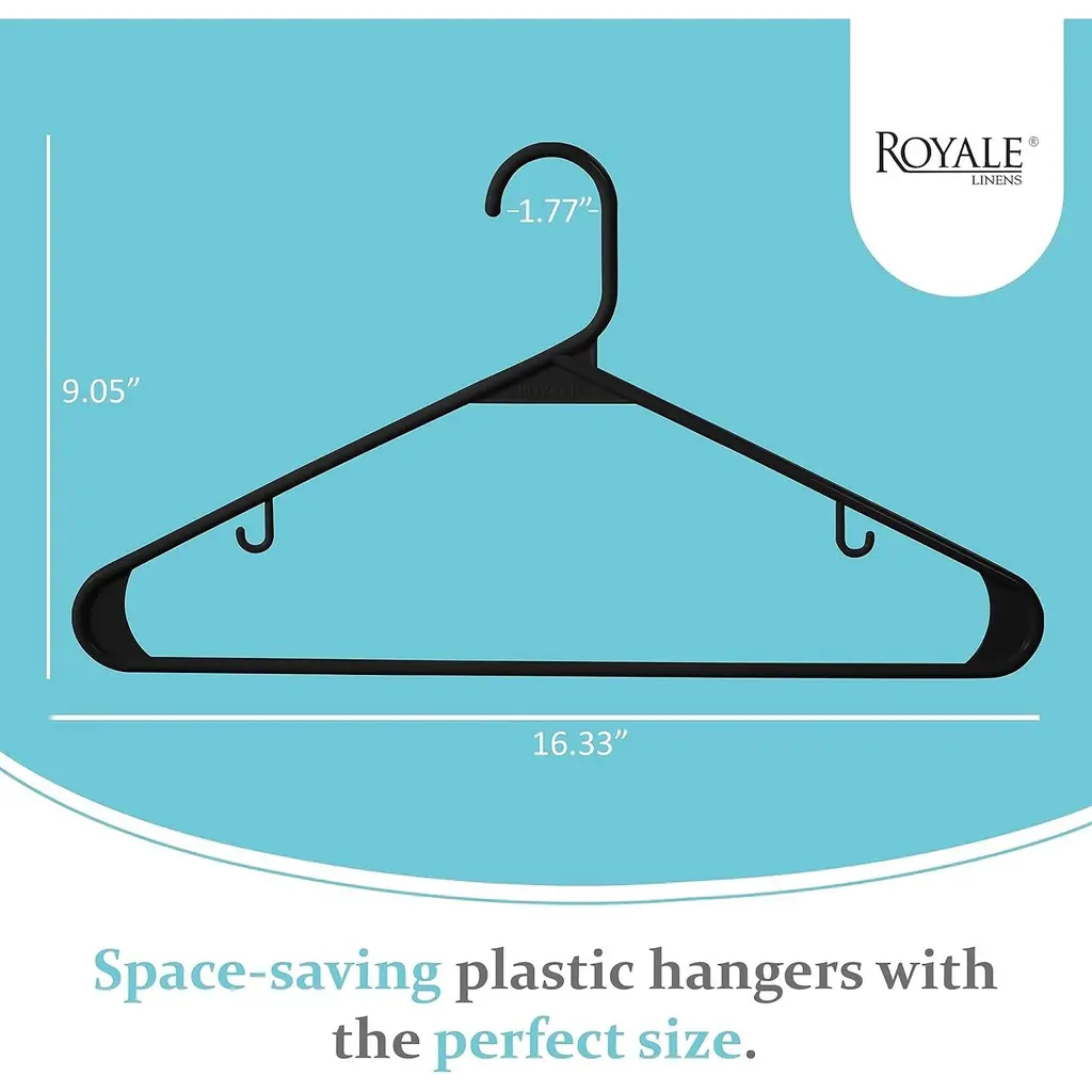 STURDY PLASTIC HANGER SET: Royale Black Plastic Hangers Are Designed For Everyday Use. These High-value Closet Hanger Is Made Of A Heavy Duty Plastic Material That Is Eco-friendly And Durable. Plastic Hangers Are Designed To Be Strong, Yet Flexible, The Unique Design Allows The Edges To Bend, And Stay Bent Without Breaking. SPACE SAVING CLOTHES HANGERS: Royale Premium Plastic Hanger Comes In A Slim And Sleek Design With Each Hanger Having A Standard Size Of 16.33 X 9.05 X0.26 Inch. Their Perfect Standard Dimensions Ensure That They Are Well-suited To Any Closet GREAT VALUE PACKS: Royale Plastic Clothes Hanger Are Available In Black, White, Grey, Blue, Red And Pink color. These Standard Hangers comes in a great value pack of 20, 40 and 60. Perfect for daily use. Buy in bulk & always be prepared for that spontaneous guest or successful shopping spree! Fabric Friendly & Smooth Edges: Plastic Hangers Features Clean And Smooth Finish. No Color Transfer From The Hangers Means That They Do Not Stain Your Clothes. Smooth Body Ensures That No Sharp Corners Will Rip Your Clothing Or Leaving A Unwanted Creases Or Marks On Your Clothes.. BUILT-IN HOOKS: Royale Hook Hangers Are Designed With Hooks, These Nonslip Hangers Are Great For Hanging Ties, Belts, Shawls, Thin Strap Shirts, Tanks And Women Undergarments Such As Bras, Nightgowns, And Camisoles. These Are Ideal For Gripping Delicate Items Such As Shirts, Blouses, T-shirts, Dresses, As Well As Hanging Heavy Garments Such As Jackets, Suits, And Coats.