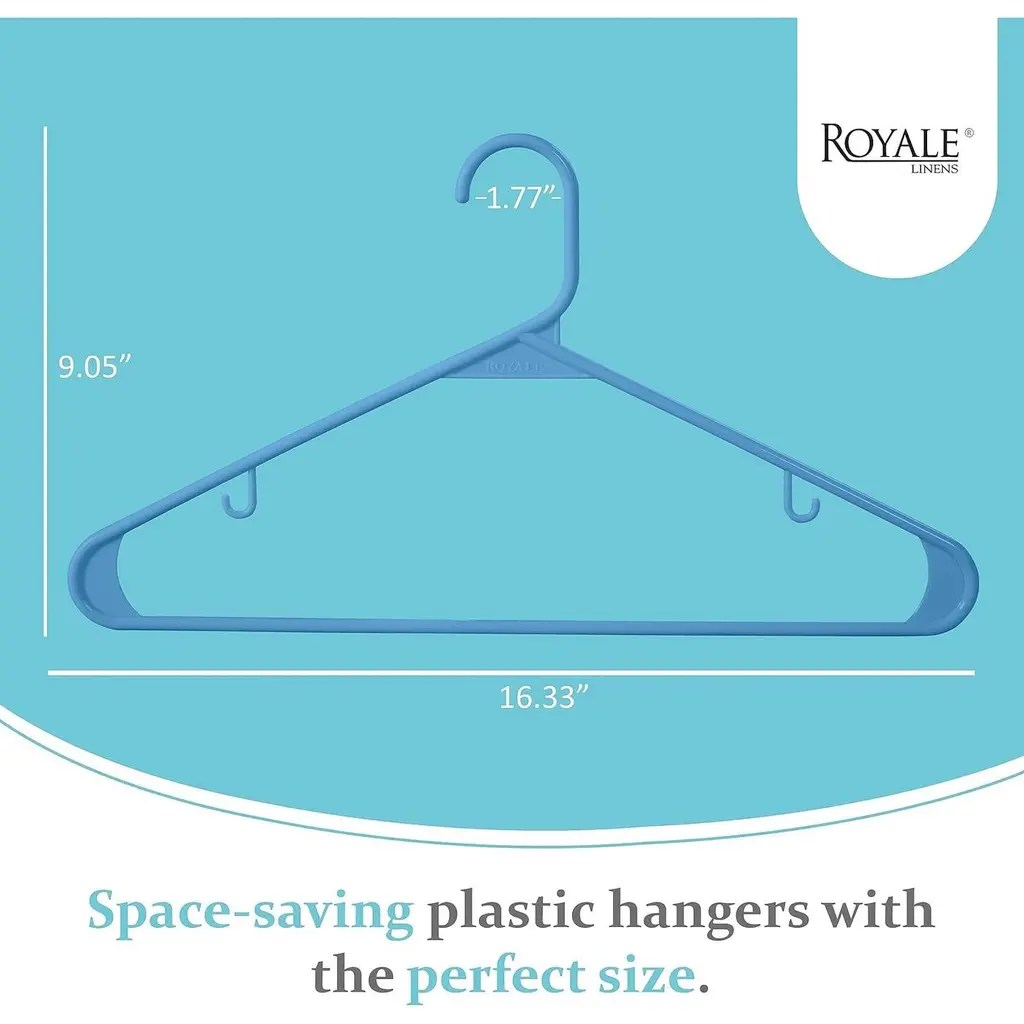 STURDY PLASTIC HANGER SET: Royale Black Plastic Hangers Are Designed For Everyday Use. These High-value Closet Hanger Is Made Of A Heavy Duty Plastic Material That Is Eco-friendly And Durable. Plastic Hangers Are Designed To Be Strong, Yet Flexible, The Unique Design Allows The Edges To Bend, And Stay Bent Without Breaking. SPACE SAVING CLOTHES HANGERS: Royale Premium Plastic Hanger Comes In A Slim And Sleek Design With Each Hanger Having A Standard Size Of 16.33 X 9.05 X0.26 Inch. Their Perfect Standard Dimensions Ensure That They Are Well-suited To Any Closet GREAT VALUE PACKS: Royale Plastic Clothes Hanger Are Available In Black, White, Grey, Blue, Red And Pink color. These Standard Hangers comes in a great value pack of 20, 40 and 60. Perfect for daily use. Buy in bulk & always be prepared for that spontaneous guest or successful shopping spree! Fabric Friendly & Smooth Edges: Plastic Hangers Features Clean And Smooth Finish. No Color Transfer From The Hangers Means That They Do Not Stain Your Clothes. Smooth Body Ensures That No Sharp Corners Will Rip Your Clothing Or Leaving A Unwanted Creases Or Marks On Your Clothes.. BUILT-IN HOOKS: Royale Hook Hangers Are Designed With Hooks, These Nonslip Hangers Are Great For Hanging Ties, Belts, Shawls, Thin Strap Shirts, Tanks And Women Undergarments Such As Bras, Nightgowns, And Camisoles. These Are Ideal For Gripping Delicate Items Such As Shirts, Blouses, T-shirts, Dresses, As Well As Hanging Heavy Garments Such As Jackets, Suits, And Coats.