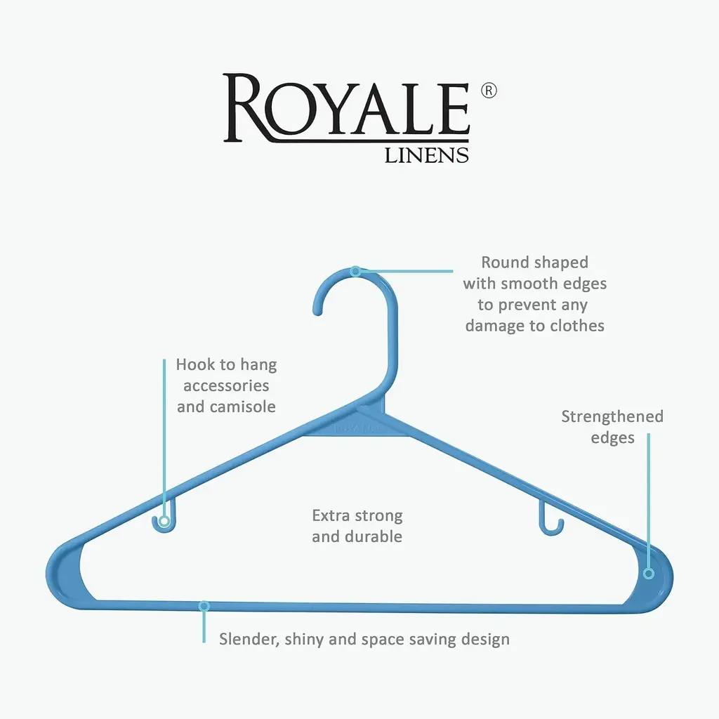 STURDY PLASTIC HANGER SET: Royale Black Plastic Hangers Are Designed For Everyday Use. These High-value Closet Hanger Is Made Of A Heavy Duty Plastic Material That Is Eco-friendly And Durable. Plastic Hangers Are Designed To Be Strong, Yet Flexible, The Unique Design Allows The Edges To Bend, And Stay Bent Without Breaking. SPACE SAVING CLOTHES HANGERS: Royale Premium Plastic Hanger Comes In A Slim And Sleek Design With Each Hanger Having A Standard Size Of 16.33 X 9.05 X0.26 Inch. Their Perfect Standard Dimensions Ensure That They Are Well-suited To Any Closet GREAT VALUE PACKS: Royale Plastic Clothes Hanger Are Available In Black, White, Grey, Blue, Red And Pink color. These Standard Hangers comes in a great value pack of 20, 40 and 60. Perfect for daily use. Buy in bulk & always be prepared for that spontaneous guest or successful shopping spree! Fabric Friendly & Smooth Edges: Plastic Hangers Features Clean And Smooth Finish. No Color Transfer From The Hangers Means That They Do Not Stain Your Clothes. Smooth Body Ensures That No Sharp Corners Will Rip Your Clothing Or Leaving A Unwanted Creases Or Marks On Your Clothes.. BUILT-IN HOOKS: Royale Hook Hangers Are Designed With Hooks, These Nonslip Hangers Are Great For Hanging Ties, Belts, Shawls, Thin Strap Shirts, Tanks And Women Undergarments Such As Bras, Nightgowns, And Camisoles. These Are Ideal For Gripping Delicate Items Such As Shirts, Blouses, T-shirts, Dresses, As Well As Hanging Heavy Garments Such As Jackets, Suits, And Coats.