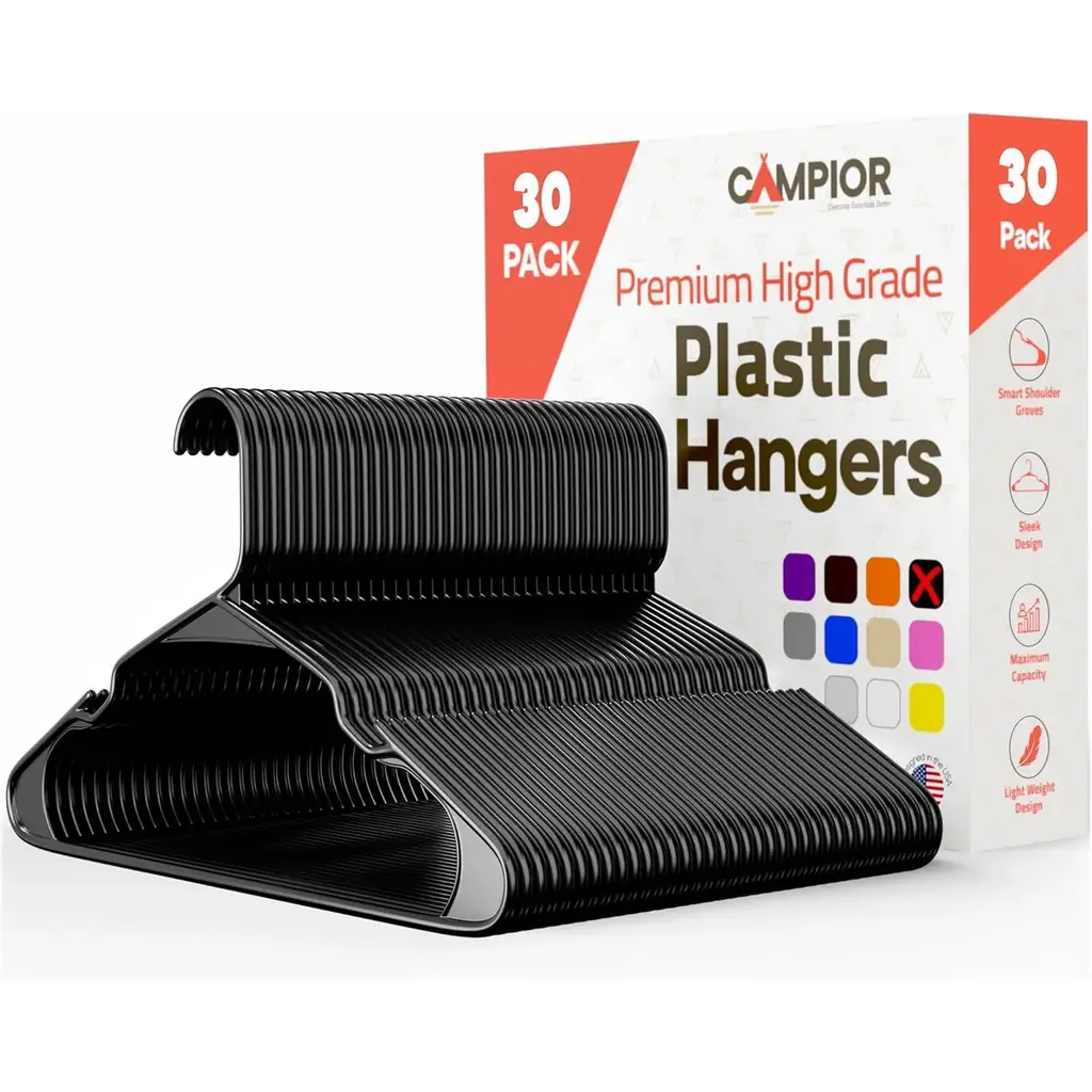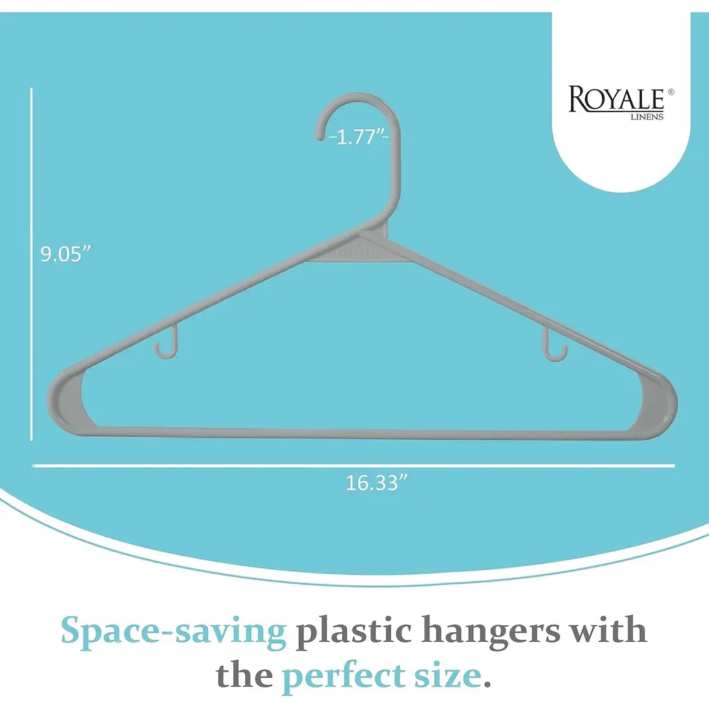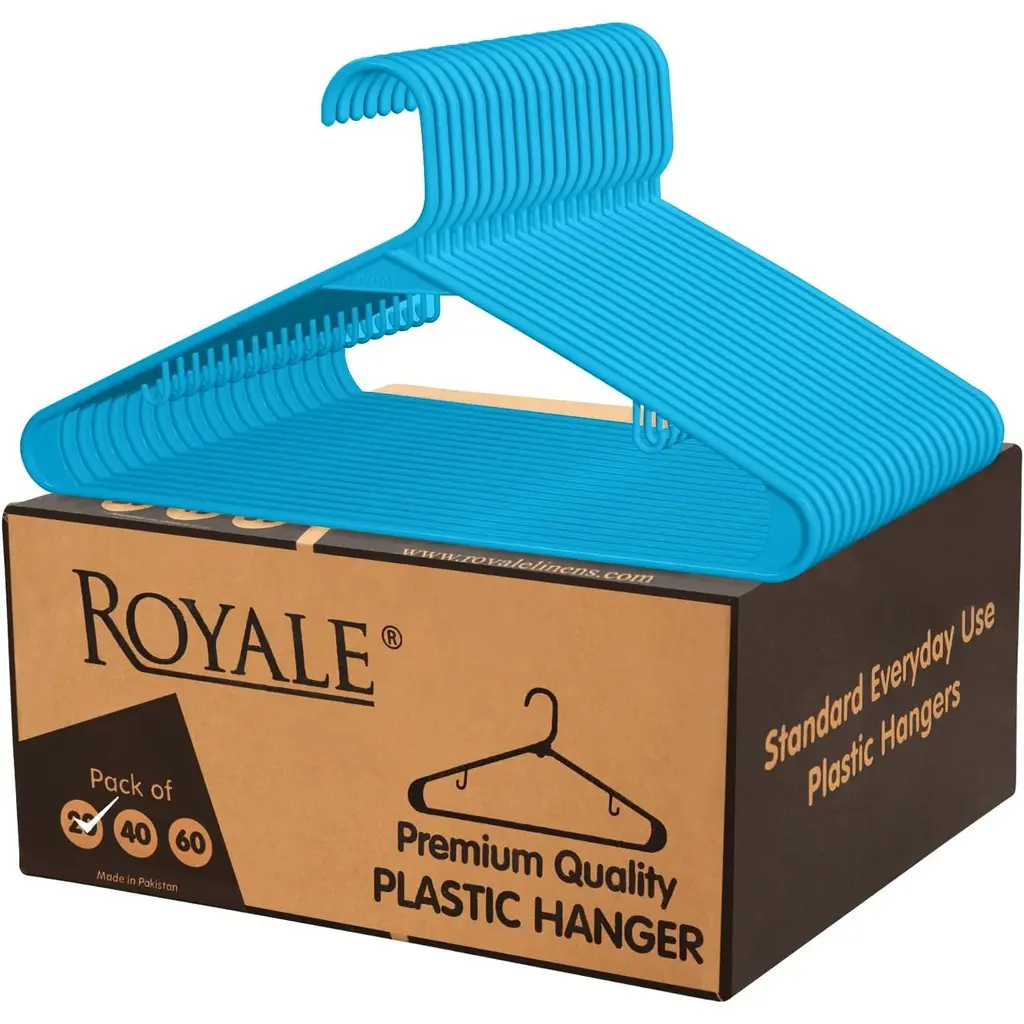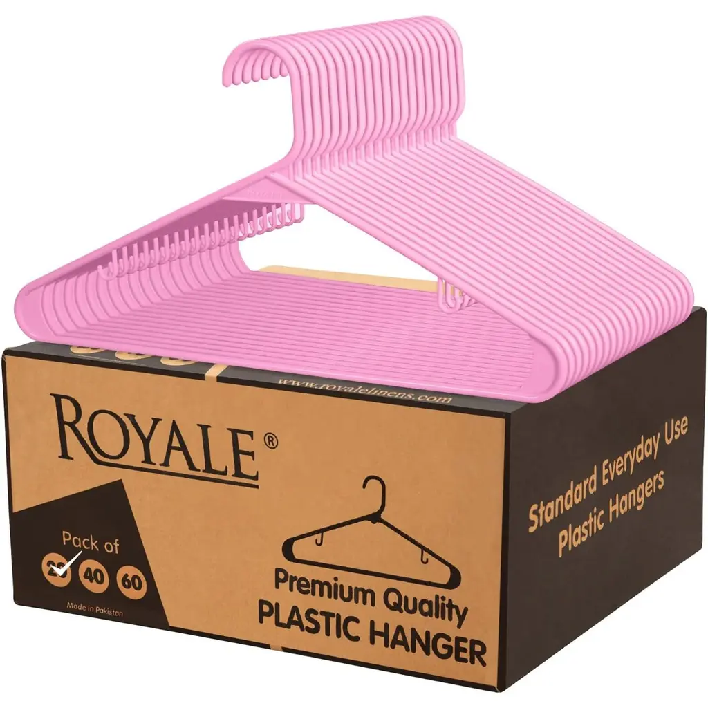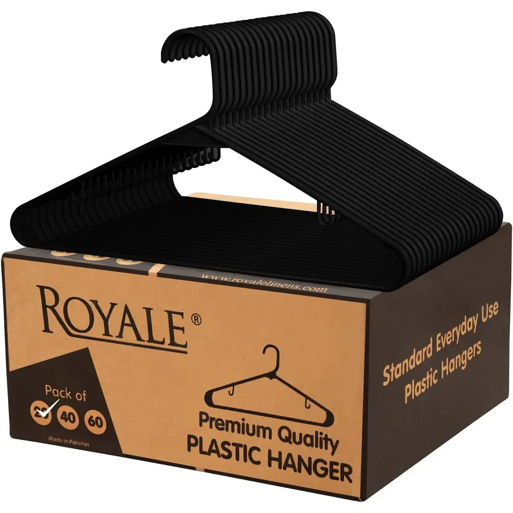 STURDY PLASTIC HANGER SET: Royale Black Plastic Hangers Are Designed For Everyday Use. These High-value Closet Hanger Is Made Of A Heavy Duty Plastic Material That Is Eco-friendly And Durable. Plastic Hangers Are Designed To Be Strong, Yet Flexible, The Unique Design Allows The Edges To Bend, And Stay Bent Without Breaking. SPACE SAVING CLOTHES HANGERS: Royale Premium Plastic Hanger Comes In A Slim And Sleek Design With Each Hanger Having A Standard Size Of 16.33 X 9.05 X0.26 Inch. Their Perfect Standard Dimensions Ensure That They Are Well-suited To Any Closet GREAT VALUE PACKS: Royale Plastic Clothes Hanger Are Available In Black, White, Grey, Blue, Red And Pink color. These Standard Hangers comes in a great value pack of 20, 40 and 60. Perfect for daily use. Buy in bulk & always be prepared for that spontaneous guest or successful shopping spree! Fabric Friendly & Smooth Edges: Plastic Hangers Features Clean And Smooth Finish. No Color Transfer From The Hangers Means That They Do Not Stain Your Clothes. Smooth Body Ensures That No Sharp Corners Will Rip Your Clothing Or Leaving A Unwanted Creases Or Marks On Your Clothes.. BUILT-IN HOOKS: Royale Hook Hangers Are Designed With Hooks, These Nonslip Hangers Are Great For Hanging Ties, Belts, Shawls, Thin Strap Shirts, Tanks And Women Undergarments Such As Bras, Nightgowns, And Camisoles. These Are Ideal For Gripping Delicate Items Such As Shirts, Blouses, T-shirts, Dresses, As Well As Hanging Heavy Garments Such As Jackets, Suits, And Coats.