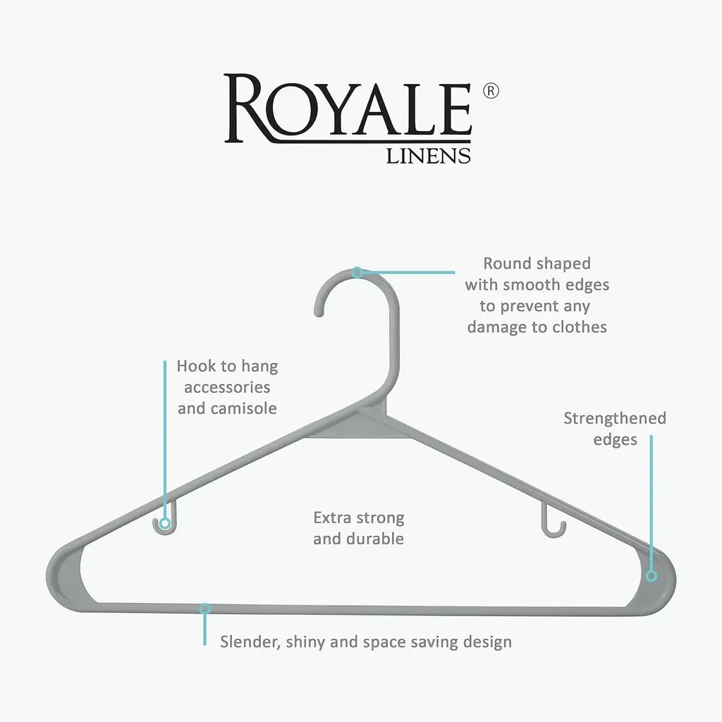 STURDY PLASTIC HANGER SET: Royale Black Plastic Hangers Are Designed For Everyday Use. These High-value Closet Hanger Is Made Of A Heavy Duty Plastic Material That Is Eco-friendly And Durable. Plastic Hangers Are Designed To Be Strong, Yet Flexible, The Unique Design Allows The Edges To Bend, And Stay Bent Without Breaking. SPACE SAVING CLOTHES HANGERS: Royale Premium Plastic Hanger Comes In A Slim And Sleek Design With Each Hanger Having A Standard Size Of 16.33 X 9.05 X0.26 Inch. Their Perfect Standard Dimensions Ensure That They Are Well-suited To Any Closet GREAT VALUE PACKS: Royale Plastic Clothes Hanger Are Available In Black, White, Grey, Blue, Red And Pink color. These Standard Hangers comes in a great value pack of 20, 40 and 60. Perfect for daily use. Buy in bulk & always be prepared for that spontaneous guest or successful shopping spree! Fabric Friendly & Smooth Edges: Plastic Hangers Features Clean And Smooth Finish. No Color Transfer From The Hangers Means That They Do Not Stain Your Clothes. Smooth Body Ensures That No Sharp Corners Will Rip Your Clothing Or Leaving A Unwanted Creases Or Marks On Your Clothes.. BUILT-IN HOOKS: Royale Hook Hangers Are Designed With Hooks, These Nonslip Hangers Are Great For Hanging Ties, Belts, Shawls, Thin Strap Shirts, Tanks And Women Undergarments Such As Bras, Nightgowns, And Camisoles. These Are Ideal For Gripping Delicate Items Such As Shirts, Blouses, T-shirts, Dresses, As Well As Hanging Heavy Garments Such As Jackets, Suits, And Coats.