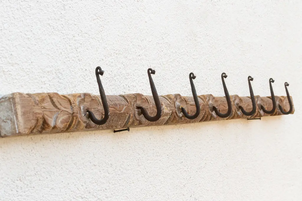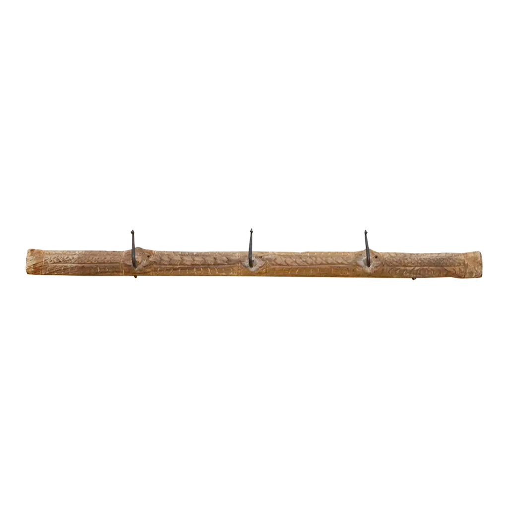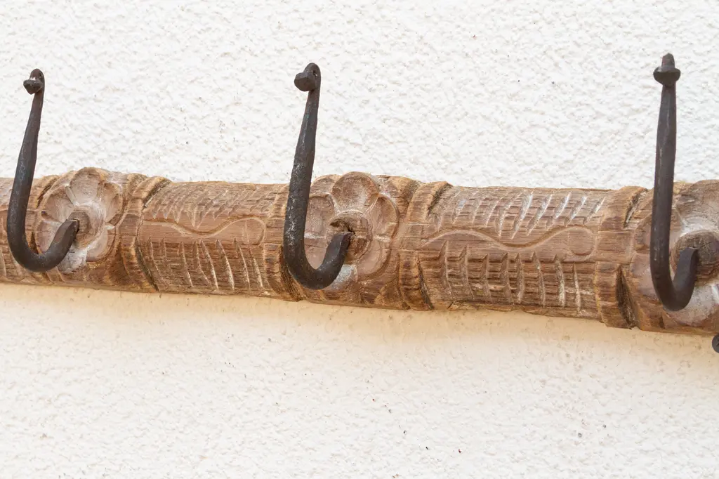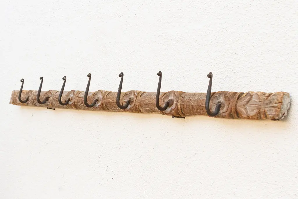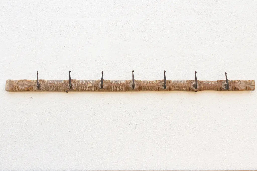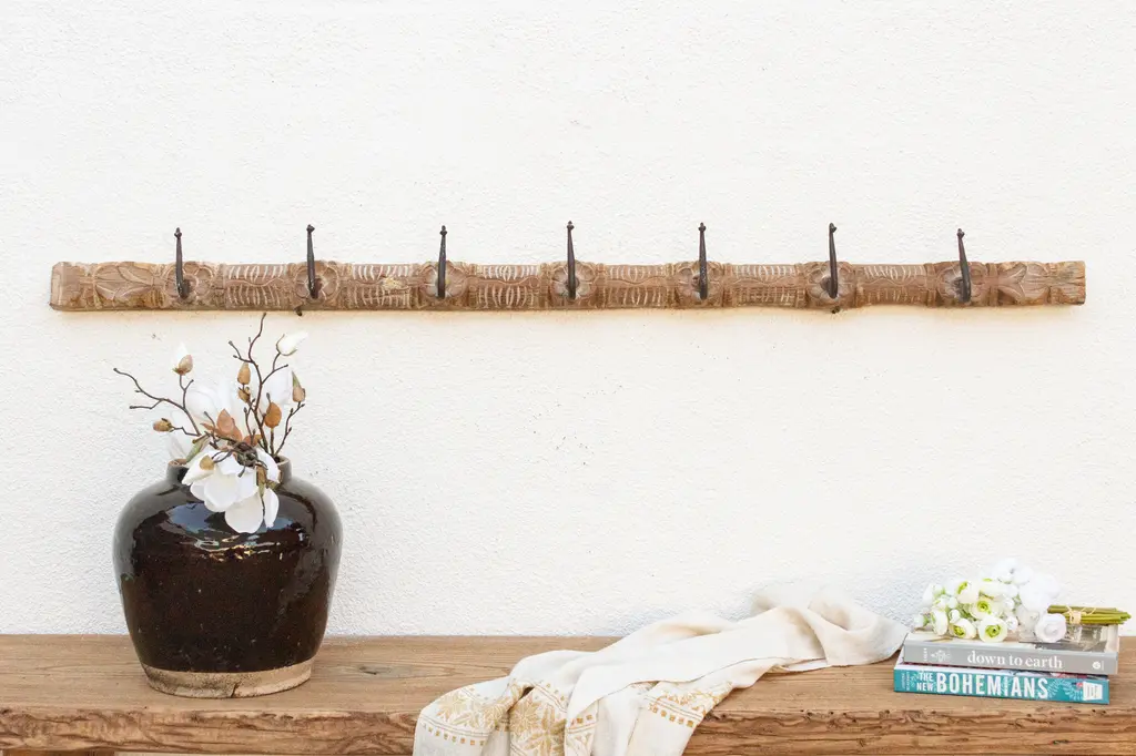 Add a touch of rustic charm to your home with this unique wall hook. Crafted from an antique southern Indian door lintel, this charming hook features carved lotus flowers and multiple iron hooks. The bleached wood patina on this carved wall panels adds a vintage aesthetic, while the carved details create a one-of-a-kind piece. Shows cracks and blemishes. Use this functional and decorative hook as wall art in your entryway to evoke a farmhouse or cabin style.