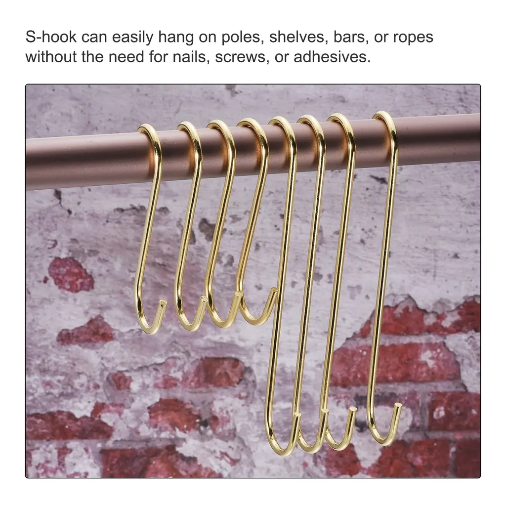 [What You Get] - You will get 8pcs gold tone S shape hanging hooks which fits max 32mm pole: Length: 400mm/ 15.75inch; Thickness: 5mm/ 0.2inch; Opening Diameter: 32mm/ 1.26inch[Material & Design] - These metal hooks are made of carbon steel with a smooth painted surface, sturdy and durable, not easy to get rust or erosion.Designed with S shapes streamlined and extra-long, integrally formed, it can withstand lots of force without deformation or rupture[Easy to Use] - Good organizing tool. S-hook can easily hang on poles, shelves, bars, or ropes without the need for nails, screws, or adhesives. You can hang heavy objects without worrying about them falling[Multiple Use Tool] - These S hooks can be used on different occasions indoor or outdoor like kitchen, garden, bathroom, closet, garage, home or office, and more. They are not limited to applying in a specific area. You can hang kitchen utensils, bath supplies, plants, clothes, shoes and so on which is convenient and saves space[Note] - Its load-bearing limit is approximately up to 30 kg/ 66lb. Please confirm the size of the hook and ensure the applying places before buyingFeatures:Well Material - These metal hooks are made of carbon steel with a smooth painted surface, sturdy and durable, not easy to get rust or erosion.S Shape Design - Designed with S shapes streamlined and extra-long, integrally formed, it can withstand lots of force without deformation or rupture.Efficient Storage Solution - These S hooks are a simple and brilliant storage solution for hanging anything. Good organizing or decorating tool.Easy to Use - S-hook can easily hang on poles, shelves, bars, or ropes without the need for nails, screws, or adhesives. You can hang heavy objects without worrying about them falling.Multi-purposed:These S hooks can be used on different occasions indoor or outdoor like kitchen, garden, bathroom, closet, garage, workshop, home or office, and more. They are not limited to applying in a specific area.Application:They can be used for a number of things: You can use it to hang kitchen utensils, spoons, pots, or cups in the kitchen; You can hang towels, brushes, clothes, or other tools in your bathroom; You can hang flower pots, plants, or gardening tools in the garden; You can also hang clothes, shoes in the closet; In the garage for organizing tools.Note:Please confirm the size of the hook and ensure the applying places before buying.Specification:Color: Gold ToneMaterial: Carbon SteelLength: 400mm/ 15.75inchThickness: 5mm/ 0.2inchOpening Diameter: 32mm/ 1.26inchPackage Content:8 x Metal S Hooks