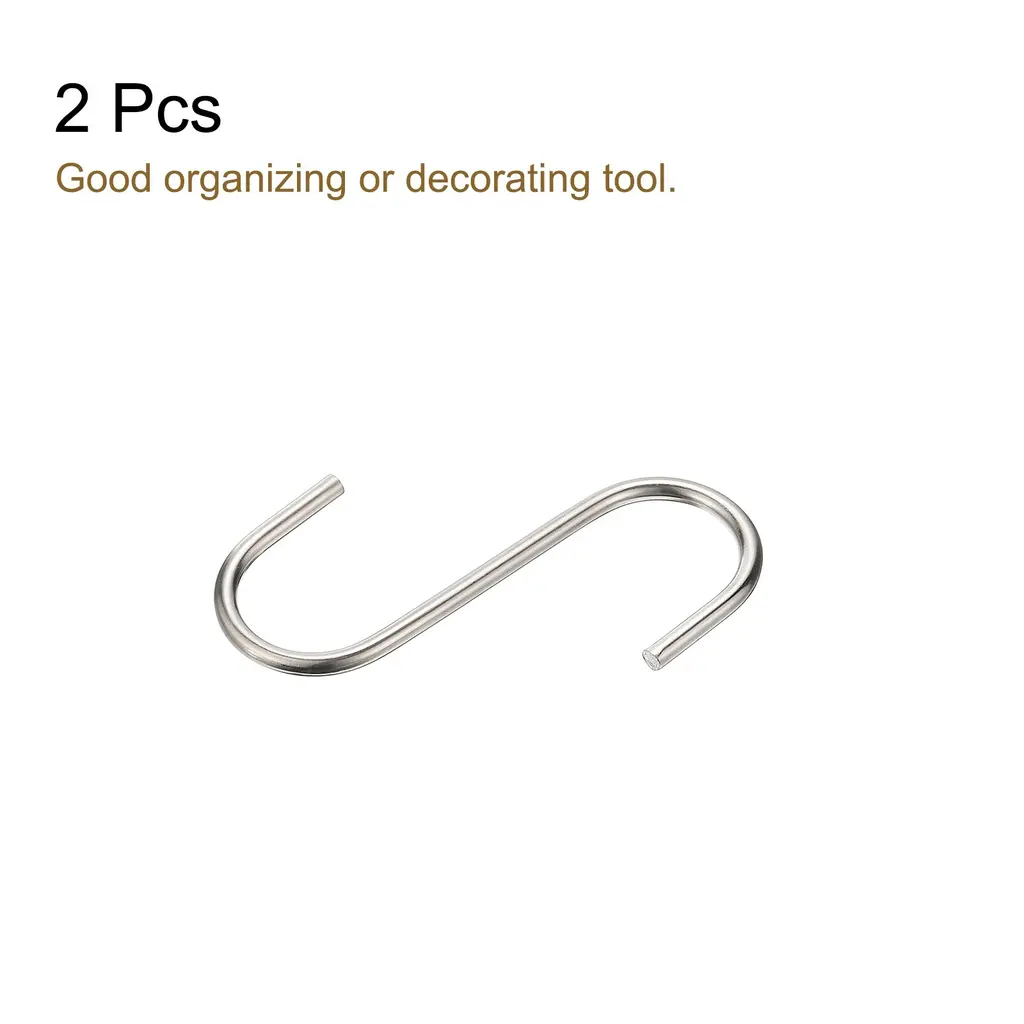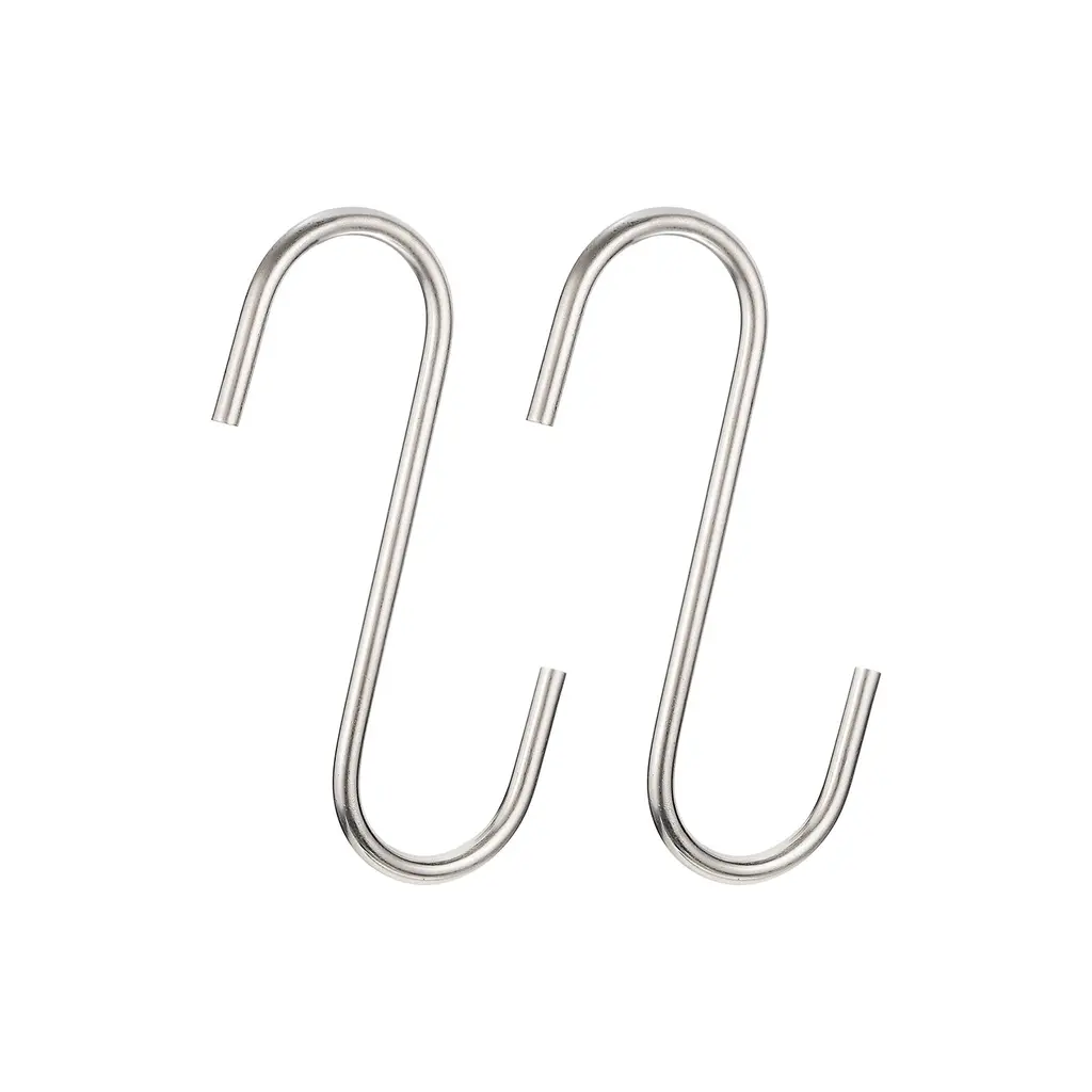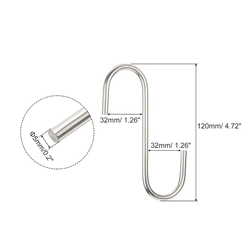 [What You Get] - You will get 2pcs matt silver S shape hanging hooks which fits max 32mm pole: Length: 120mm/ 4.72inch; Thickness: 5mm/ 0.2inch; Opening Diameter: 32mm/ 1.26inch[Material & Design] - These metal hooks are made of carbon steel with a smooth painted surface, sturdy and durable, not easy to get rust or erosion.Designed with S shapes streamlined and extra-long, integrally formed, it can withstand lots of force without deformation or rupture[Easy to Use] - Good organizing tool. S-hook can easily hang on poles, shelves, bars, or ropes without the need for nails, screws, or adhesives. You can hang heavy objects without worrying about them falling[Multiple Use Tool] - These S hooks can be used on different occasions indoor or outdoor like kitchen, garden, bathroom, closet, garage, home or office, and more. They are not limited to applying in a specific area. You can hang kitchen utensils, bath supplies, plants, clothes, shoes and so on which is convenient and saves space[Note] - Its load-bearing limit is approximately up to 30 kg/ 66lb. Please confirm the size of the hook and ensure the applying places before buyingFeatures:Well Material - These metal hooks are made of carbon steel with a smooth painted surface, sturdy and durable, not easy to get rust or erosion.S Shape Design - Designed with S shapes streamlined and extra-long, integrally formed, it can withstand lots of force without deformation or rupture.Efficient Storage Solution - These S hooks are a simple and brilliant storage solution for hanging anything. Good organizing or decorating tool.Easy to Use - S-hook can easily hang on poles, shelves, bars, or ropes without the need for nails, screws, or adhesives. You can hang heavy objects without worrying about them falling.Multi-purposed:These S hooks can be used on different occasions indoor or outdoor like kitchen, garden, bathroom, closet, garage, workshop, home or office, and more. They are not limited to applying in a specific area.Application:They can be used for a number of things: You can use it to hang kitchen utensils, spoons, pots, or cups in the kitchen; You can hang towels, brushes, clothes, or other tools in your bathroom; You can hang flower pots, plants, or gardening tools in the garden; You can also hang clothes, shoes in the closet; In the garage for organizing tools.Note:Please confirm the size of the hook and ensure the applying places before buying.Specification:Color: Matt SilverMaterial: Carbon SteelLength: 120mm/ 4.72inchThickness: 5mm/ 0.2inchOpening Diameter: 32mm/ 1.26inchPackage Content:2 x Metal S Hooks