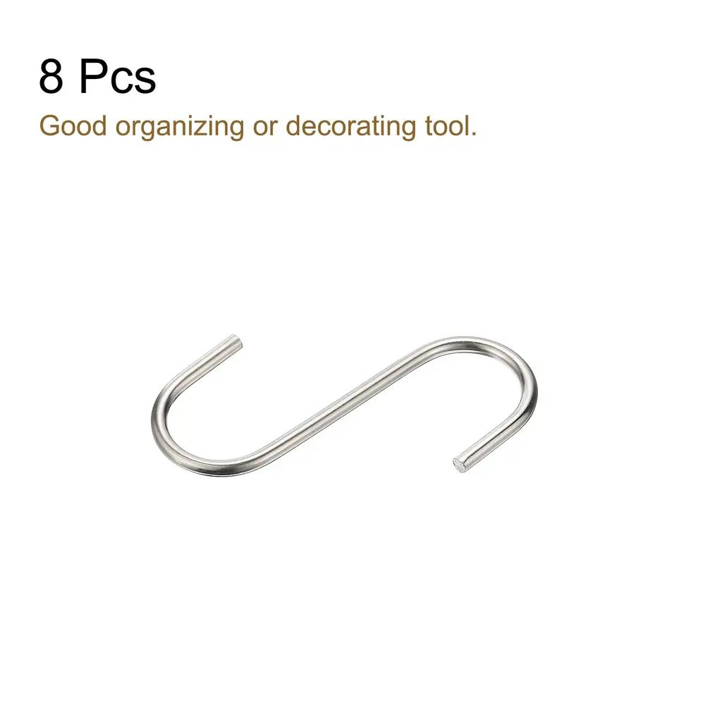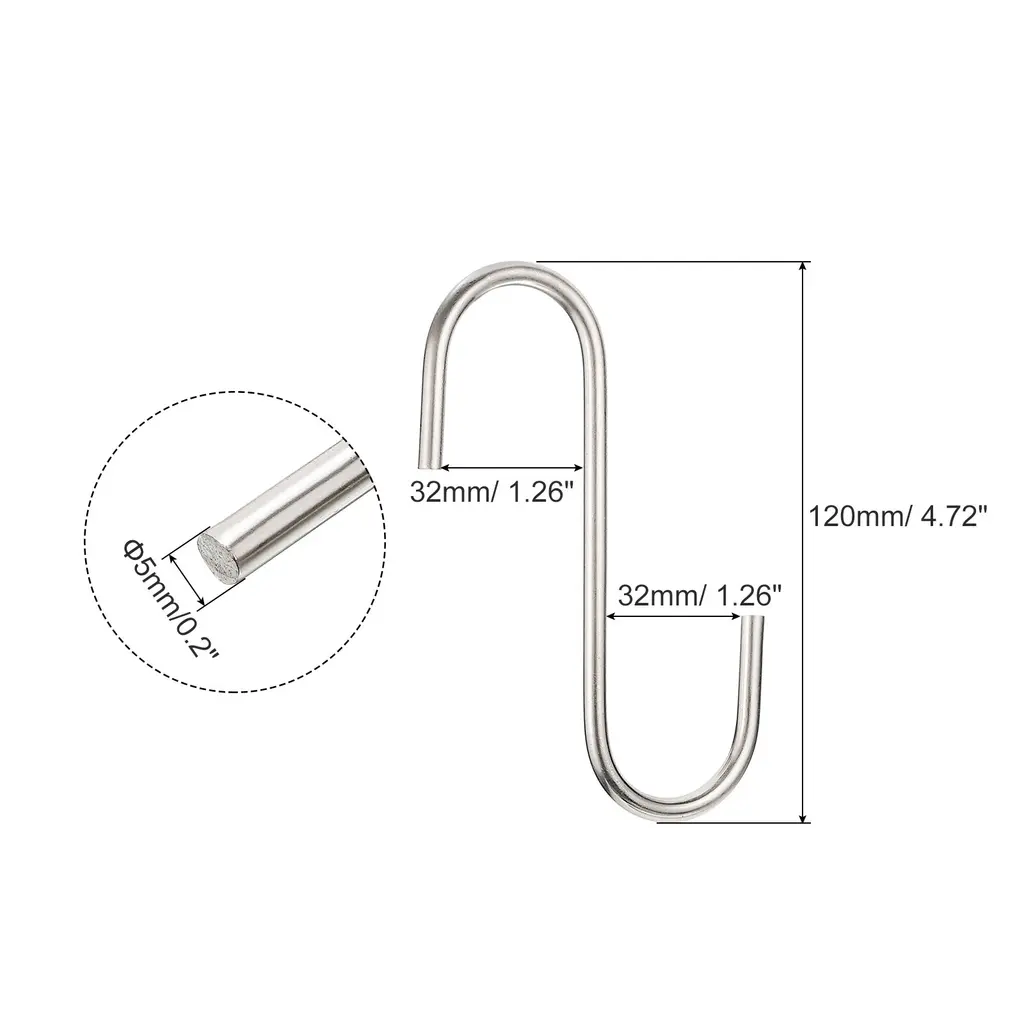 [What You Get] - You will get 8pcs matt silver S shape hanging hooks which fits max 32mm pole: Length: 120mm/ 4.72inch; Thickness: 5mm/ 0.2inch; Opening Diameter: 32mm/ 1.26inch[Material & Design] - These metal hooks are made of carbon steel with a smooth painted surface, sturdy and durable, not easy to get rust or erosion.Designed with S shapes streamlined and extra-long, integrally formed, it can withstand lots of force without deformation or rupture[Easy to Use] - Good organizing tool. S-hook can easily hang on poles, shelves, bars, or ropes without the need for nails, screws, or adhesives. You can hang heavy objects without worrying about them falling[Multiple Use Tool] - These S hooks can be used on different occasions indoor or outdoor like kitchen, garden, bathroom, closet, garage, home or office, and more. They are not limited to applying in a specific area. You can hang kitchen utensils, bath supplies, plants, clothes, shoes and so on which is convenient and saves space[Note] - Its load-bearing limit is approximately up to 30 kg/ 66lb. Please confirm the size of the hook and ensure the applying places before buyingFeatures:Well Material - These metal hooks are made of carbon steel with a smooth painted surface, sturdy and durable, not easy to get rust or erosion.S Shape Design - Designed with S shapes streamlined and extra-long, integrally formed, it can withstand lots of force without deformation or rupture.Efficient Storage Solution - These S hooks are a simple and brilliant storage solution for hanging anything. Good organizing or decorating tool.Easy to Use - S-hook can easily hang on poles, shelves, bars, or ropes without the need for nails, screws, or adhesives. You can hang heavy objects without worrying about them falling.Multi-purposed:These S hooks can be used on different occasions indoor or outdoor like kitchen, garden, bathroom, closet, garage, workshop, home or office, and more. They are not limited to applying in a specific area.Application:They can be used for a number of things: You can use it to hang kitchen utensils, spoons, pots, or cups in the kitchen; You can hang towels, brushes, clothes, or other tools in your bathroom; You can hang flower pots, plants, or gardening tools in the garden; You can also hang clothes, shoes in the closet; In the garage for organizing tools.Note:Please confirm the size of the hook and ensure the applying places before buying.Specification:Color: Matt SilverMaterial: Carbon SteelLength: 120mm/ 4.72inchThickness: 5mm/ 0.2inchOpening Diameter: 32mm/ 1.26inchPackage Content:8 x Metal S Hooks