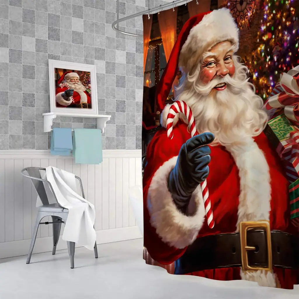 Santa Claus Shower Curtain 72x72, Red Christmas Bath Decor With Hooks - Multicolor