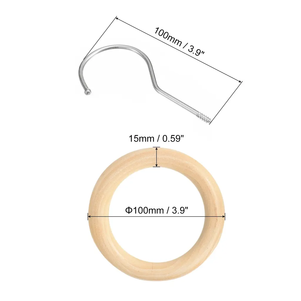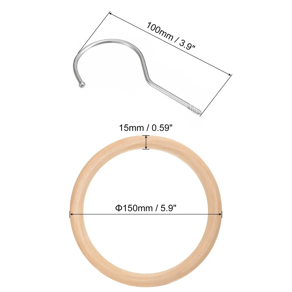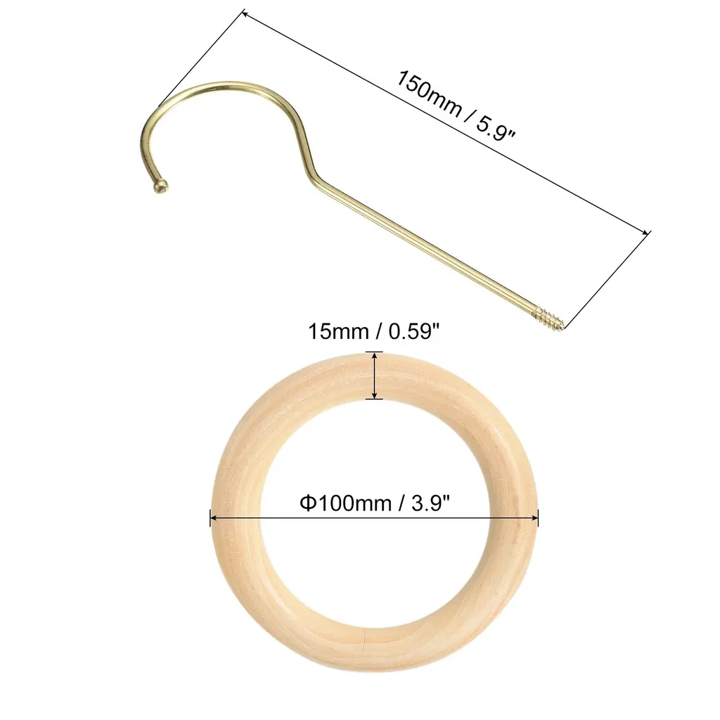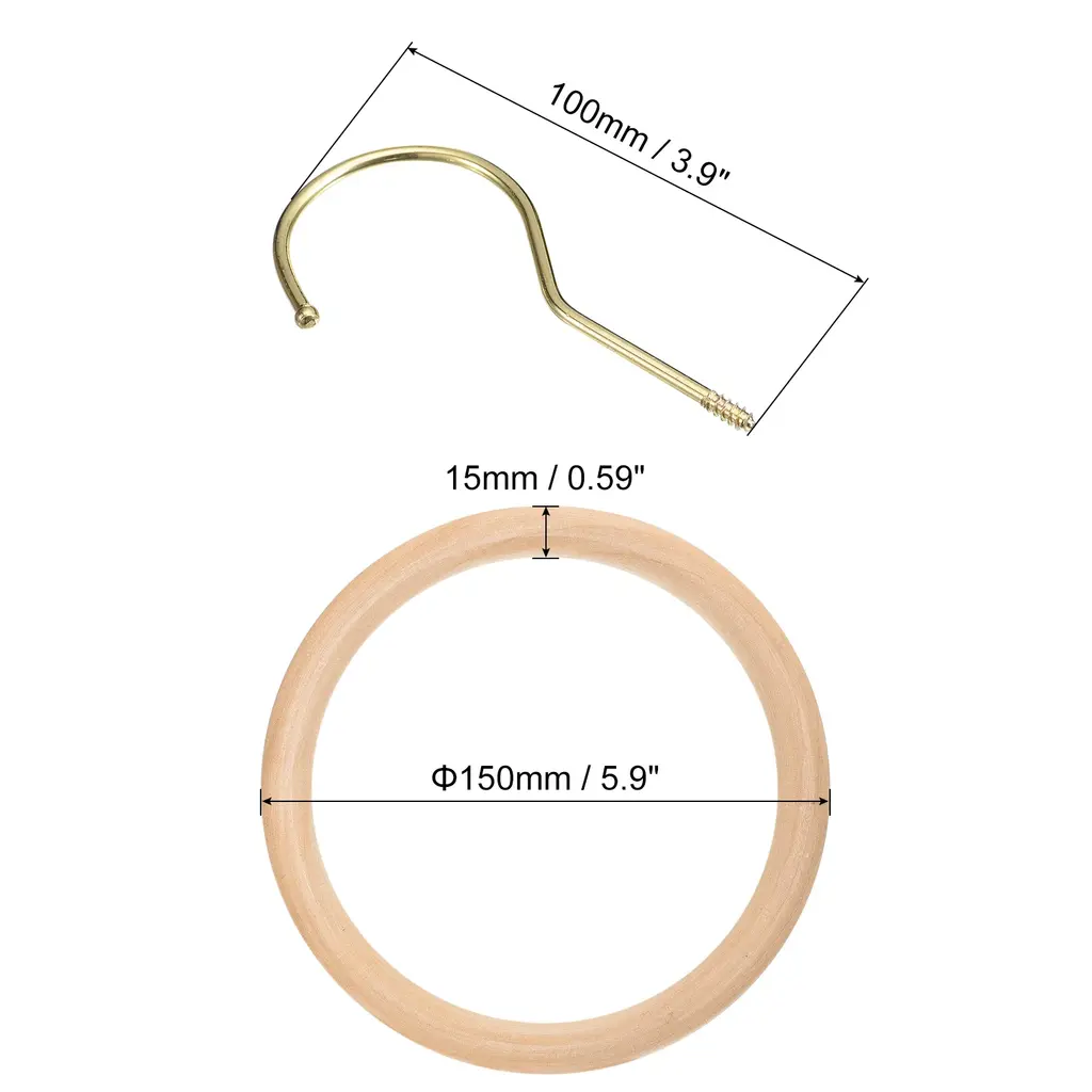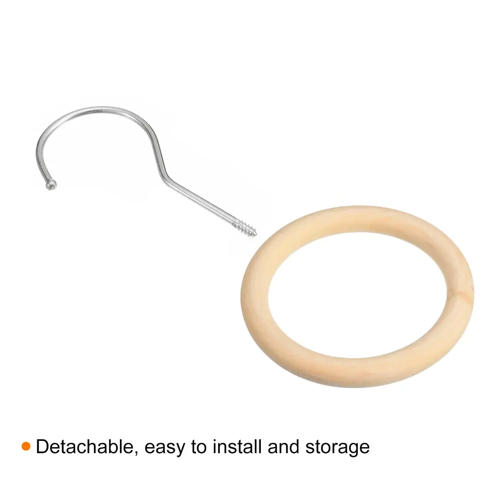 Description:Made of premium wood and metal material that ensures its durability and longevity, wooden rings with a smooth surface instead of having huge knots, providing a good decorative effect, and the hook is not easy to rust or corrosion.The hanging hook is designed to maximize your closet space while keeping it neat, visible and clean. Keep your scarf from wrinkling easily and can help you quickly find what you need. The sophisticated wooden circle is also perfect for displaying your collection of scarves, ties and more.Easy to install and convenient to use, with a long hook to hang over a closet rod or hook, also suitable to hang clothes hanger, belts, ties, etc and closing for sturdy hanging with no worry about falling.The closet organizer hooks are commonly used in the home, closet, bathroom, clothes shop, etc. The hook can be utilized for hanging and organizing various items, including clothes, pants, ties, scarves, shawls, belts, and more.Specification:Material: Wood; MetalWood Ring Diameter: 100mm / 3.9-inchWood Ring Thickness: 15mm / 0.59-inchHook Length: 100mm / 3.9-icnhPackage Content: 1Pcs x Scarf Ring Hanger