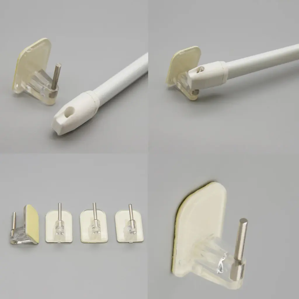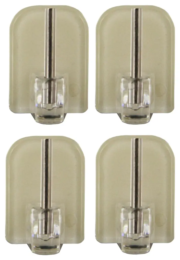 • NO TOOLS NEEDED : No tools, no screws, glue or holes, no damage to walls, doors or windows.These adhesive curtain hooks are made of good quality plastic with self-stick back, they are durable and easy to install with no need of any tool• STRONG ADHESIVE HOOKS: These self adhesive hooks have an ultra-strong viscosity. The smaller adhesive hook can carry weights of up to 3Lbs. (Note: DO NOT hang Overweight, Valuable or Breakable objects.) These hooks are strong, firm and can surely hold your flat sash rod in place.• EASY TO BE INSTALLED OR REMOVED: NO DRILL NEEDED, peel off the yellow back protection and stick it on the window frame surface, INSTALL IN SECONDS. These hooks can be simply removed using a hair dryer• SET OF 4 HOOKS : With only one set you can install two pairs of voilage, sheers, valances or tiers. Color clear also available in white• COMPATIBLE : Adaptable with all our flat sash rods (sold separately)This set of four self adhesive curtain hooks is entirely appropriate to hold your net curtain rods safely. With its good stickiness, you don''t need to drill or damage your window frame. These adhesive curtain hooks are made of good quality plastic with self-stick back, they are durable and easy to install with no need of any tool. You just need to peel off the yellow cover paper, then stick them on the window frame. Please do not place too heavy things on them. It is not recommended to use the sticky hooks on painted walls, for they may break the painted surface when removed them. Fit perfectly with our flat sash rods (sold separately). Imported from France and made in PRC. Color clear, also available in white, with dimensins of 1 H x 5/8 x W x 1/2 D inches, sold by set of four. Curtain rod adhesive hooks with strong adhesive are good for hanging curtains, valances, nets, tiers or sheers.