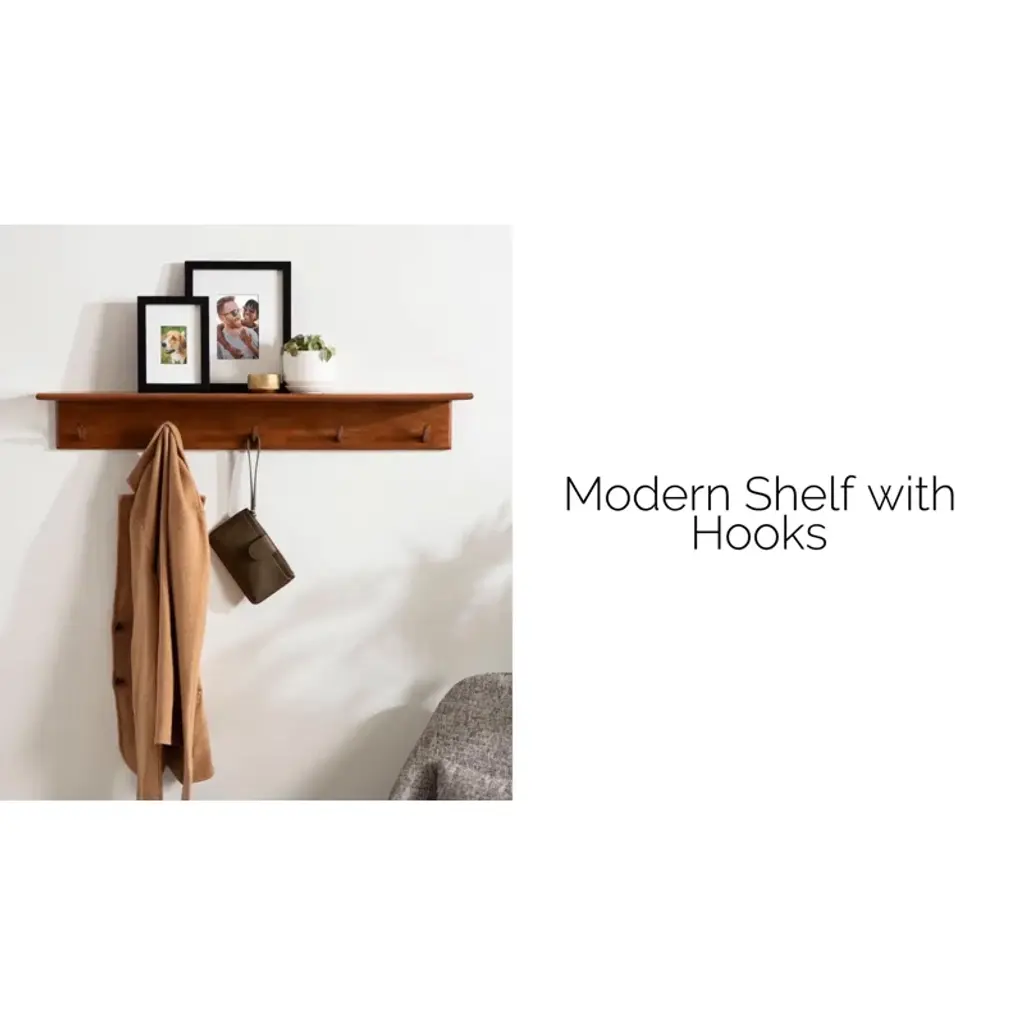 Effortlessly Organized. Crafted from solid poplar wood, this rectangular shelf is a stunner. Its natural wood finish exudes a warm, inviting tone, perfect for any room. Not just a pretty face, this shelf is a practical solution for clutter, offering five sturdy pegs for hanging light jackets, backpacks, or bathrobes. No need to worry about wall outlets, this piece doesn't require them. Plus, it's ready to keep your space organized and stylish.