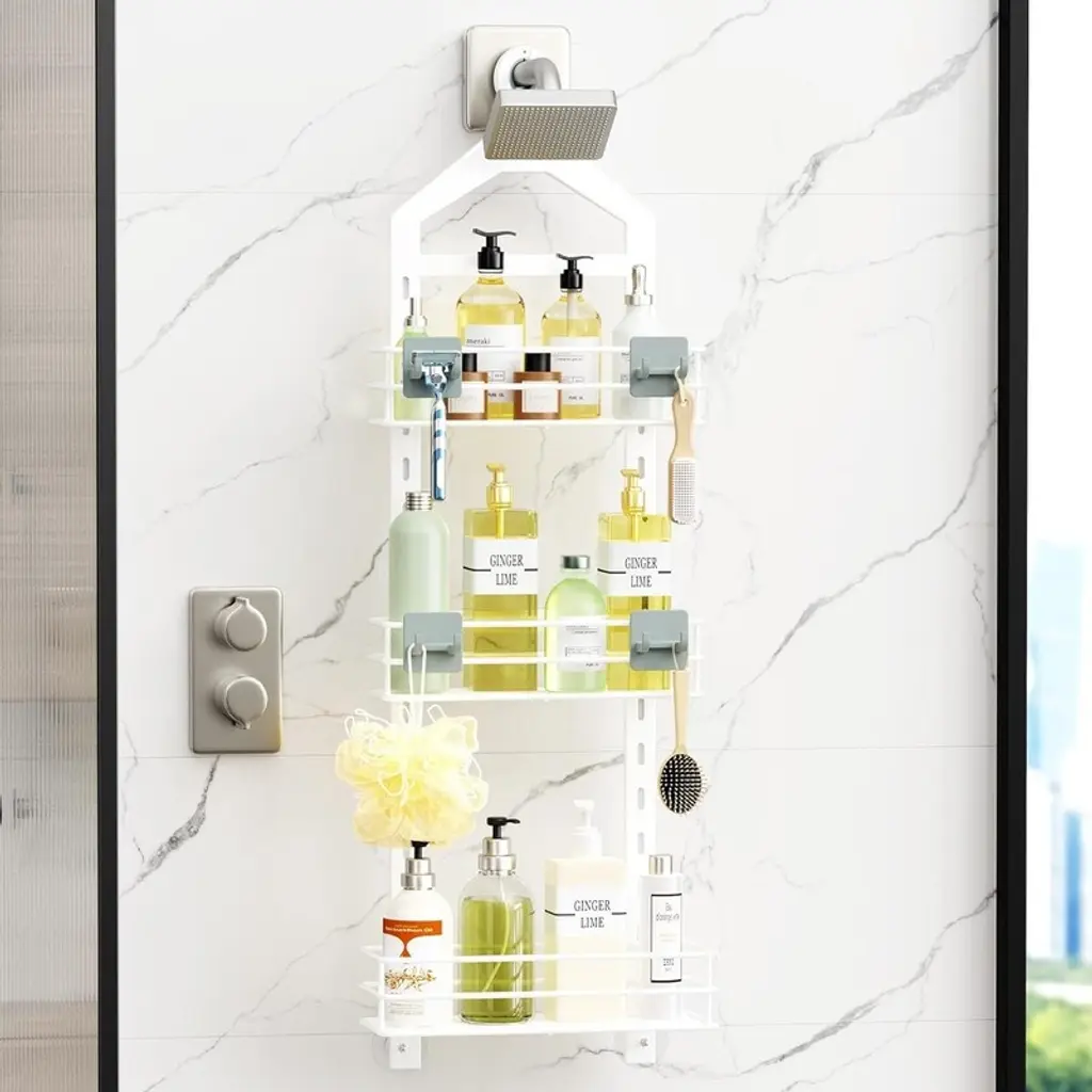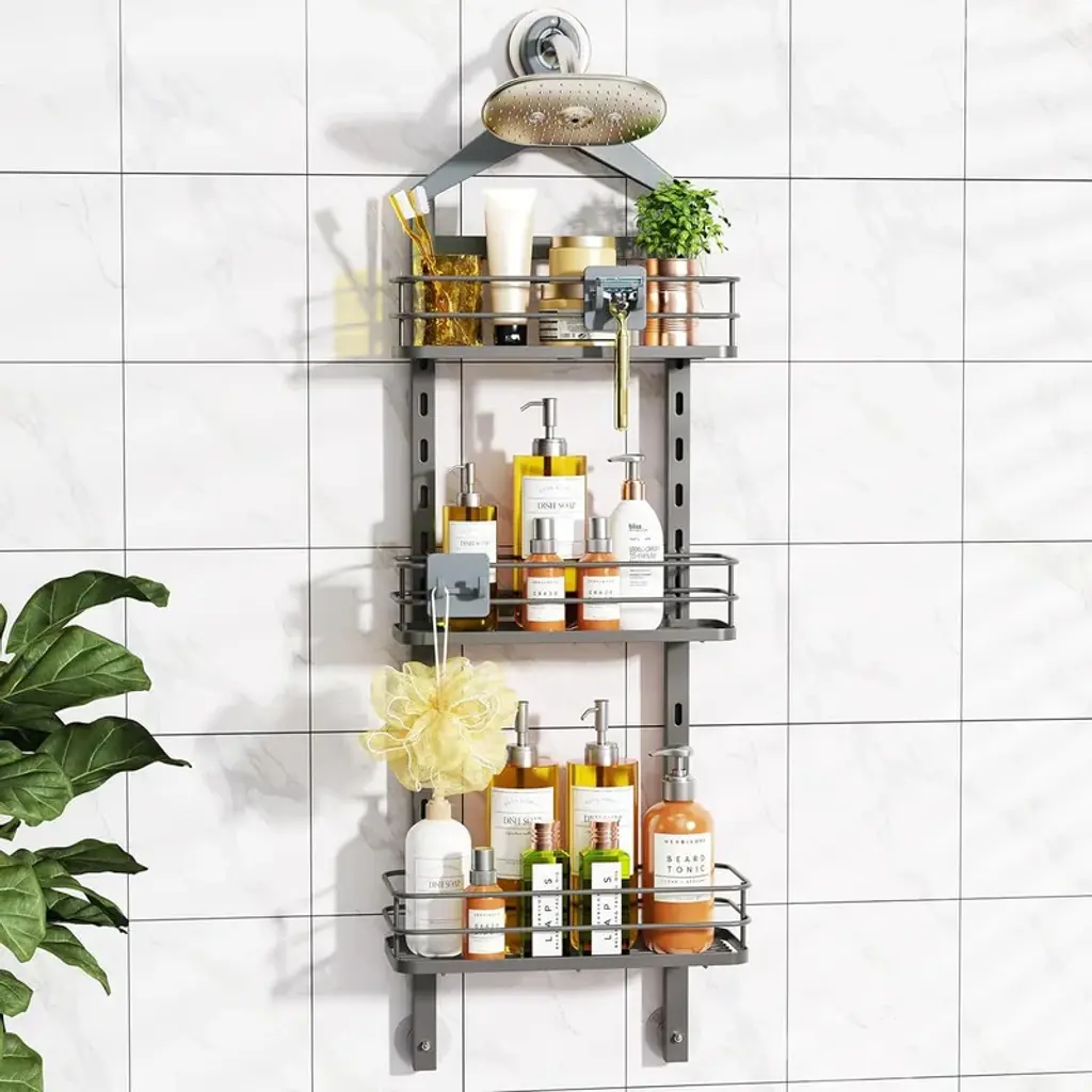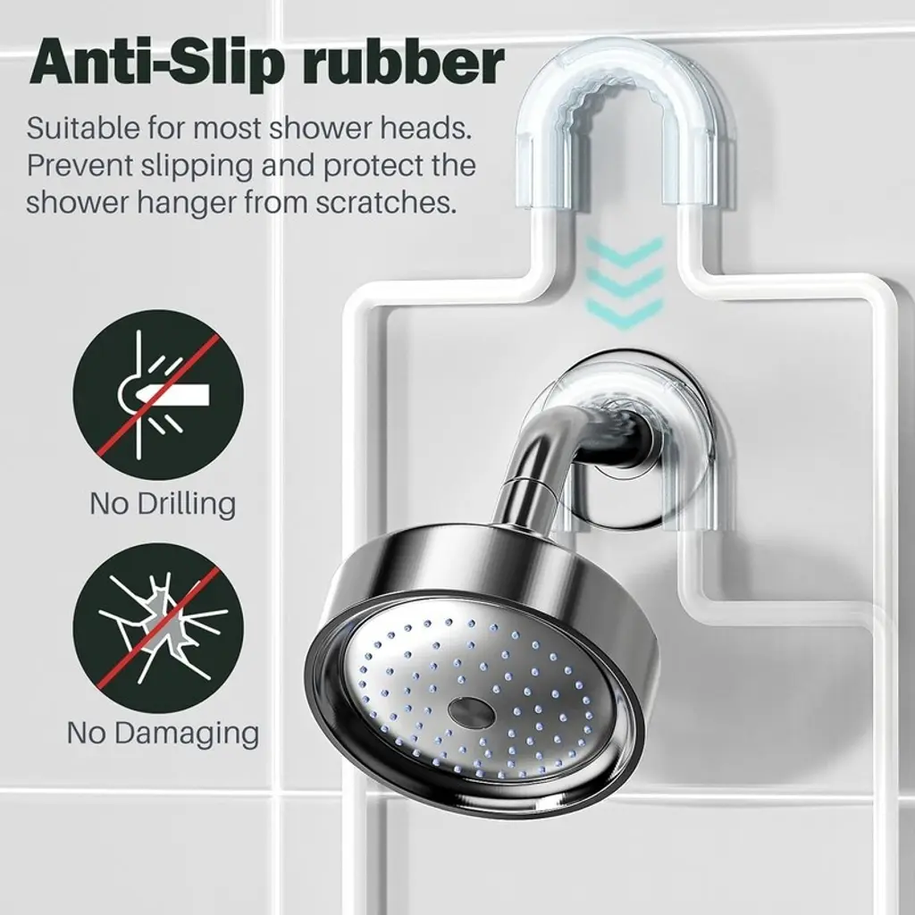 Smart Shower Organization:This space-saving shower caddy keeps all bath essentials neatly organized and within easy reach, optimizing your shower stall or bathtub space without clutter.Ultra-Stable Anti-Slip Design:Features a dual-anchoring system with a rubberized showerhead gripper above and adhesive hooks below to prevent swinging or slipping when accessing items.Rust-Resistant & Quick-Dry Construction:Made with electroplated and powder-coated metal that resists rust, featuring an open-air design that promotes fast drying to maintain hygiene.Universal No-Tools Installation:Designed to fit most standard showerheads without drilling or hardware - simply hangs securely over the shower arm for instant use.Tall Bottle-Friendly Design:The vertical clearance accommodates upright storage of large bottles without interfering with the showerhead