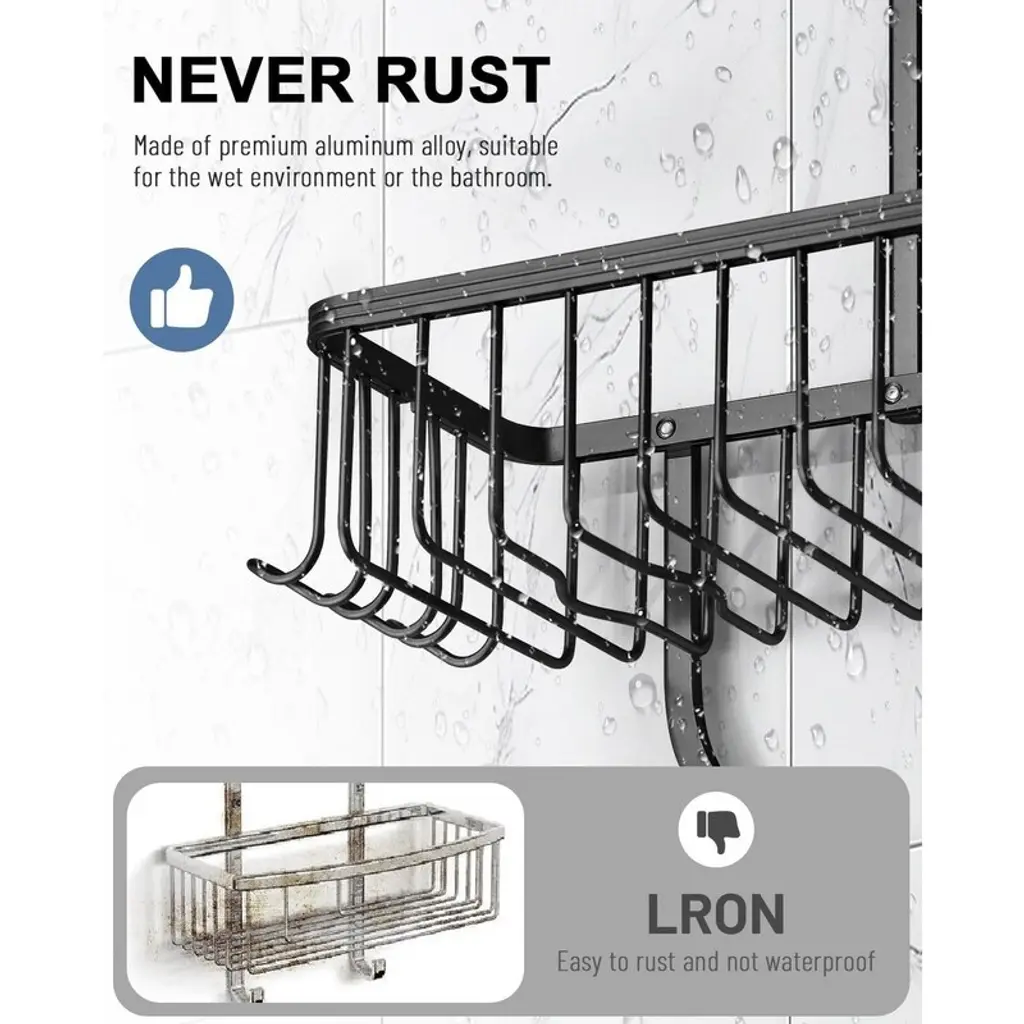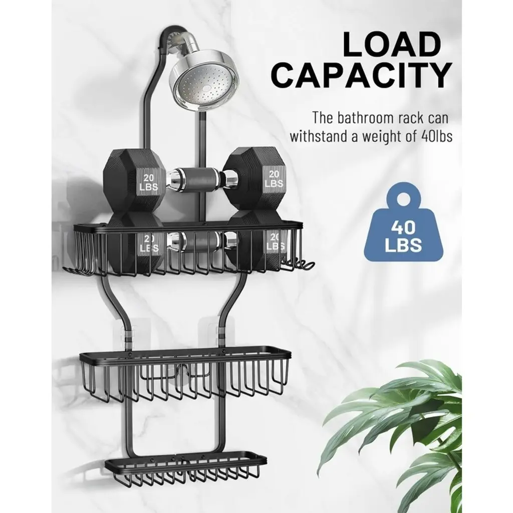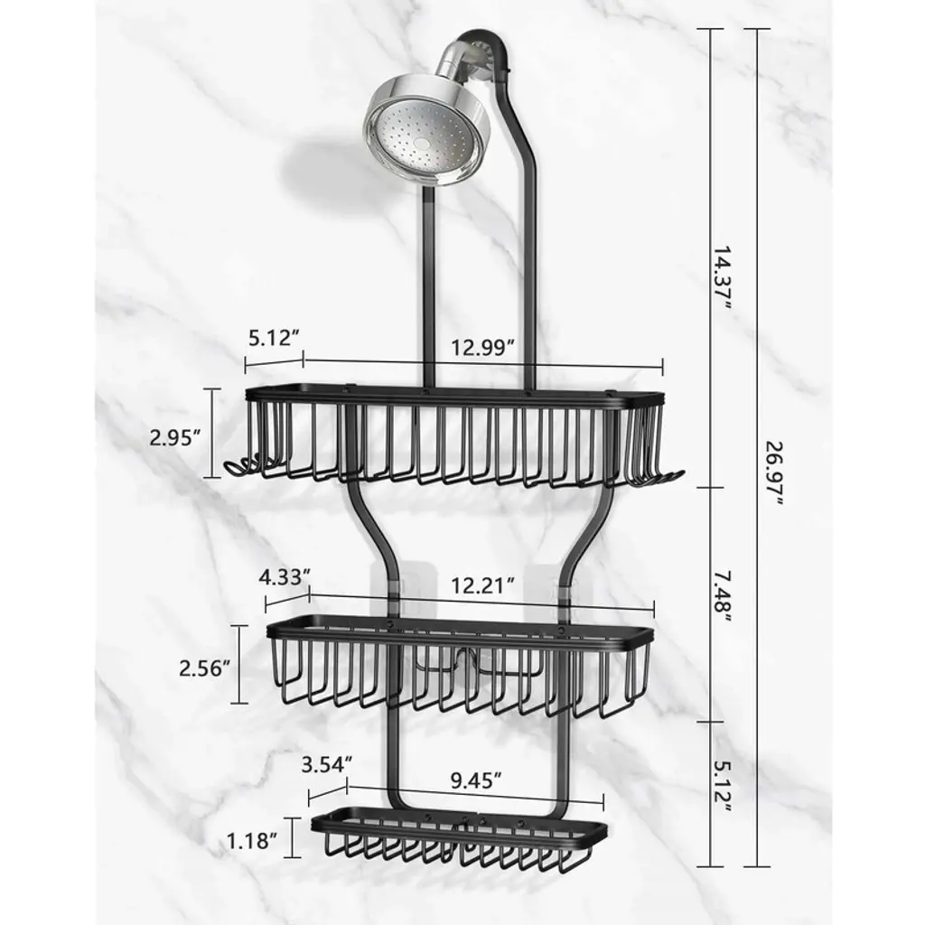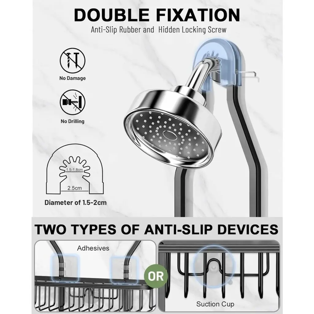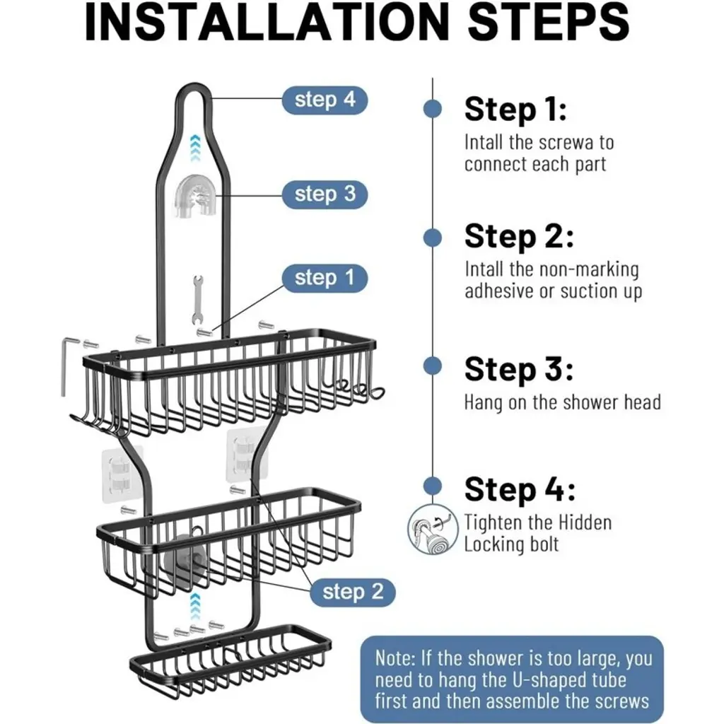 Ample Storage Space:This shower caddy features 3 spacious baskets (including inverted bottle holders) and 6 sturdy hooks, offering generous 13"x5"x27.5" storage for all shower essentials while optimizing vertical space.Premium Rustproof Aluminum:Constructed with high-grade aluminum alloy that withstands humid environments while being lightweight enough to reduce strain on your showerhead. Holds up to 40lbs without bending or breaking.Ultra-Secure Anti-Slip System:Dual locking mechanism combines rubber-gripped hooks with hidden screws, plus stabilizing adhesives and suction cups to prevent slipping or wobbling during use.Heavy-Duty Performance:Engineered to maintain structural integrity under weight, supporting multiple full-sized bottles, soaps, and hanging accessories without deformation.Tool-Assisted Quick Setup:Simple screwdriver assembly required (no drilling). May require temporary showerhead removal for larger fixture installations. Includes all necessary hardware for secure mounting.