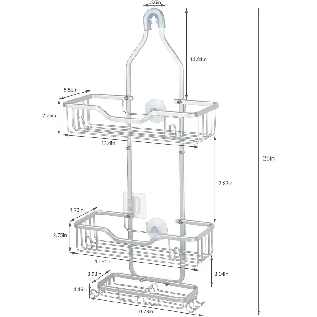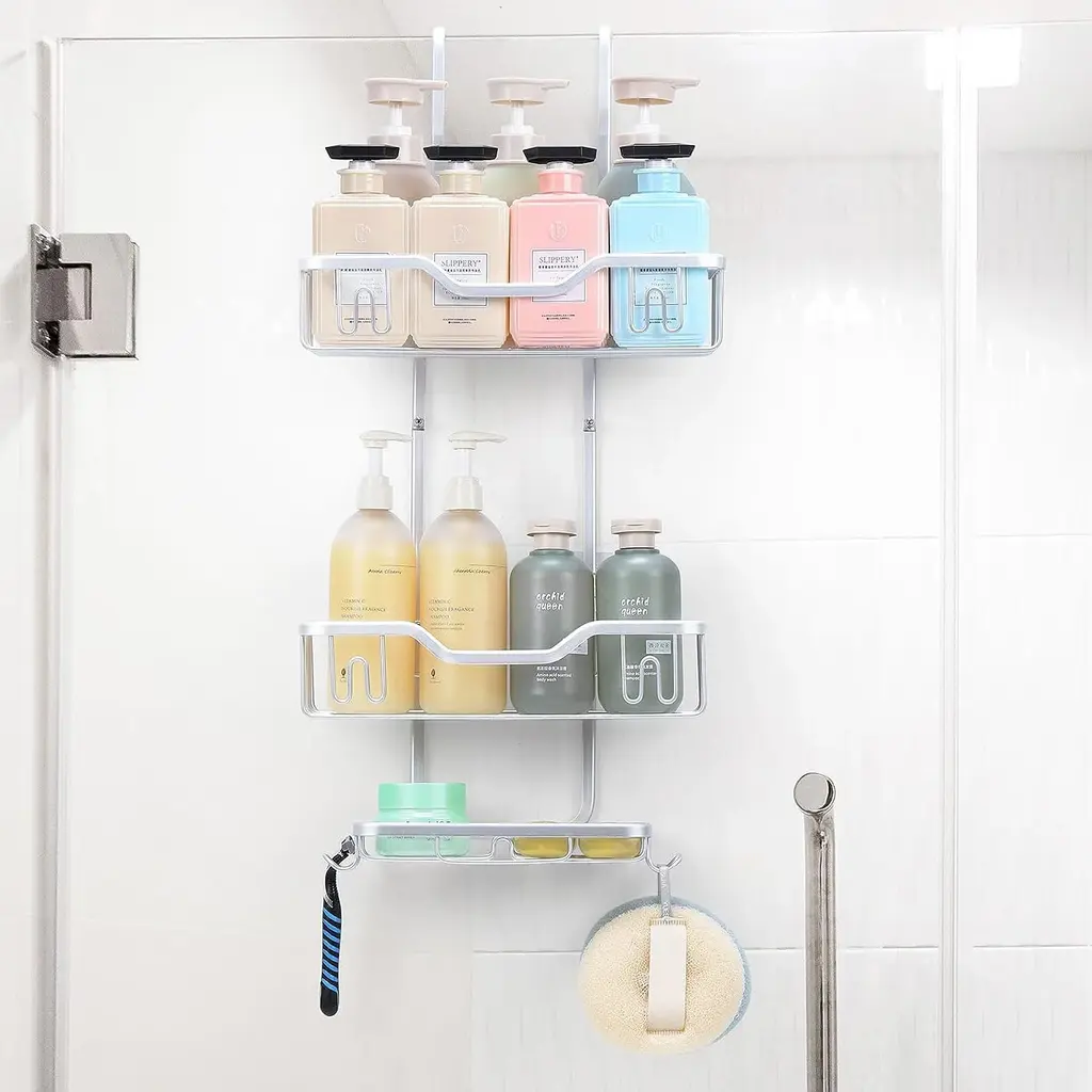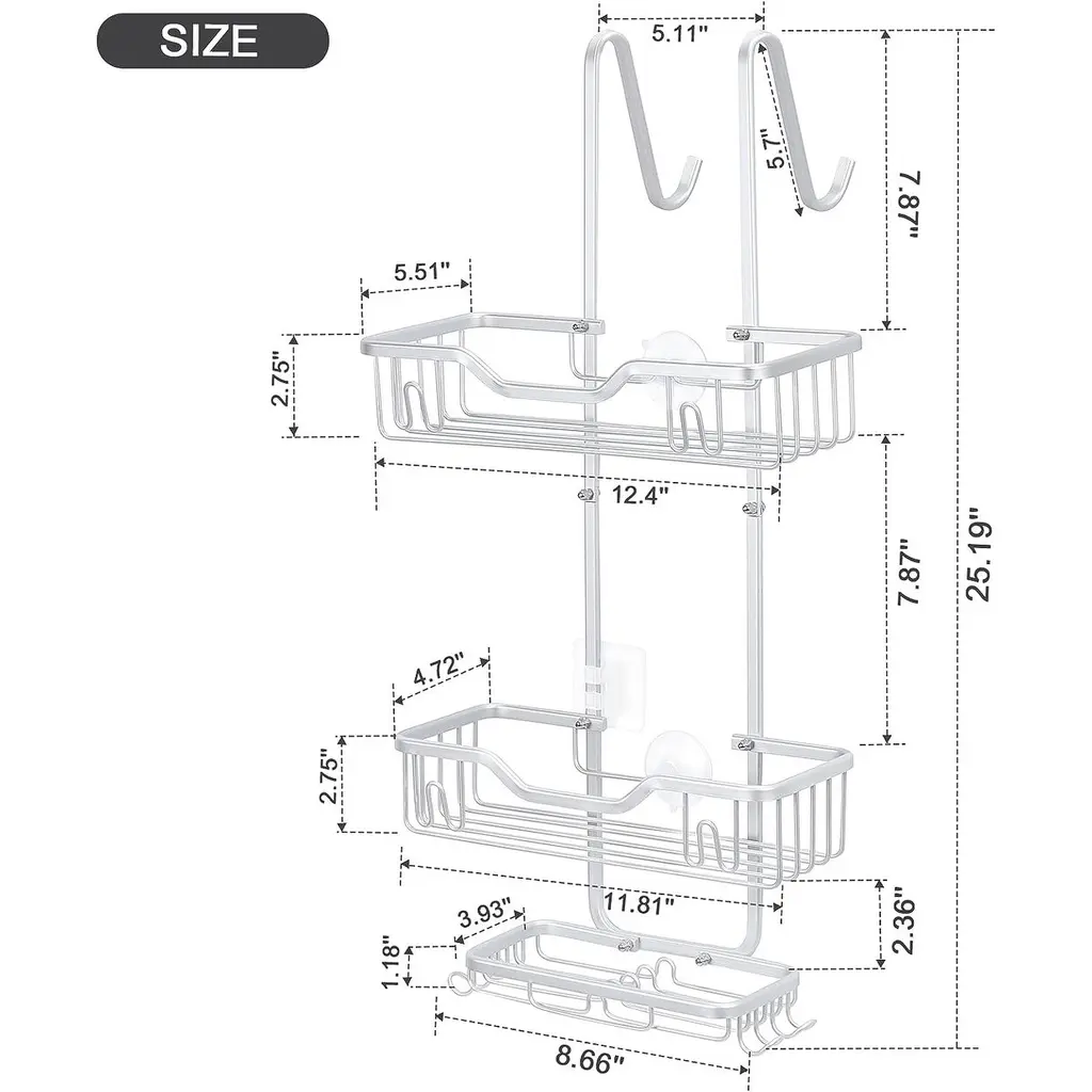 【Multi-functional Shower Caddy】The 3 tier hanging shower organizer shelves Make the most of your bathroom shower by keeping your bathroom essentials organized and within reach. The top 2 baskets are large enough to store shower gel, shampoo, and body lotion. The bottom can store soap, sponges, razor, etc. 【Sturdy & Durable】Made of high stainless steel, which is waterproof&rustproof, the surface is finished with high-temperature paint, which is sturdy and durable and can hold up to 40 lbs of toiletries. With 4 hooks for razors, shower sponge, loofahs and bath accessories. 【Fast Draining Shower Shelf】Hollow design of the bathroom shower organizer can quickly drain the moisture on the toiletries and shower storage, keeping the bathroom clean and fresh. 【Easy Assembly】No drilling shower caddy, easy to install over the glass door. Don' t worry about the bath products will fall, our shower organizer will not tilt forward due to unbalanced weight. It comes with 3 adhesive suction cup to firmly to the door!(suitable for all 1.97 inch doors)