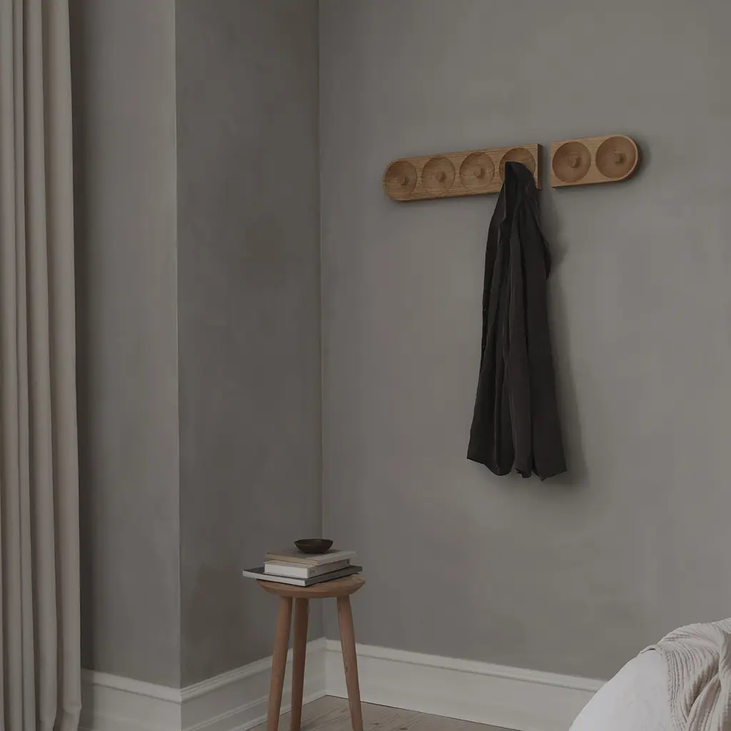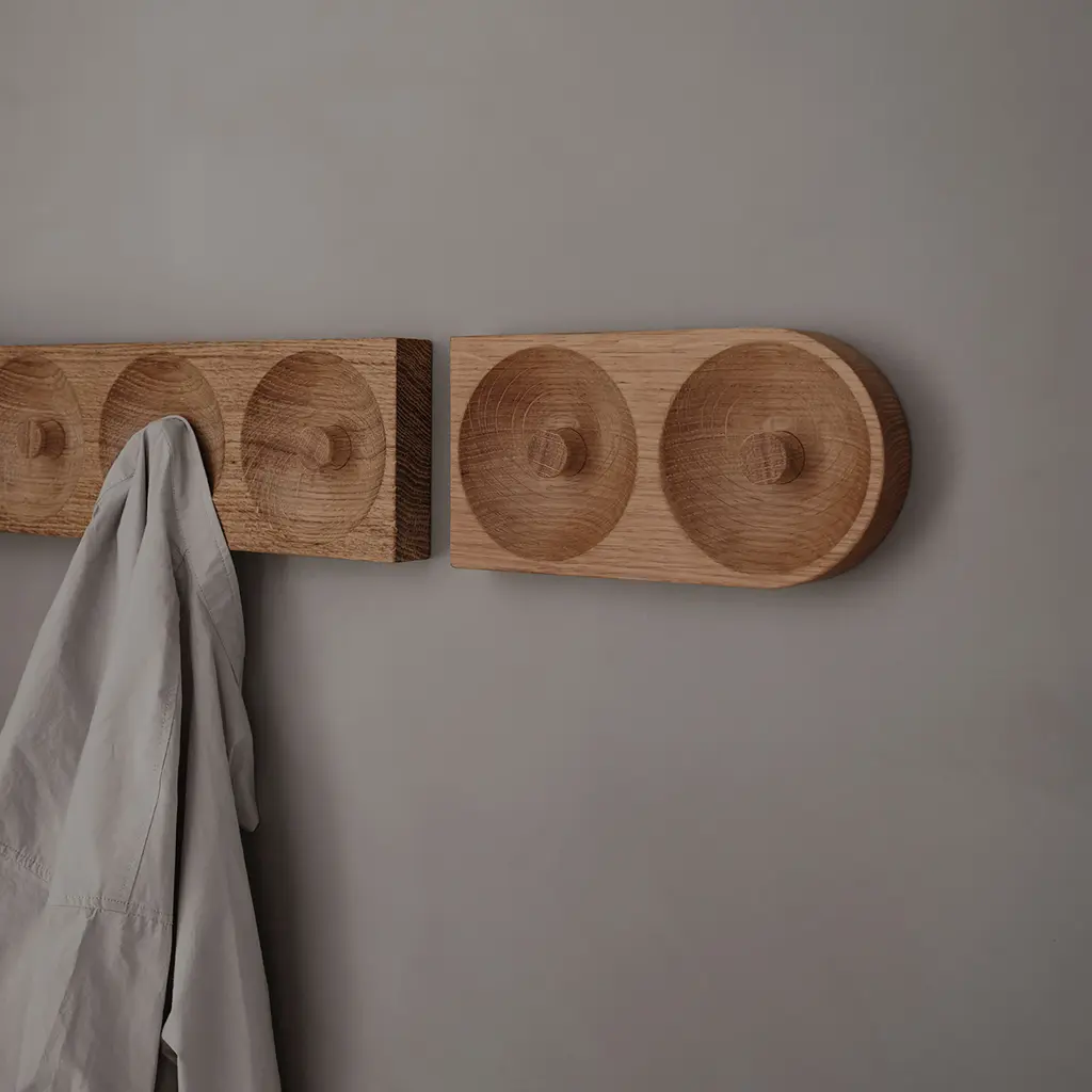 An exploration of the natural beauty of solid wood and woodworking, the We Do Wood Solid Hook adds a warm accent to any space, whether it’s an entryway or a bedroom. The design is simple: circular shapes made of timber with a natural color and organic textures. As a result, the Solid Hook blends into any living space and décor with ease, helping you store coats, bags, hats, scarves, towels, or shirts in an elegant way. The Solid Hook comes in different sizes, to help you create the perfect coat rack system for your home, whether you need the 2-hook version on its own for a bedroom or differently sized Solid Hooks mounted together in an entryway. Made from FSC-certified oak, these coat hooks are as eco-friendly as they are practical.