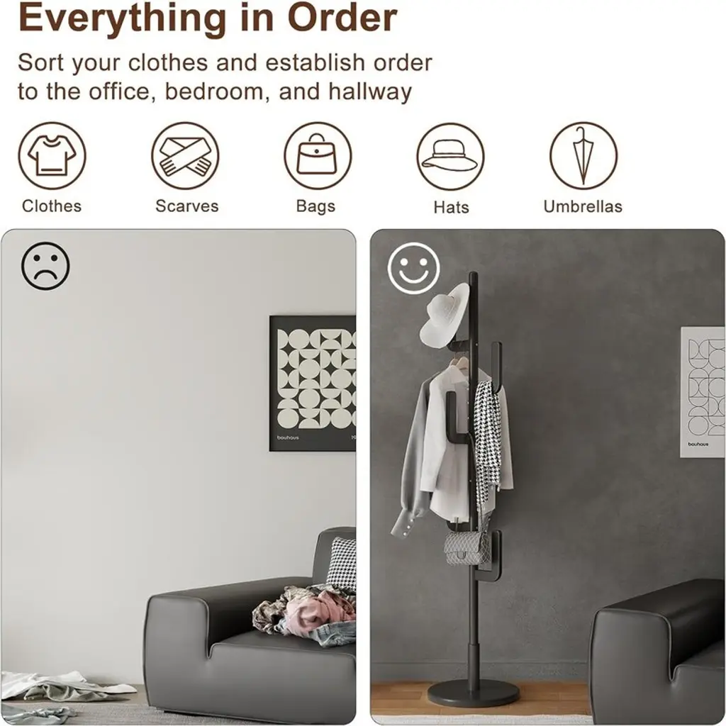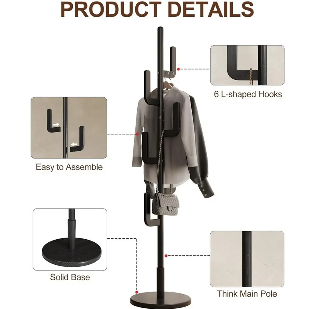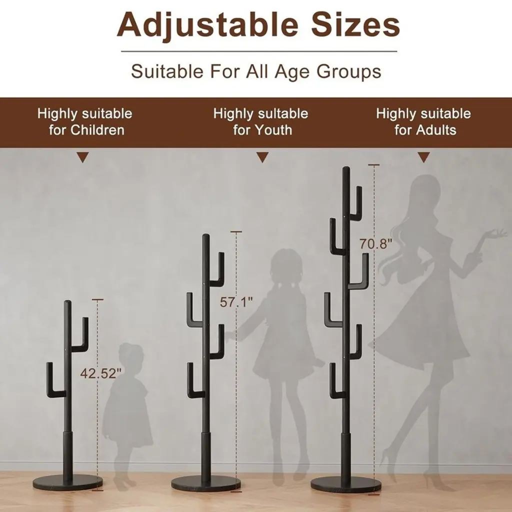 MODERN CACTUS LOOK:6 vertical strips staggered, not only will not cause damage to clothing, but also maximize the use of storage space. Add a sense of natural artistry while keeping your home neat and clean. Cloak Rack Shelf keeps your home clean and tidy while adding a sense of natural artistry. QUALITY MATERIALS:Our Vertical Hat Rack is made of 100% FAS Rubberwood, combining elegance and sturdiness, with thicker handles that can withstand up to 150 pounds. Bring sturdy sophistication to your home! STABILITY AND STRONGNESS:Our freestanding coat rack is made of thick rods and a wide, heavy-duty base that is stable and resistant to tipping, easily supporting heavy winter coats, jackets and more. It is suitable for living room, entryway, bedroom and office. HEIGHT ADJUSTABLE DESIGN:Our wooden coat rack has three height settings, which can be achieved by simply adjusting the number of main rods. It can hold coats, bags, ties, etc. to meet the needs of every family member. EASY TO INSTALL AND DURABLE: With the included tools, you can assemble this modern coat rack in 15 minutes without specialized knowledge.