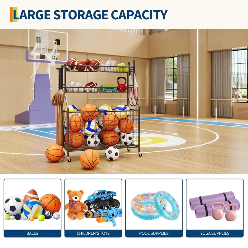 【LARGE CAPACITY】Our sports equipment storage cart consists of 2 large storage baskets, 2 metal baskets and multiple removable hooks. The baskets can store a variety of balls such as basketballs, soccer balls, footballs and more, and the hooks on both sides can hold baseball bats, tennis rackets, helmets and boxing gloves and so on.Garage sports organizer dimension is 16.5"D X 36.1"W X 45.6"H. 【DURABLE STEEL MATERIAL】The garage sports equipment organizer is made of high quality steel with strong load bearing capacity. The powder coated surface is scratch and rust resistant for years of use, indoor and outdoor. Stable and sturdy structure, not easy to bend or deform. 【STRONG WHEELS & ACCESSORIES】Our sports equipment storage carts are equipped with high quality precision wheels that can be easily moved to any position and locked to ensure a stable and durable structure. And also upgraded the quality of hooks and baskets, which are more stable and reliable when storing indoor and outdoor sports equipment. 【MULTIPLE APPLICABLE OCCASIONS】This sports equipment storage rack is suitable for various occasions and is the perfect storage rack for your garage, basement, storage room, entertainment room, gym, school, playground, basketball court, etc. Suitable for a wide range of sports equipment storage, can help you organize your room in a neat and orderly way. 【EASY INSTALLATION】The simple structure makes it easy to install this ball storage rack, and combined with clear assembly instructions, it can help you quickly assemble and experience a sense of hands-on achievement during the process.