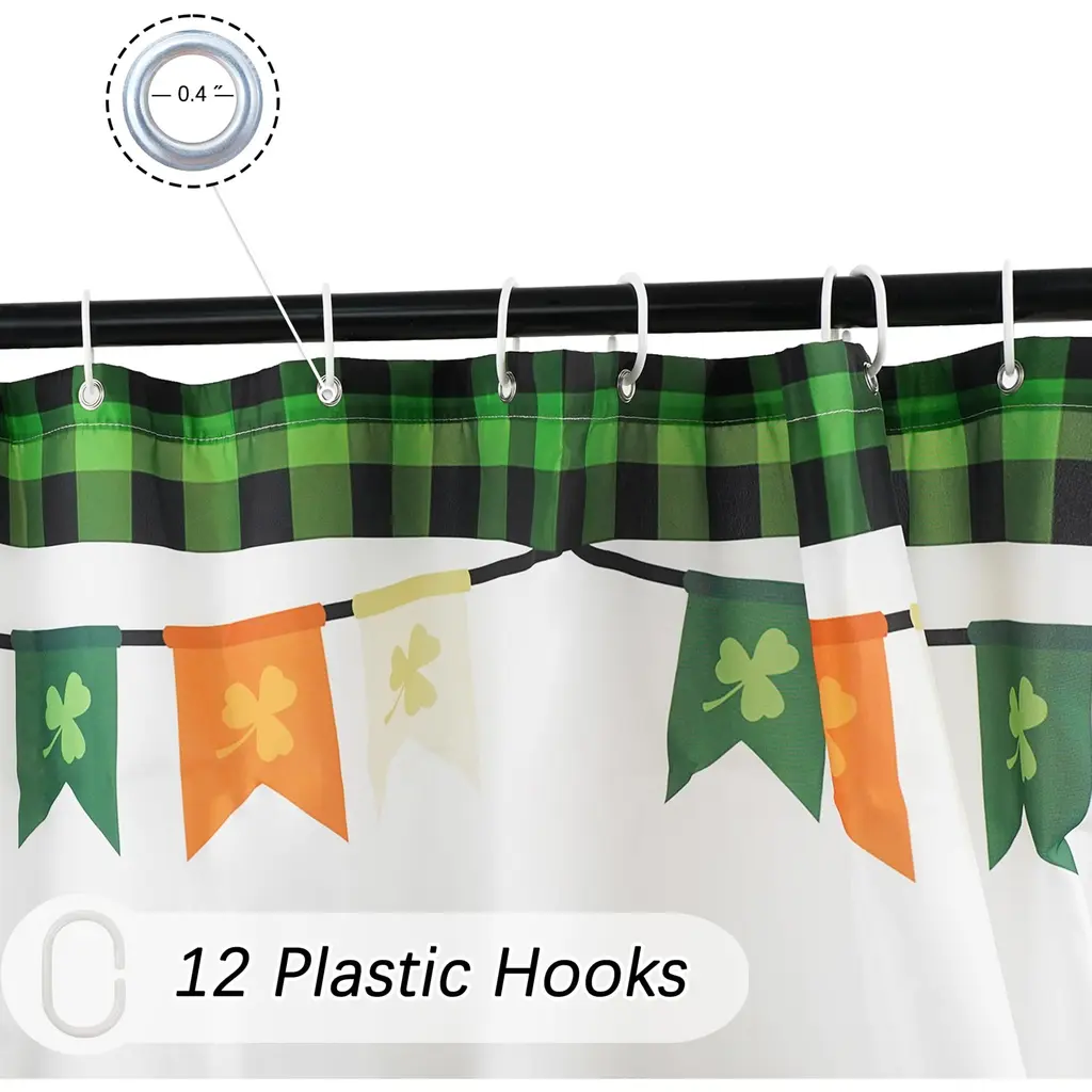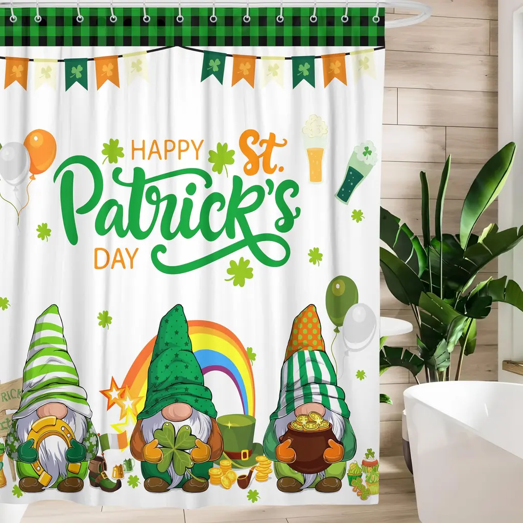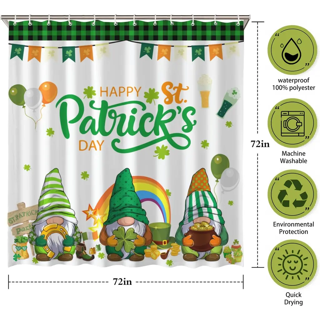 Celebrate the spirit of St. Patrick's Day with this festive 72"x72" shower curtain, designed to bring a touch of Irish charm to your bathroom. Made from waterproof fabric, it helps keep your space dry while adding a vibrant holiday feel with its themed design. The durable material resists moisture and mildew, ensuring long-lasting use, while the included hooks make installation quick and effortless. Whether you're decorating for the season or love the luck of the Irish year-round, this St. Patrick's Day shower curtain is a fun and functional addition to your home.