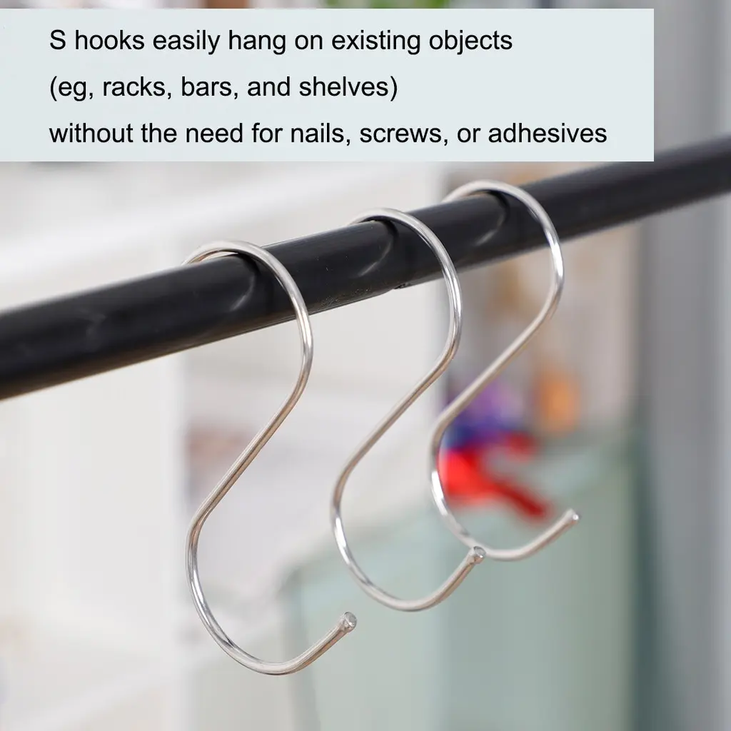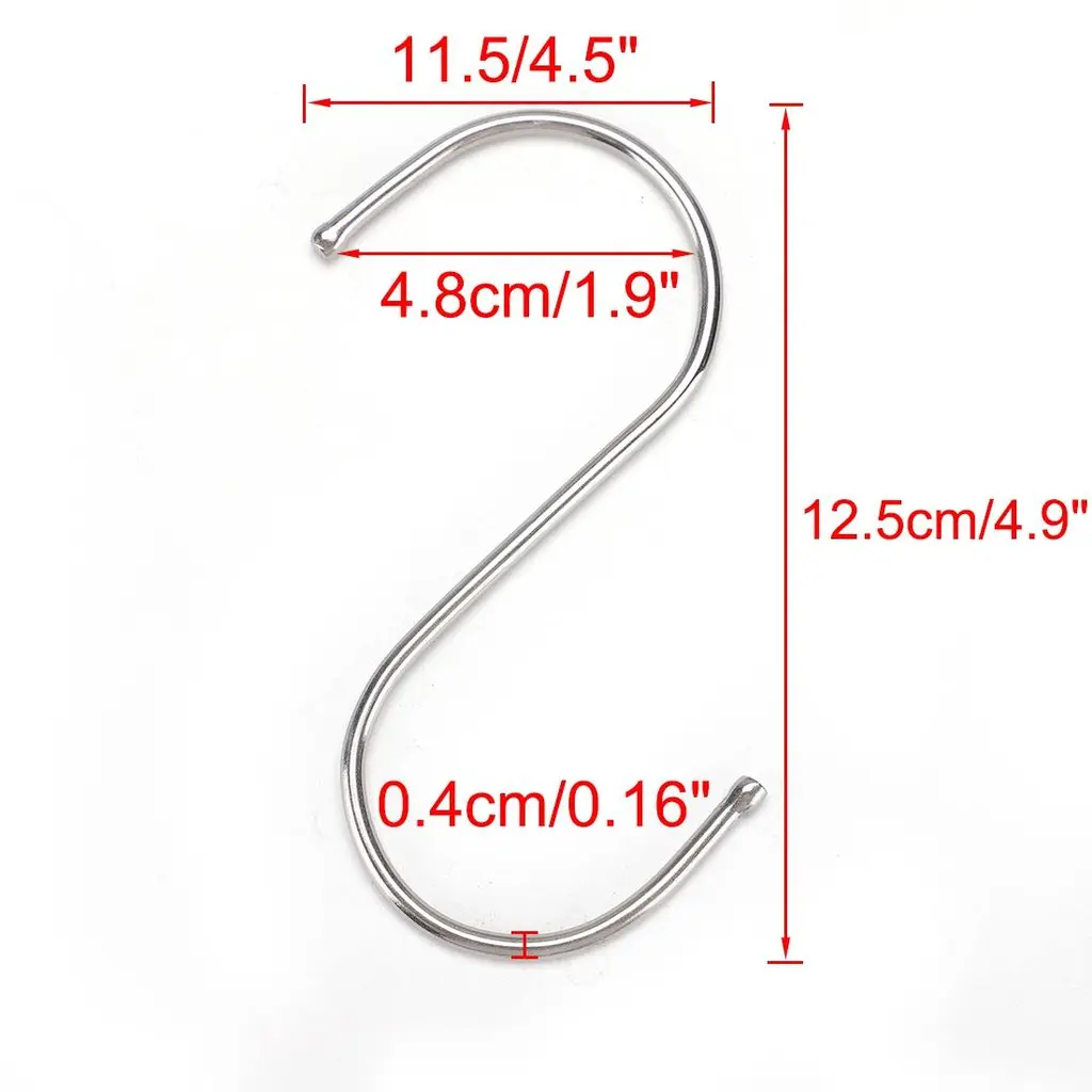 Color: Silver Tone; Material: Stainless SteelPackage Content: 10 x S Shaped Hook; Product Name: S Shaped HookNet Weight: 198gTotal Size: 12.5 x 11.5 x 0.4cm/4.9" x 4.5" x 0.16"(L*W*T)Fit Max Pipe Dia: 48mm/1.9"S shaped stainless steel hook hanger.No need to stick and use the screw, ideal home accessory for you use.Used to hang pot, pan, bowl, cup, kitchen utensils, clothes, shop fitting, bathroom, camping hanging, etc.