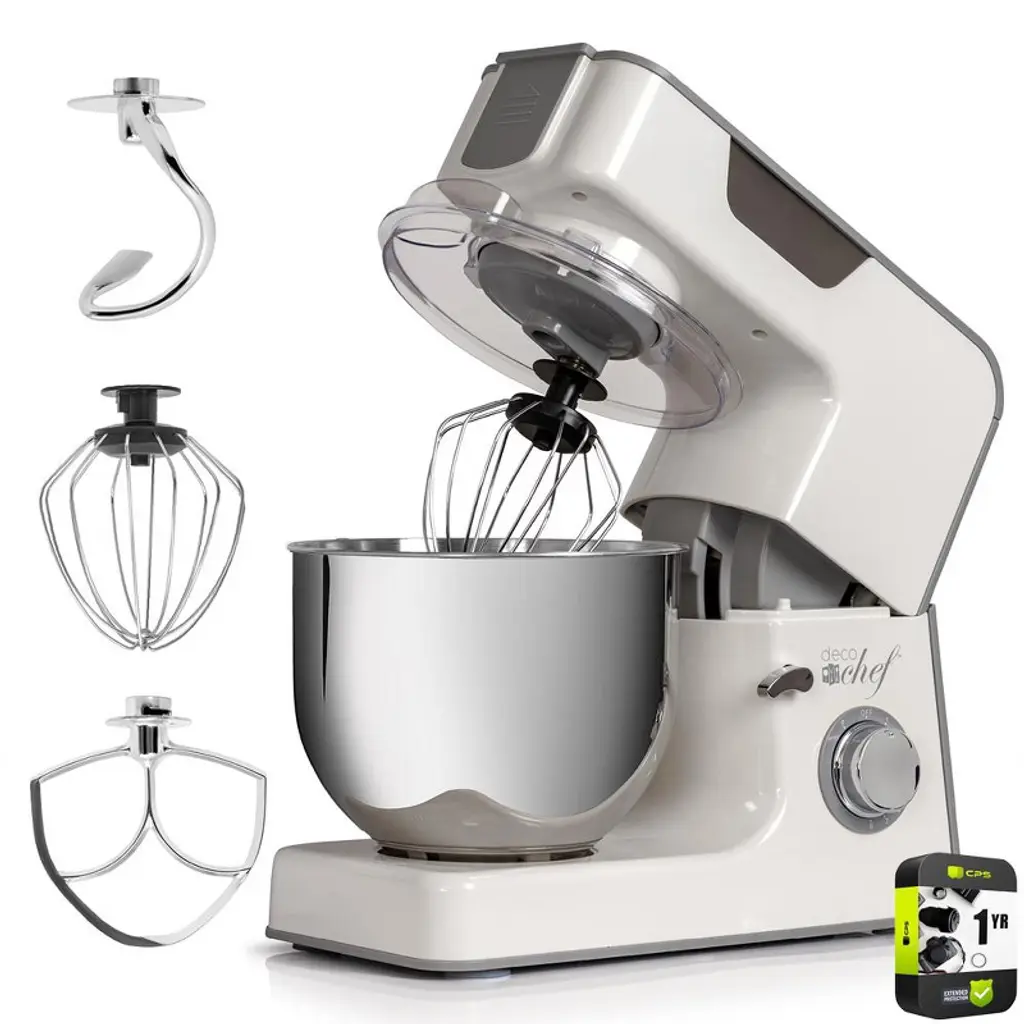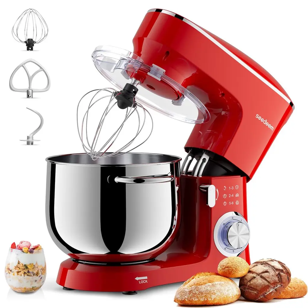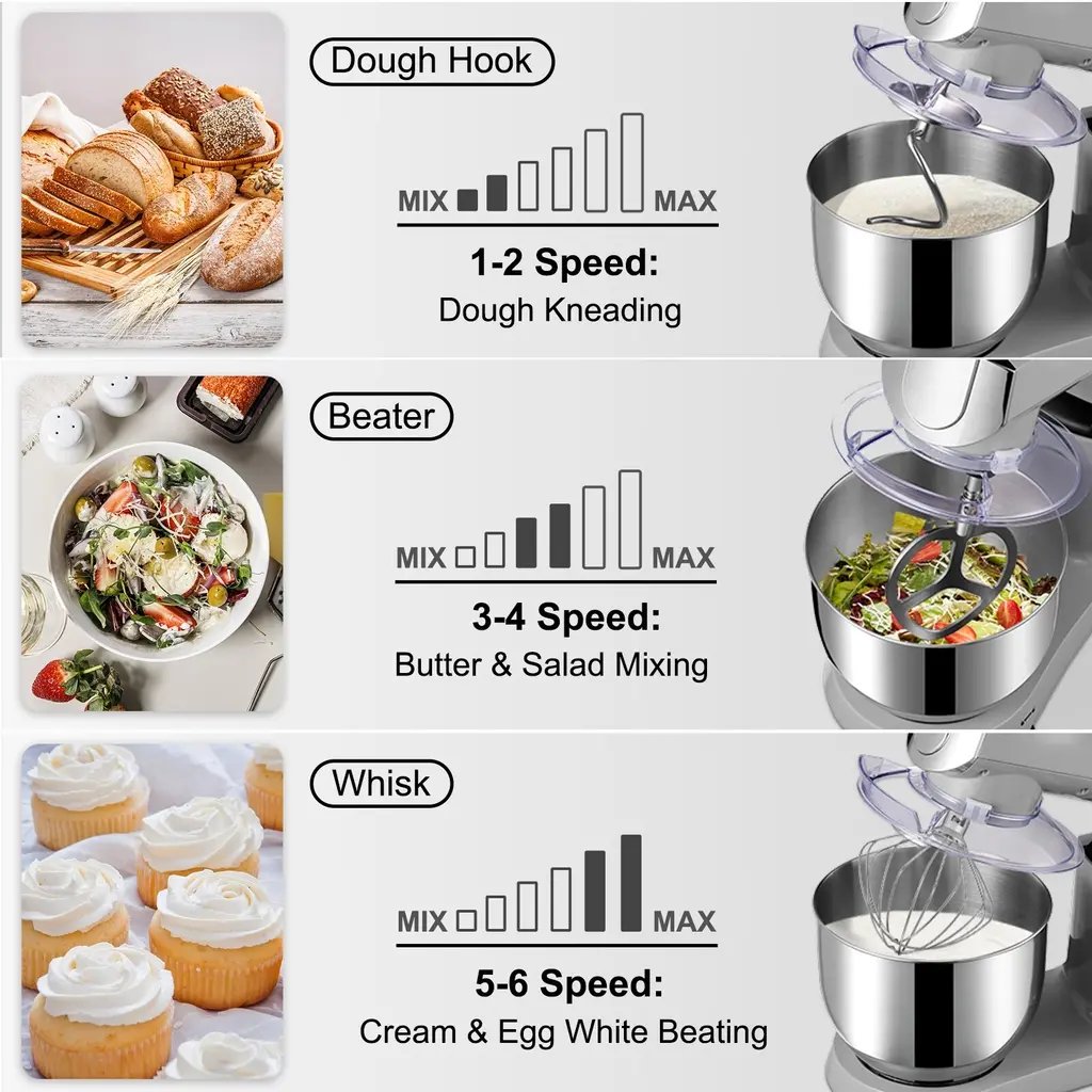 Comfortable User-Friendly Control Panel: Get ready to benefit from the intelligent LCD panel, operating this stand mixer couldn't be any easier. You can clearly perceive the precise remaining time from the screen, and set different durations according to different purposes. Thanks to the auto-stop function, you don't have to keep an eye on the machine all the time. Start a hassle-free baking journey even when your hands are occupied. Complete Accessories for Outstanding Performance: Everything you need to create the perfect mix is included. Our planetary mixer comes with 3 attachments (all dishwasher-safe): a dough hook to knead flour, a beater to mix butter & mashed potatoes, and a whisk to whip creams & custards. Thoughtful accessories like a scraper and splash-proof cover are also provided. Besides, you can extend its use with the extra meat grinder, sausage stuffer and vegetables slicer. Get ready to enjoy effortless baking and food preparation with this compact kitchen all-rounder. Unstoppable 6-Speed Pure Copper Motor: Choose how you mix! Equipped with a 450 W gear-driven copper motor, this mixer features continuous high-torque mixing, quiet operation, and outstanding reliability, standing up to the most demanding work in your kitchen. 6 speed levels allow you to perfectly mix different products at different speeds, from kneading dough slowly to whipping cream quickly. 1st-2nd speed for dough kneading, 3rd-4th for butter & salad mixing, 5th-6th for cream & egg white beating. Start mixing like never before. 7.4 Qt Stainless Bowl with Fermentation: Designed with a built-in thermostatic heating element, the 7.4 Qt / 7 L stainless steel bowl can automatically heat up to the appropriate temperature for fermentation. Raw materials for 6 toasts can be kneaded at a time, saving half of your waiting time even in winter. It is convenient to change the attachments and pour in the ingredients thanks to the tilt-head design. Plus, the bowl is dishwasher-safe and comes with a splash-proof cover. Never Worry About Mixing: Are you ready to mix! Don't stop! The planetary mixing and stirring mechanisms greatly contribute to full contact between the beater and the bowl's inner wall. The flat beater is designed with a soft silicone edge, which can effortlessly scrape off the sticky ingredients on the bowl and then mix them together. It doesn't even matter if they are left on the sides or at the bottom. Don't hesitate to knead dough and various bakery essentials with 's commercial mixer. Package Content 1 x Stand Mixer 1 x 7L Stainless Bowl (with Cover) 1 x Set of Mixing Part (Hook / Beater / Whisk) 1 x Scraper 1 x Meat Grinder 2 x Sausage Stuffers 3 x Vegetable Slicers 1 x Food Tray 1 x User Manual (1 x Stand Mixer 1 x 7L Stainless Bowl (with Cover) 1 x Set of Mixing Part (Hook / Beater / Whisk) 1 x Scraper 1 x User Manual) for other option