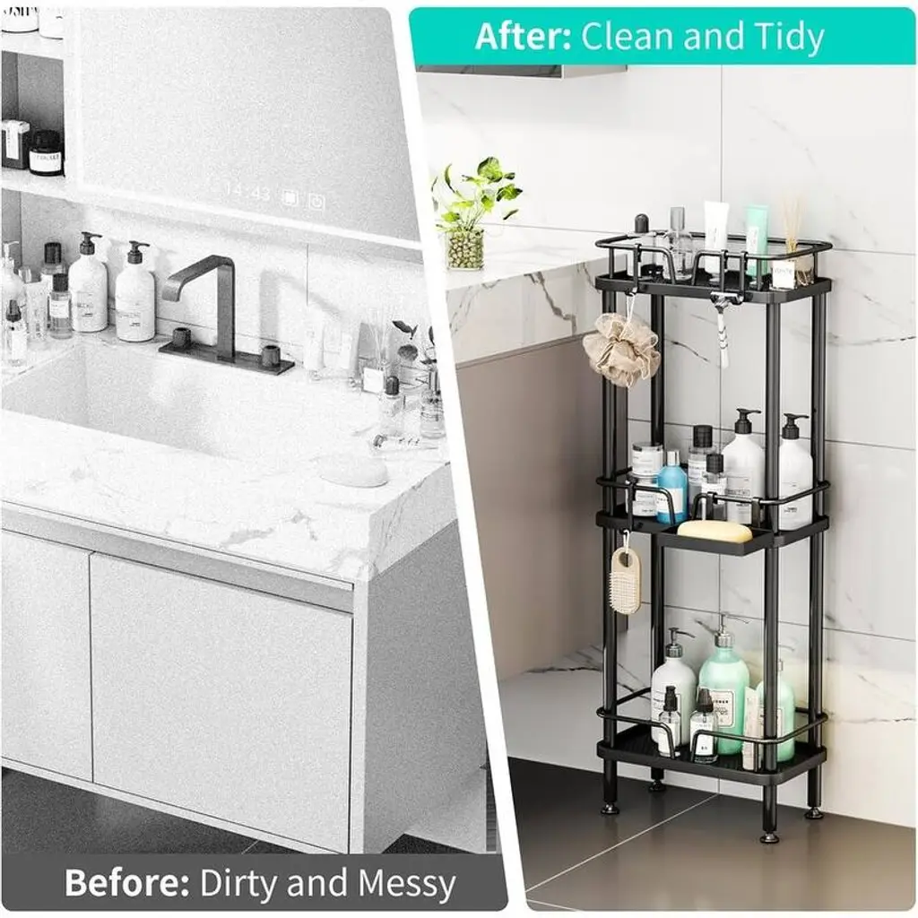 Smart Storage Solution:This 3-tier shower caddy features 4 rust-proof hooks and a dedicated soap tray to neatly organize all shower essentials while keeping them easily accessible.Premium 304 Stainless Steel:Constructed with commercial-grade stainless steel that resists rust, corrosion, and water damage for durable performance in wet environments.Quick-Dry Hygienic Design:Hollow shelf construction promotes fast drainage to prevent water pooling and minimize soap scum buildup.Space-Saving & Stable:Compact 11.22"x6.49"x31.29" design fits tight shower corners, with 4 adjustable feet for secure placement on uneven surfaces.Hassle-Free Setup:Simple tool-free assembly takes minutes, backed by responsive customer support for complete satisfaction.