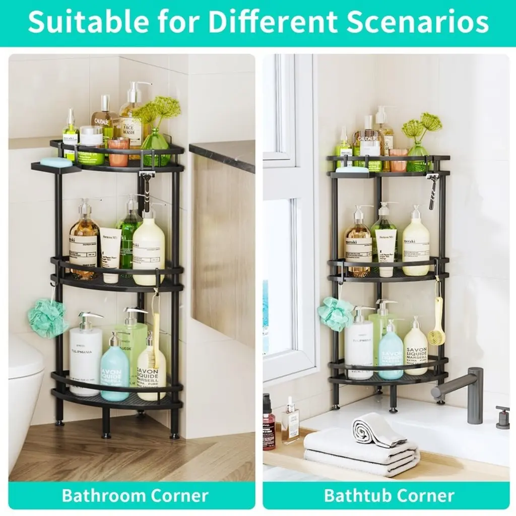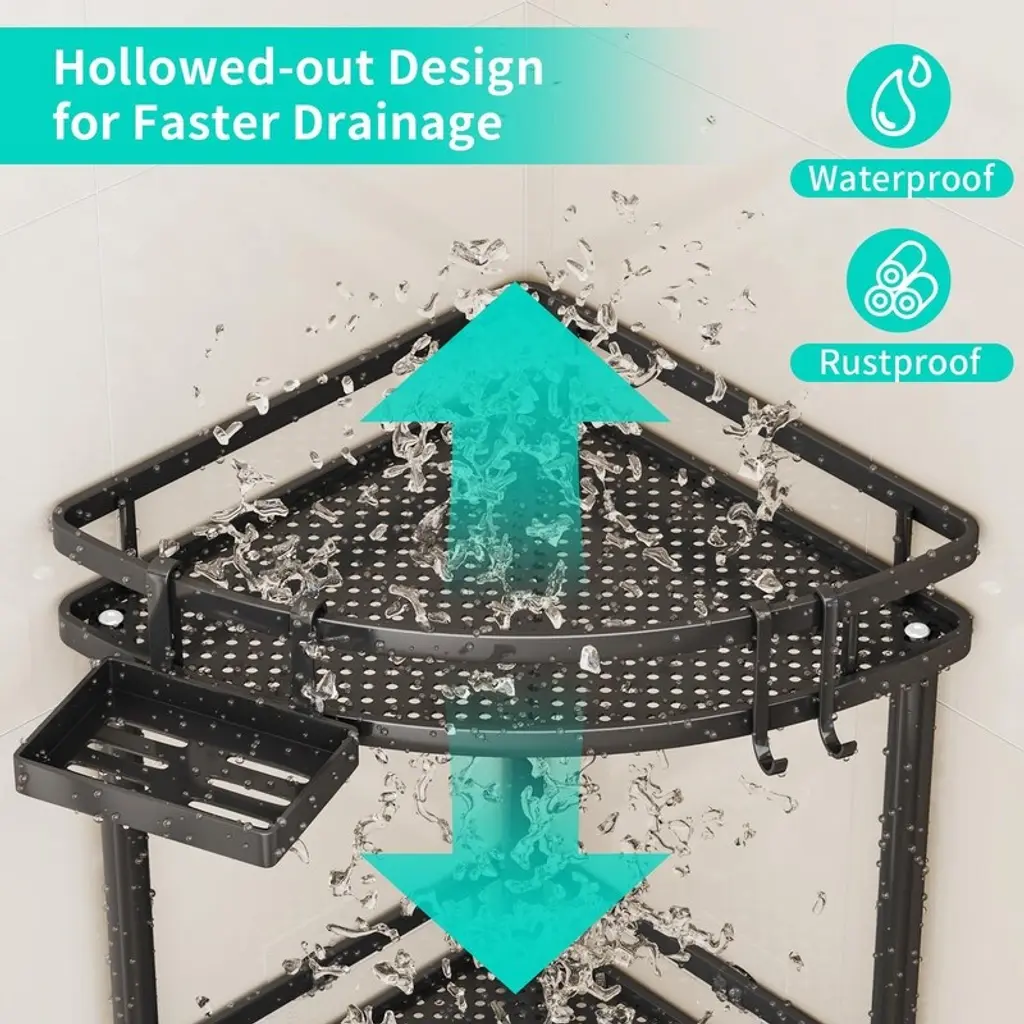 Struggling with bathroom clutter? The shower shelf features multiple tiers, 4 hooks, and a soap holder, providing a comprehensive solution to keep your bathroom essentials neatly arranged.Constructed from high - quality stainless steel, this corner shower caddy is sturdy, durable, and resistant to water and rust, ensuring long - term use.Thanks to its hollow design, the shower storage allows water to drain quickly, preventing the buildup of soap and shower gel residues on the shelves.This corner shower organizer takes up minimal space. Its shelf design offers ample room to store all your toiletries in one convenient location.The corner shower caddy comes with four adjustable feet, enhancing stability and providing a comfortable user experience. With strong load - bearing capabilities, you can store items without concerns about tipping or collapsing.Equipped with adhesive hooks, the hanging shower organizer remains stable and doesn't shake. It effectively helps you optimize bathroom space for a more enjoyable bathing experience.