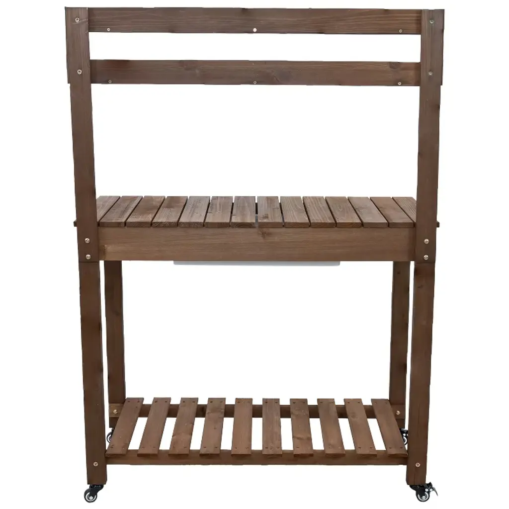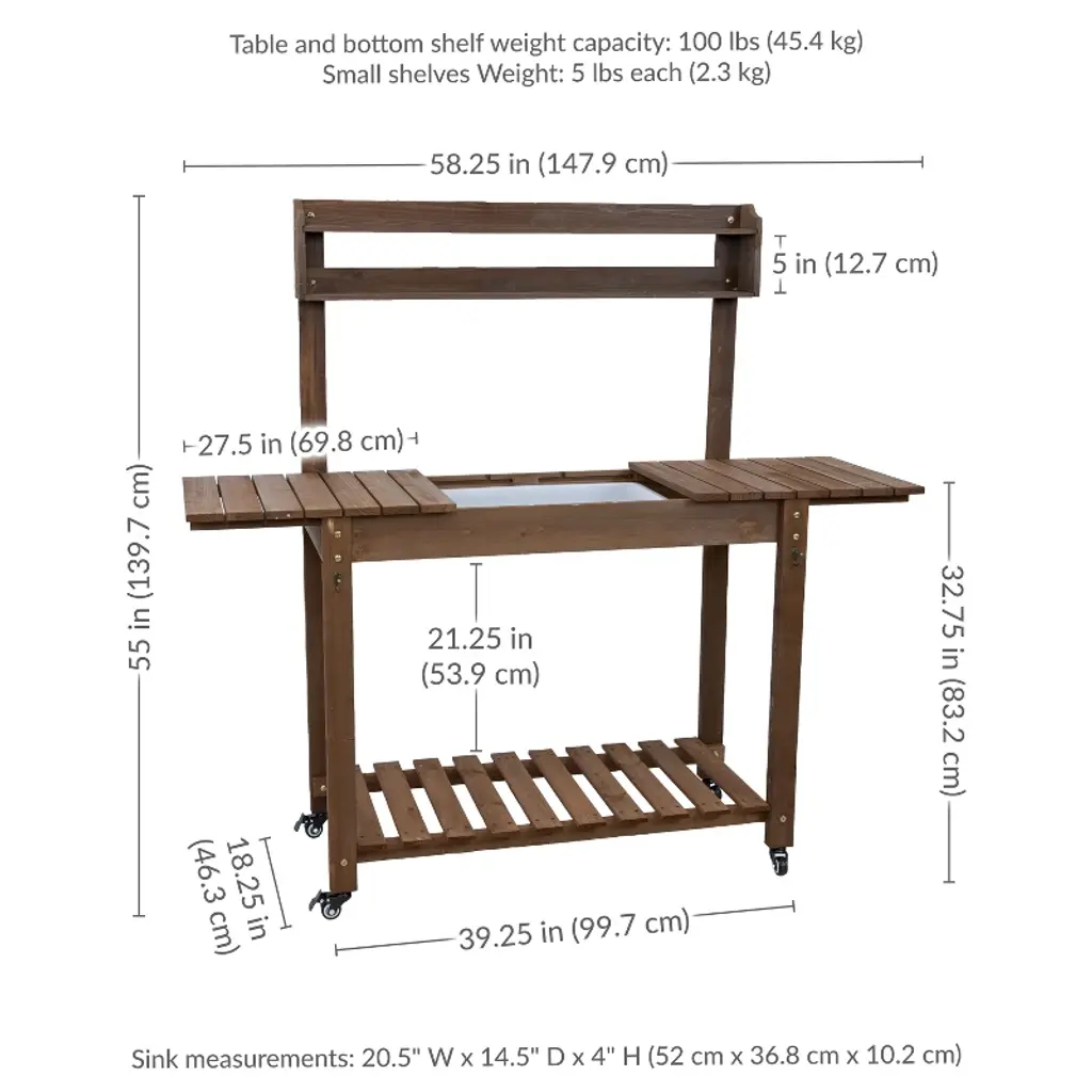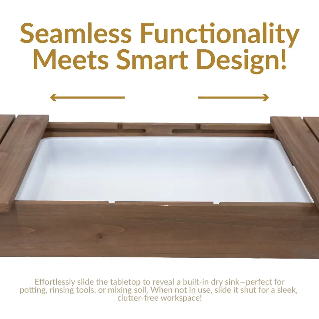 This fir wood planting table combines practicality and durability, making gardening tasks more efficient and organized. The sliding tabletop design provides a spacious work surface and reveals a polyethylene dry sink, which is useful for potting plants, rinsing tools, or mixing soil with ease. Crafted from sturdy fir wood with a stained finish, the outdoor garden table offers both strength and a natural aesthetic that complements any garden, patio, or greenhouse. The removable 360-degree rotating wheels allow for effortless mobility, making it easy to move the bench as needed. Built-in hooks provide a convenient place to keep frequently used gardening tools within reach, reducing clutter and maximizing efficiency. A lower storage shelf adds additional space for pots, soil, and other essentials. Whether used for planting, organizing supplies, or preparing seedlings, this versatile potting bench is a valuable addition to any outdoor or gardening space, offering both functionality and charm.• CONVENIENT DESIGN: Measuring 39.25" W (58.25" W when fully extended) x 18.25" D x 55" H (52.75" H without the caster wheels attached), this gardening table provides ample workspace without taking up too much room. The table height is 32.75" H (30.5" H without the caster wheels). The wide tabletop offers plenty of space for potting plants and organizing gardening supplies, while two small 34" W x 3.75" D upper shelves keep smaller tools, seeds, or decorative items within easy reach.• BUILT TO LAST OUTDOORS: Crafted from solid fir wood with a protective brown stain finish, this gardening bench is designed for durability and longevity in outdoor settings. The table and bottom shelf weight capacities are 100 lbs each, the small upper shelves are 5 lbs each. The sturdy construction provides a stable workspace for potting and organizing gardening essentials, while the polyethylene dry sink (20.5" W x 14.5" D x 4" H) resists moisture and is easy to clean.• ALL HARDWARE INCLUDED: This outdoor potting bench includes the hardware, 2 garden tool hooks, casters, and wood pieces needed to assemble the potting table, ensuring nothing is missing for a full setup. A crosshead screwdriver and a 10mm wrench (not included) are required for construction, allowing for a secure and sturdy final build.• FLEXIBLE MOBILITY AND STABILITY: Designed for versatility, this greenhouse table includes two locking casters and two non-locking casters, making it easy to move between work areas and secure in place when needed. For those who prefer a stationary setup, the casters can be left off entirely, allowing the bench to remain firmly in one spot.• WORRY-FREE PURCHASING: Sunnydaze Decor backs its products with a 1-year manufacturer's warranty.