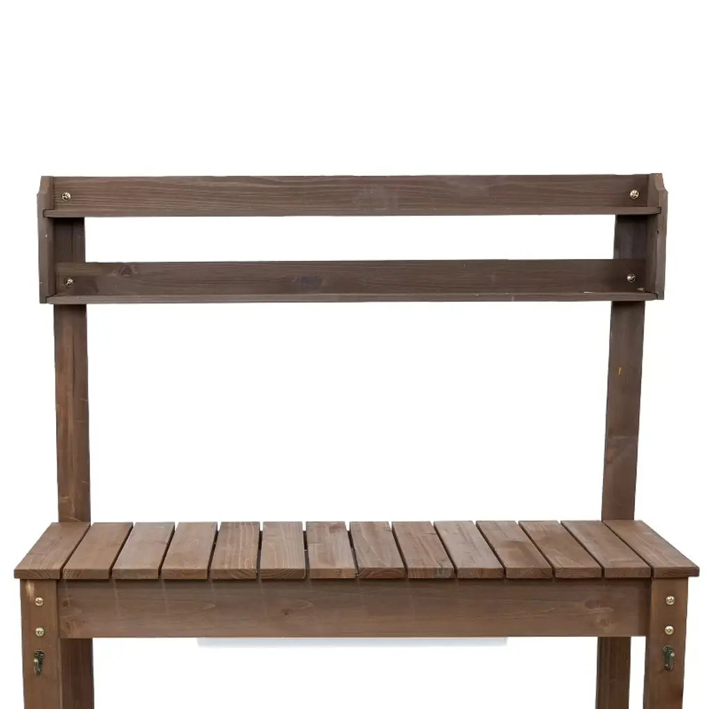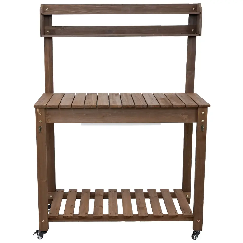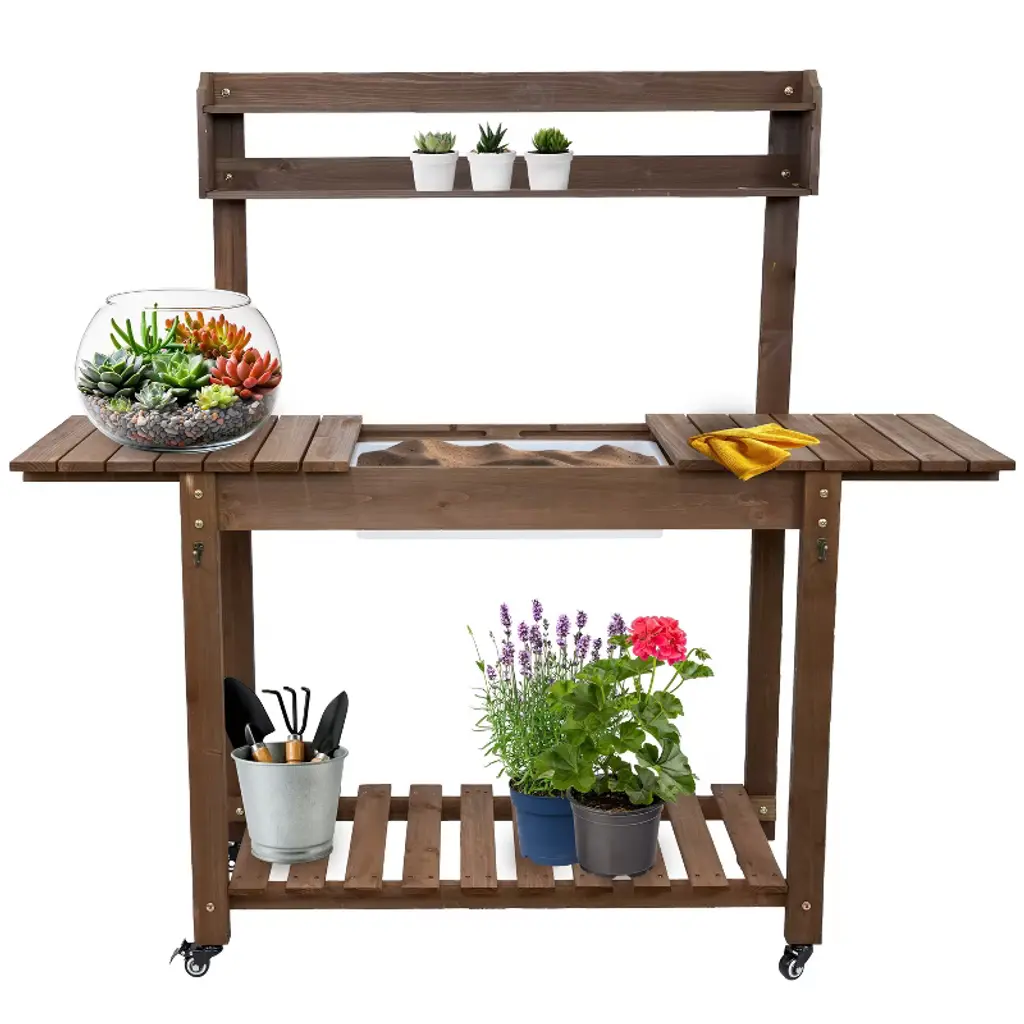 This fir wood planting table combines practicality and durability, making gardening tasks more efficient and organized. The sliding tabletop design provides a spacious work surface and reveals a polyethylene dry sink, which is useful for potting plants, rinsing tools, or mixing soil with ease. Crafted from sturdy fir wood with a stained finish, the outdoor garden table offers both strength and a natural aesthetic that complements any garden, patio, or greenhouse. The removable 360-degree rotating wheels allow for effortless mobility, making it easy to move the bench as needed. Built-in hooks provide a convenient place to keep frequently used gardening tools within reach, reducing clutter and maximizing efficiency. A lower storage shelf adds additional space for pots, soil, and other essentials. Whether used for planting, organizing supplies, or preparing seedlings, this versatile potting bench is a valuable addition to any outdoor or gardening space, offering both functionality and charm.• CONVENIENT DESIGN: Measuring 39.25" W (58.25" W when fully extended) x 18.25" D x 55" H (52.75" H without the caster wheels attached), this gardening table provides ample workspace without taking up too much room. The table height is 32.75" H (30.5" H without the caster wheels). The wide tabletop offers plenty of space for potting plants and organizing gardening supplies, while two small 34" W x 3.75" D upper shelves keep smaller tools, seeds, or decorative items within easy reach.• BUILT TO LAST OUTDOORS: Crafted from solid fir wood with a protective brown stain finish, this gardening bench is designed for durability and longevity in outdoor settings. The table and bottom shelf weight capacities are 100 lbs each, the small upper shelves are 5 lbs each. The sturdy construction provides a stable workspace for potting and organizing gardening essentials, while the polyethylene dry sink (20.5" W x 14.5" D x 4" H) resists moisture and is easy to clean.• ALL HARDWARE INCLUDED: This outdoor potting bench includes the hardware, 2 garden tool hooks, casters, and wood pieces needed to assemble the potting table, ensuring nothing is missing for a full setup. A crosshead screwdriver and a 10mm wrench (not included) are required for construction, allowing for a secure and sturdy final build.• FLEXIBLE MOBILITY AND STABILITY: Designed for versatility, this greenhouse table includes two locking casters and two non-locking casters, making it easy to move between work areas and secure in place when needed. For those who prefer a stationary setup, the casters can be left off entirely, allowing the bench to remain firmly in one spot.• WORRY-FREE PURCHASING: Sunnydaze Decor backs its products with a 1-year manufacturer's warranty.