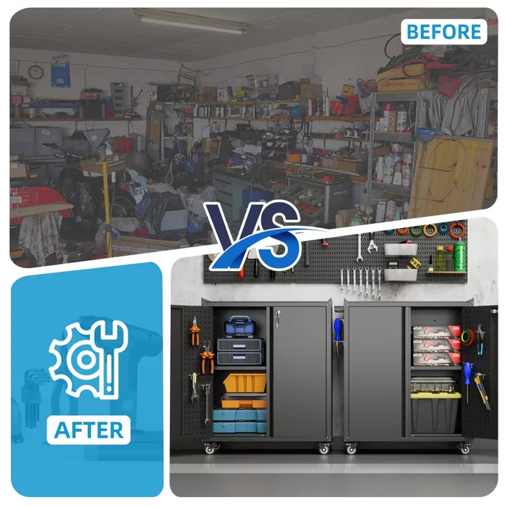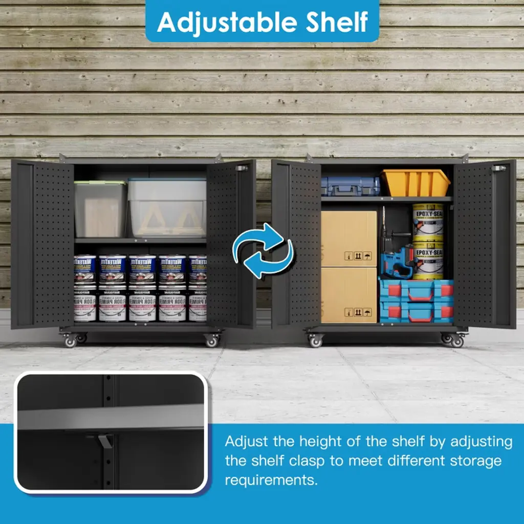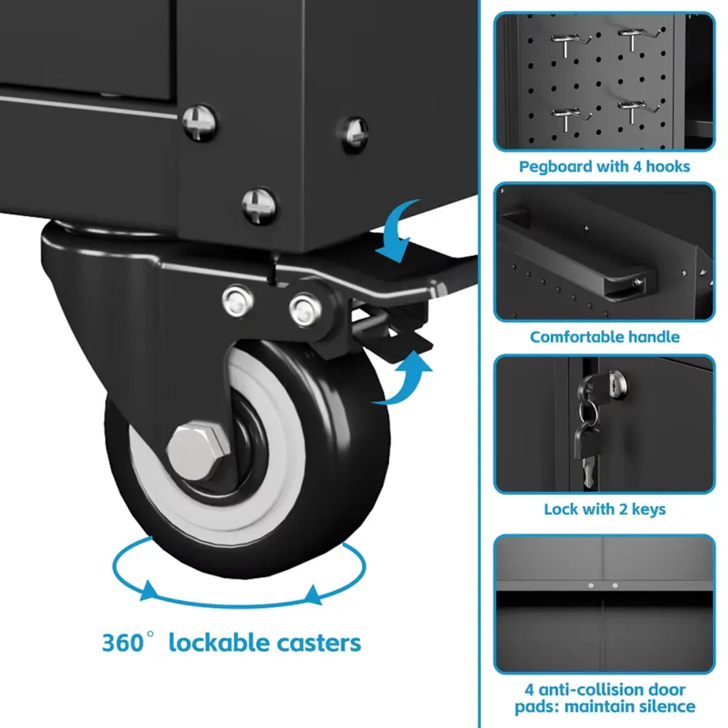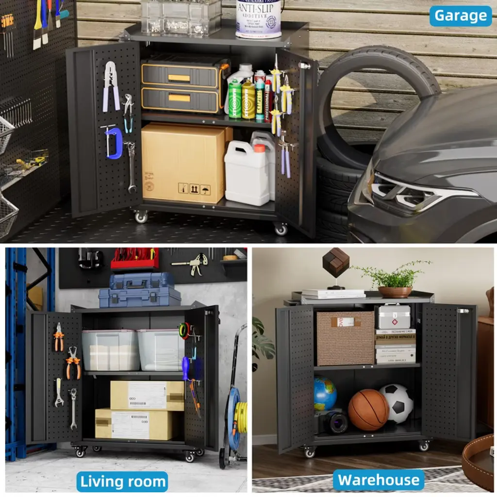 This versatile Metal Tool Cabinet combines durable construction with smart organization features, designed to streamline storage in garages, workshops, home utility spaces, or offices. Crafted from sturdy metal, the cabinet includes a built-in pegboard and four hooks for customizable tool storage, along with two secure doors to keep contents protected. Equipped with wheels for easy mobility and a sleek finish, this cabinet balances functionality and style. Minimal assembly is required for quick setup, making it an ideal solution for decluttering and optimizing workspace efficiency!