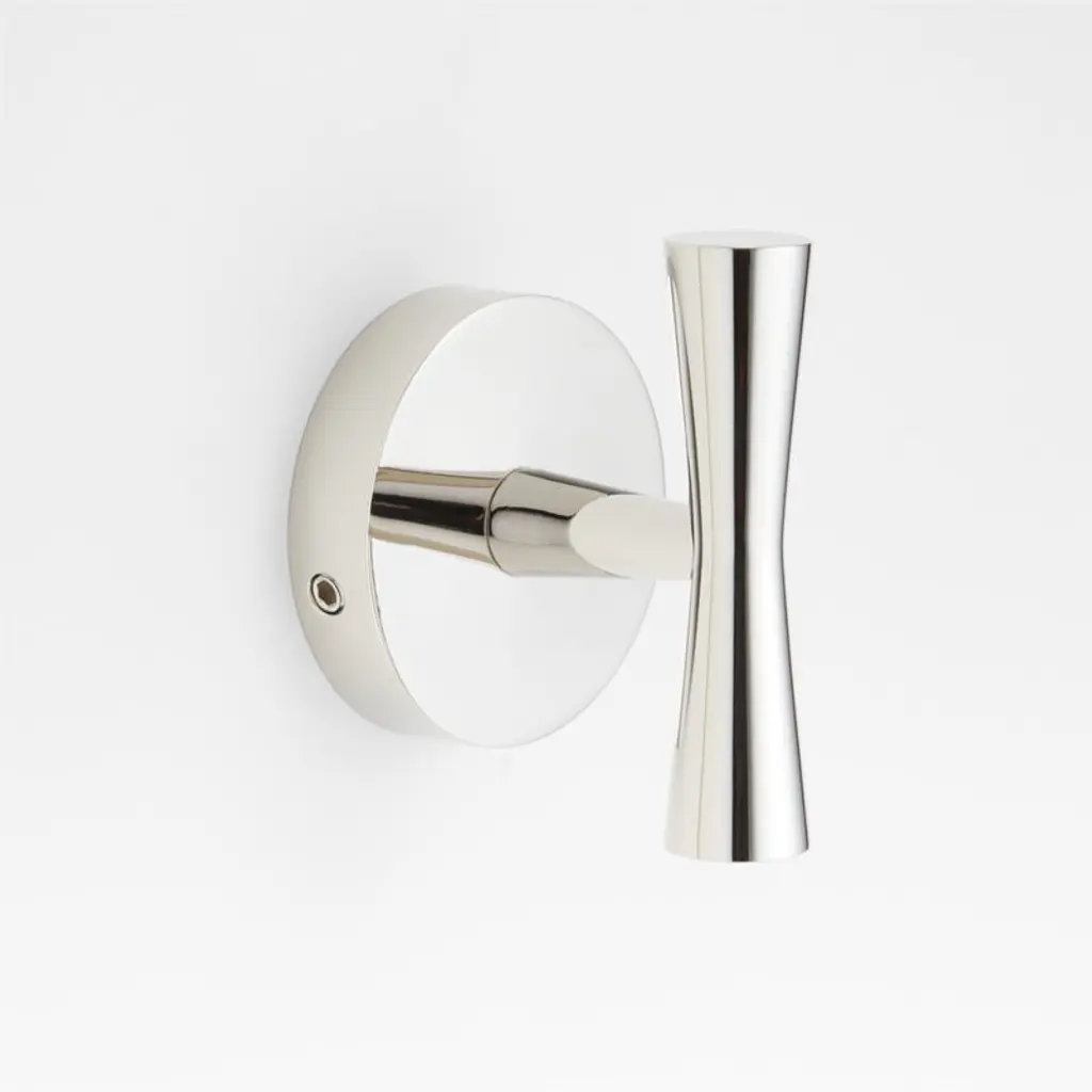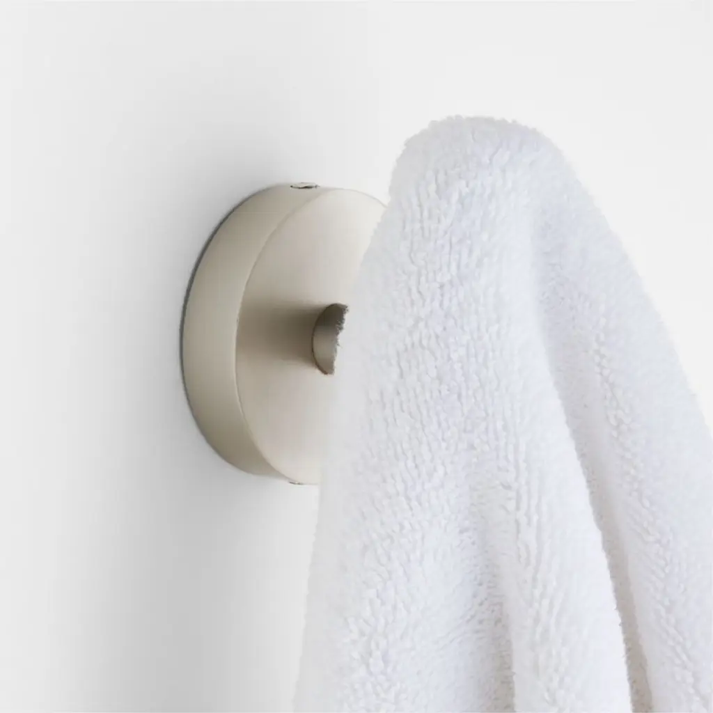 Sometimes it's the small things that pull a room together. That's why we've designed a hardware collection with modern silhouettes, clean lines and a touch of tradition to give your bathroom that perfect finishing touch. Made of brass with a brushed nickel finish, the stylish hook places an hourglass-tapered rod on the vertical for hanging bath or hand towels. The hook juts out from a tapered post set in a round rosette for a graphic look with modern proportions. The towel hook is ready to mount on the wall with included hardware.