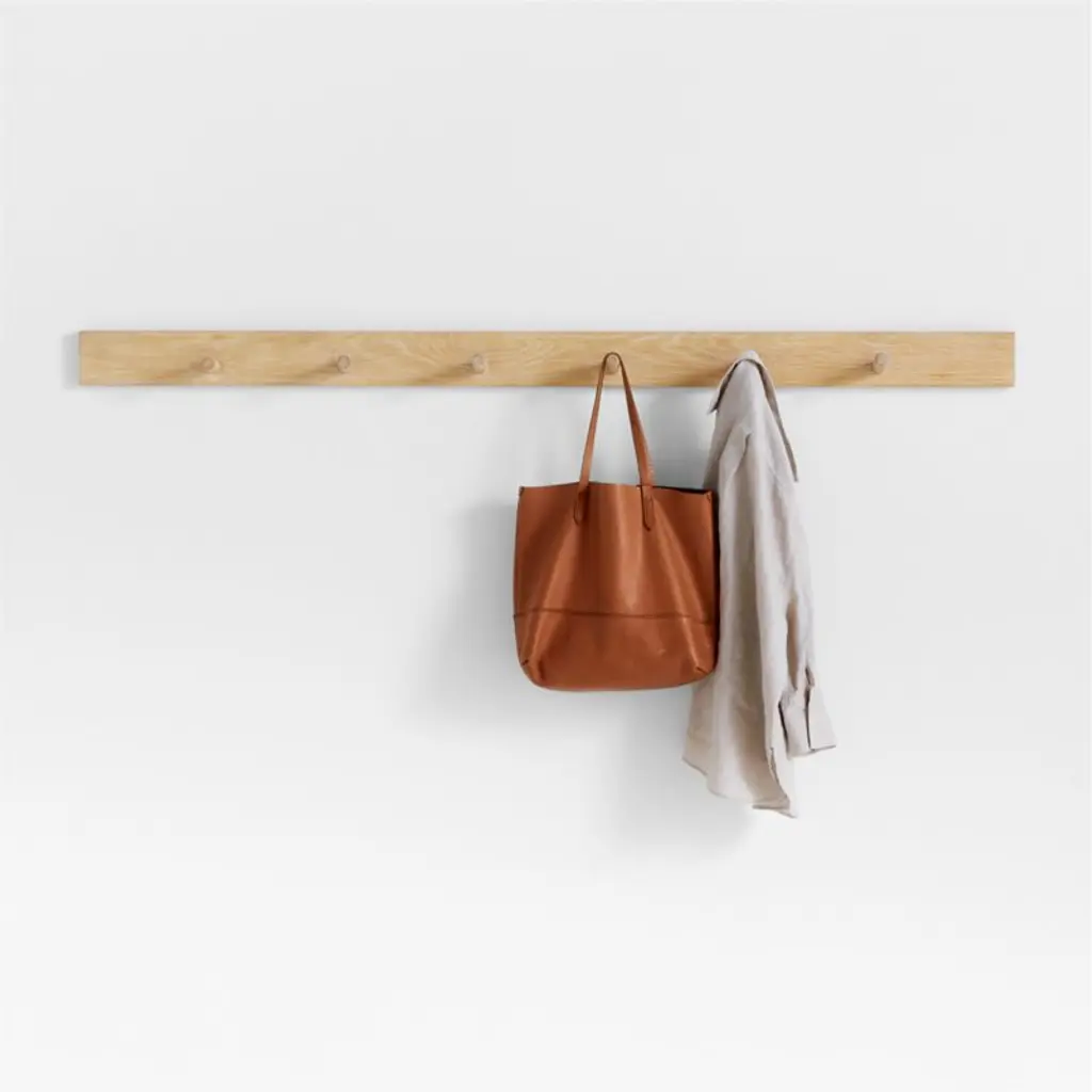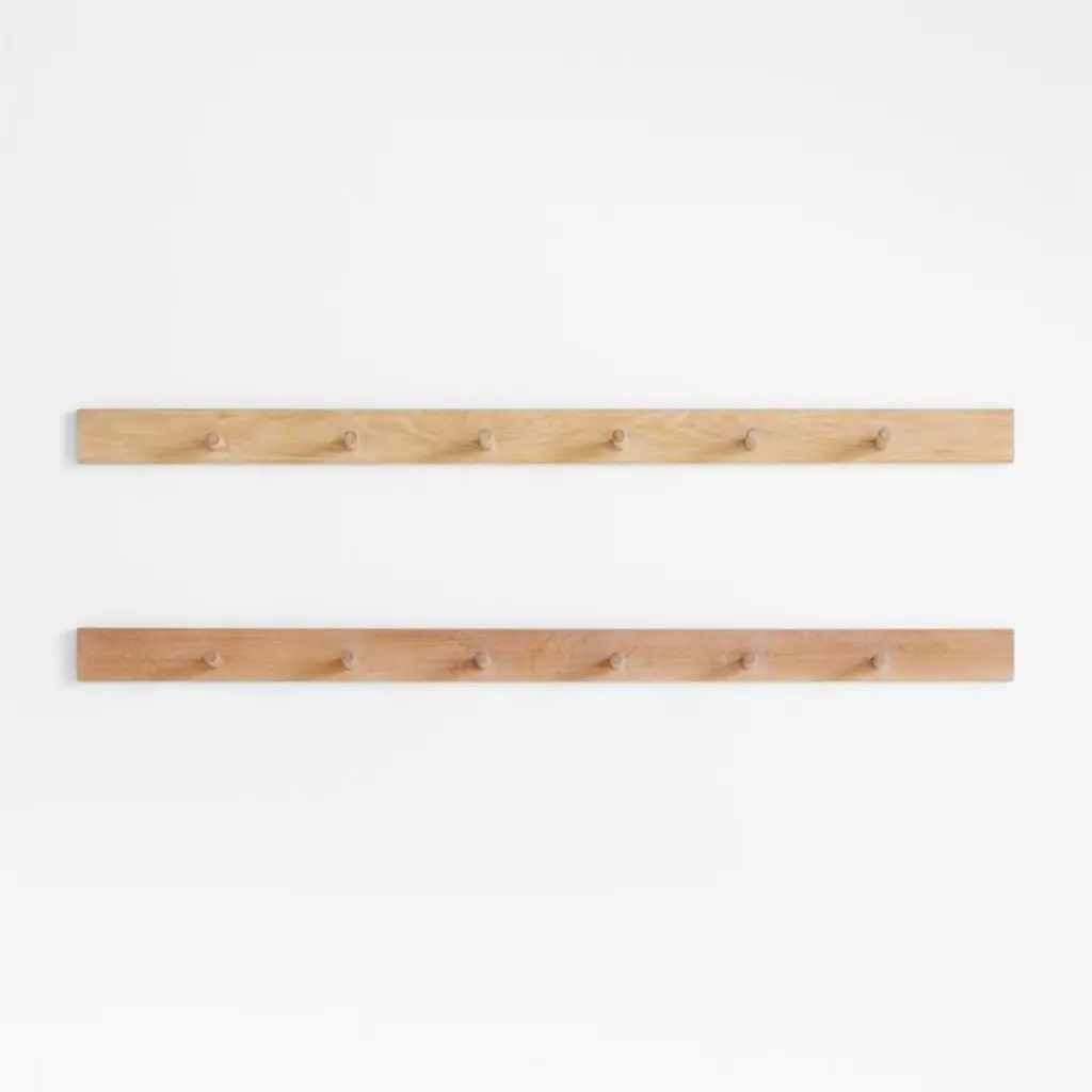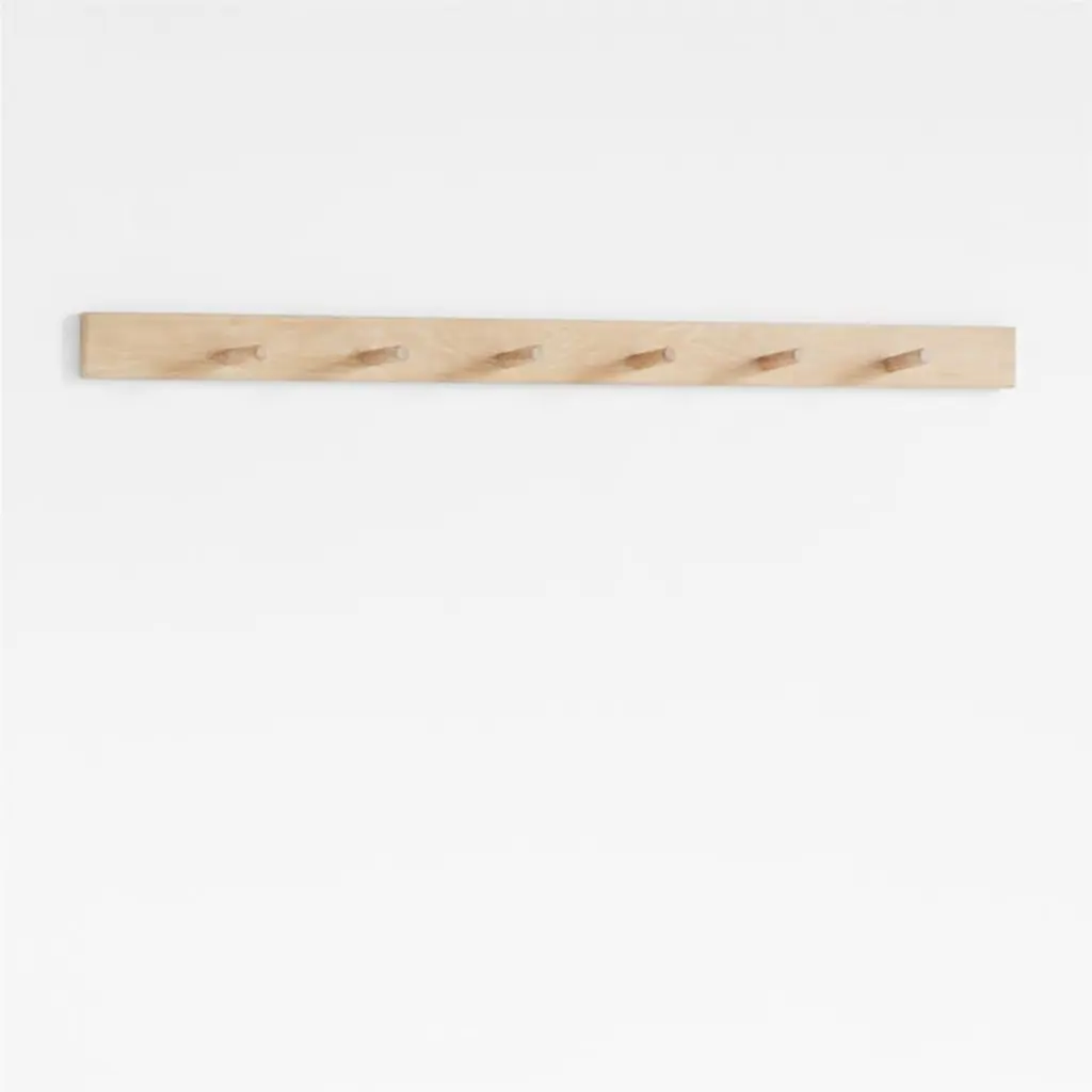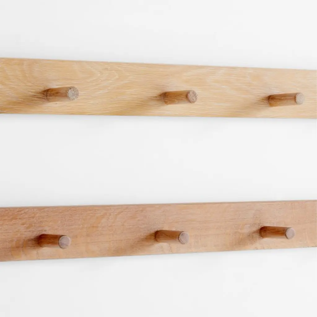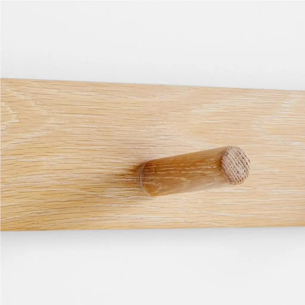 Crafted of white oak with a hand-applied natural finish, our Terra wall hooks celebrate the rustic beauty of wood with a streamlined silhouette. Six cylindrical pegs line up a simple board mount, angled ever so slightly to keep bags, coats, hats and scarfs from slipping off. Designed to coordinate with our Terra storage collection, the coat rack works just as well in any room that needs a place for hanging everyday essentials. Rich with tonal variations, knots and checking that make each wall hook rack unique, Terra exudes rustic authenticity and farmhouse appeal.