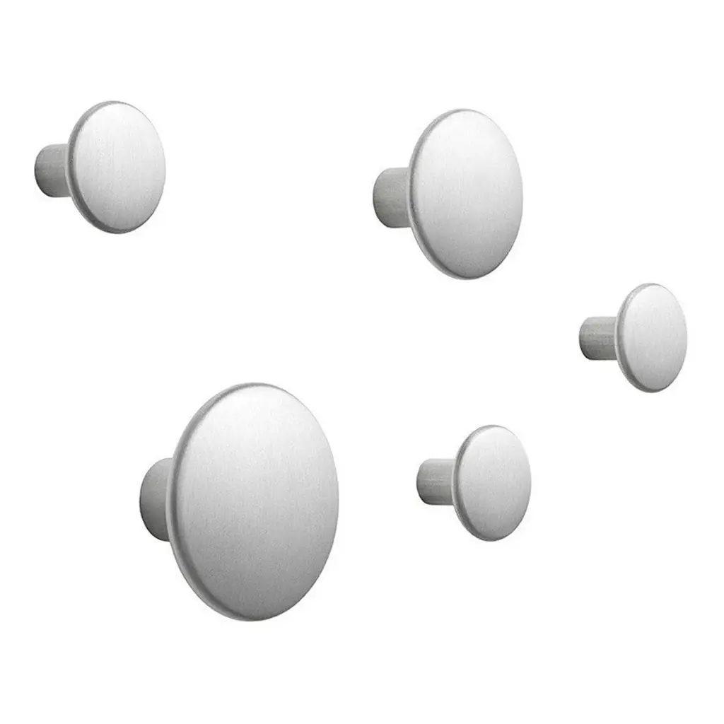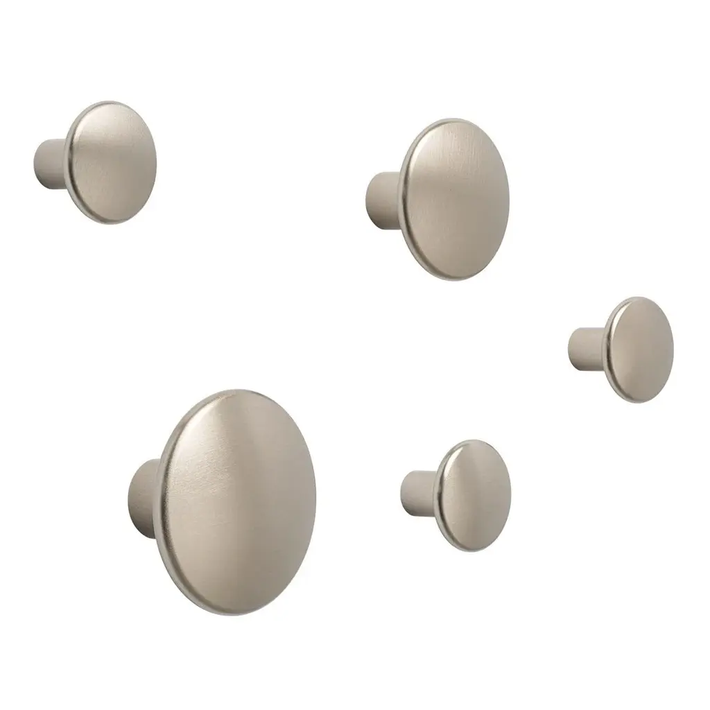 The THE DOTS METAL COAT HOOKS Set of 5 is a member of the Dots collection, these brass and aluminum dots are ideal for kitchens, bathrooms, bedrooms, and hallways.