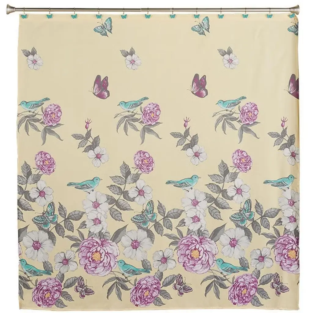 Totally coordinate your bathroom with this Valentina Bath Collection. It features butterflies, blue birds and flowers on a pale yellow background. Hang the Shower Curtain with the Set of 12 Hooks, shaped like butterflies. Lay the Bath Rug in front of the tub. The 100% cotton Set of 2 Hand Towels each feature an embroidered butterfly and flower. Trim the window with the Valance.