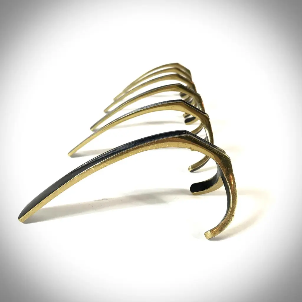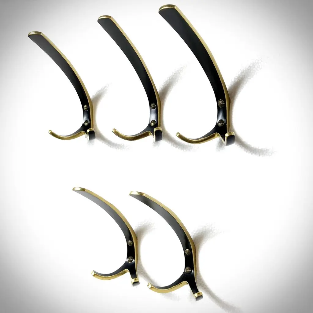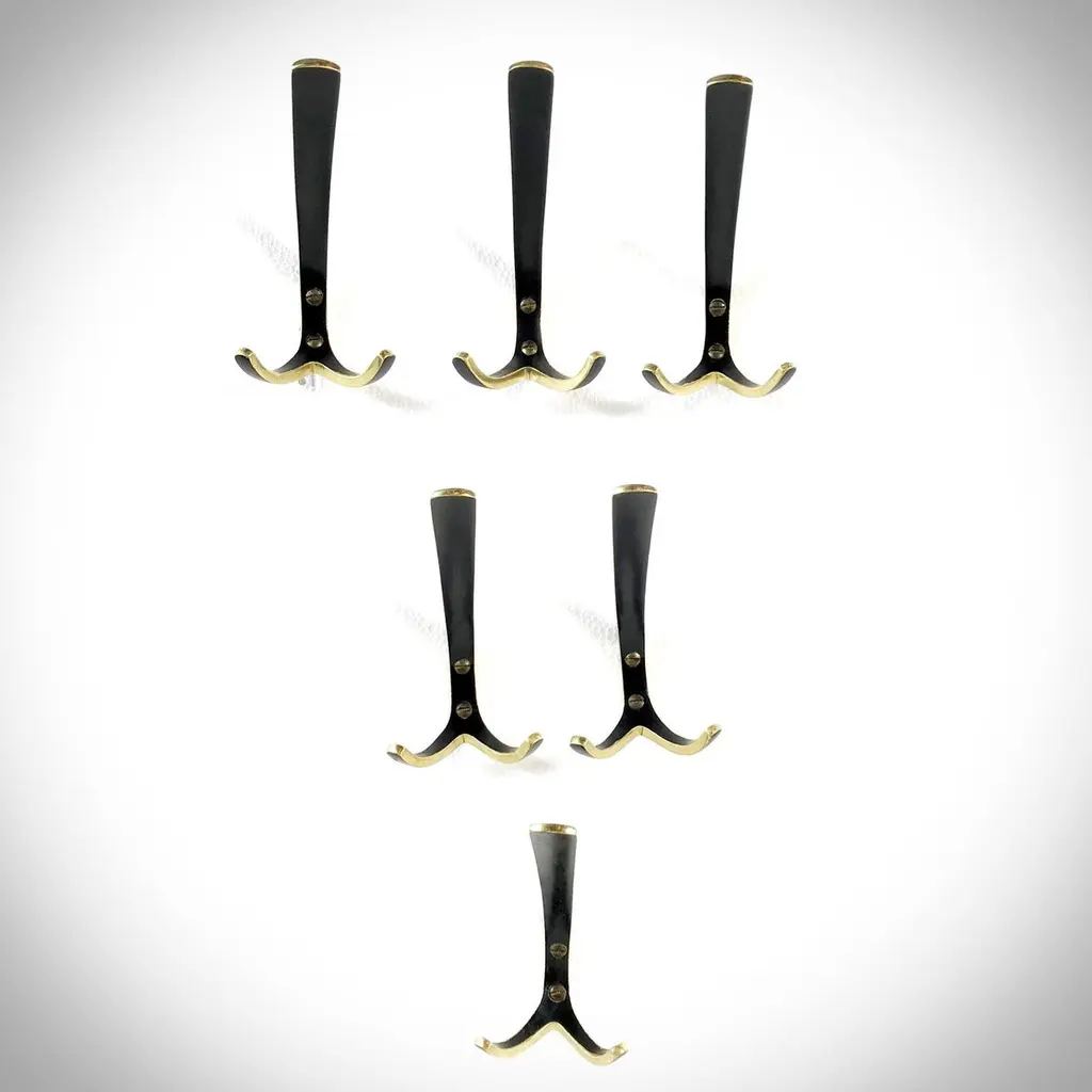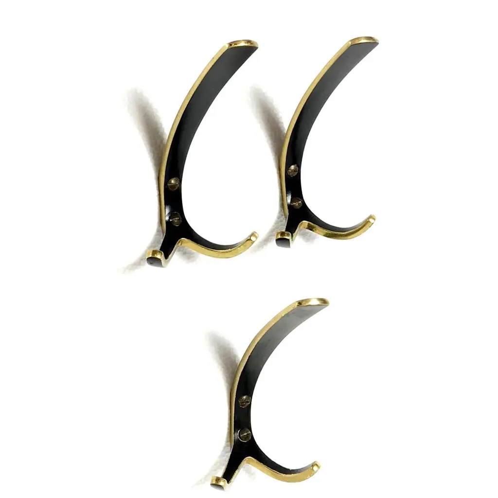 Beautiful Austrian Mid-Century Modern solid brass hooks from the "Black Gold Line" designed & manufactured by Walter Bosse and Herta Baller (Bosse Baller Company) in 1950s. Handmade of polished solid brass partly black lacquered and come with the original brass screws. In nice original condition.