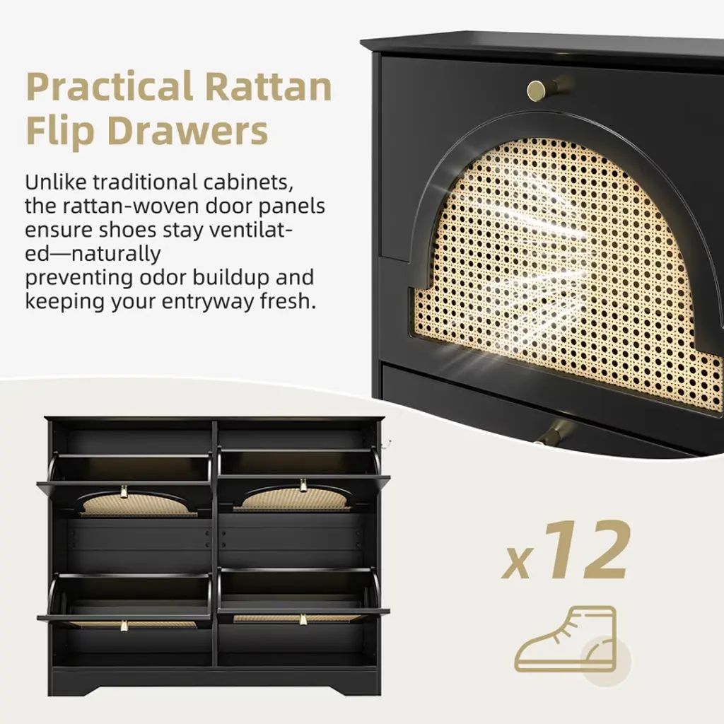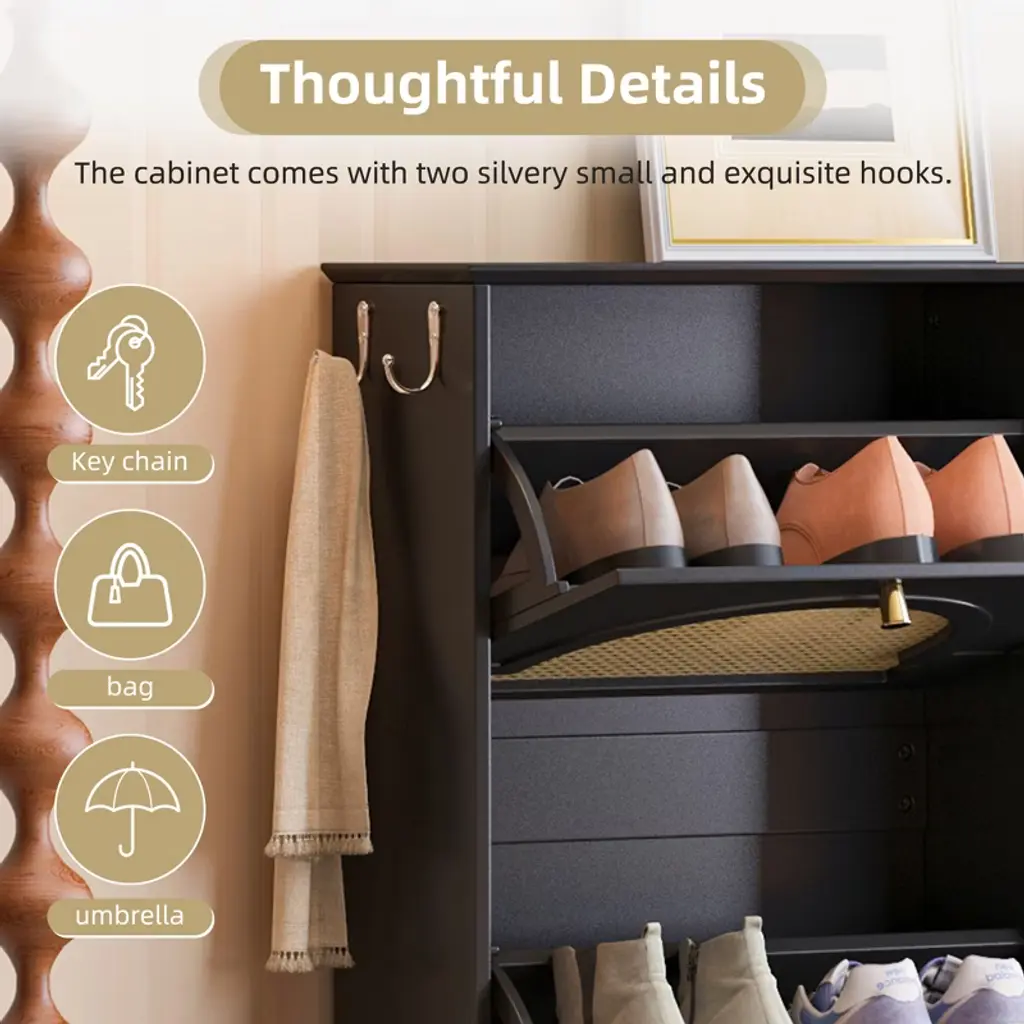 Tiramisubest 42.1"w Mid-century Narrow Tipping Bucket Shoe Cabinet With 4 Flip Drawers, Elegant Rattan Doors & Hooks, Black