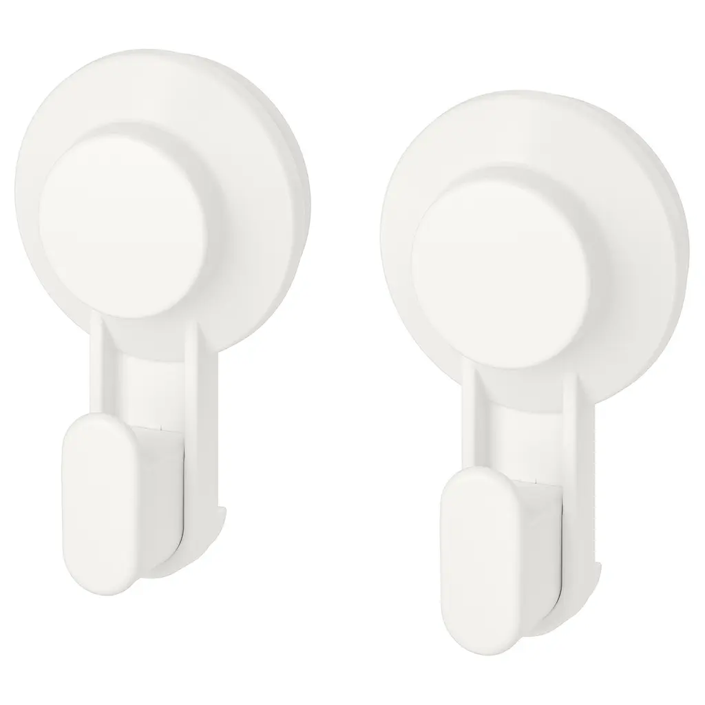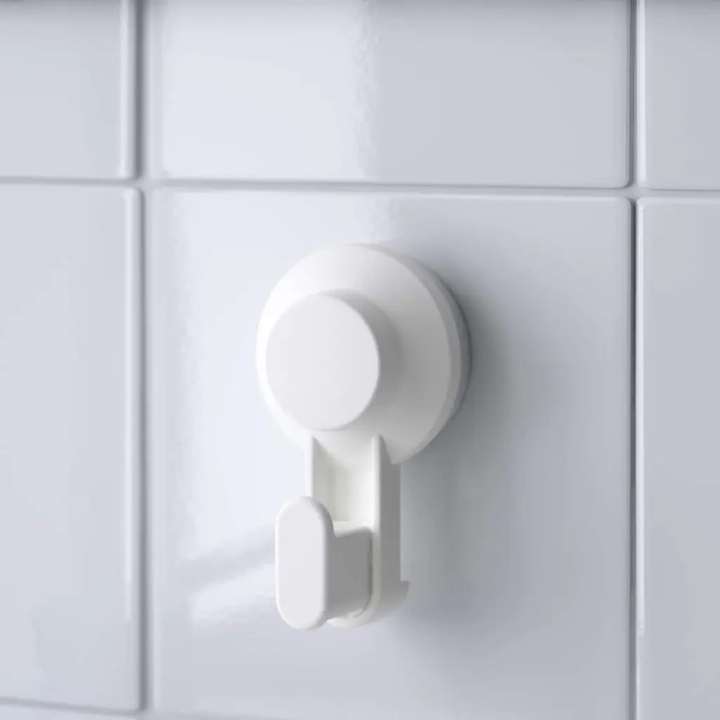 TISKEN Hook with suction cup - white. One push assembly - clean the wall surface and push to attach. No tools are needed. To release and remove, insert a credit card (or similar) between the suction cup and the wall. No ugly holes or marks are left behind. Suitable for use in the shower.
