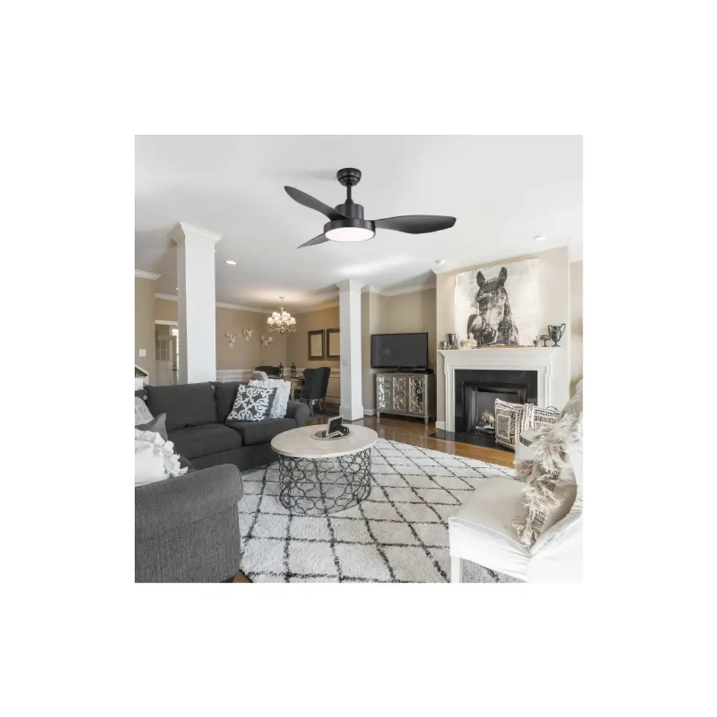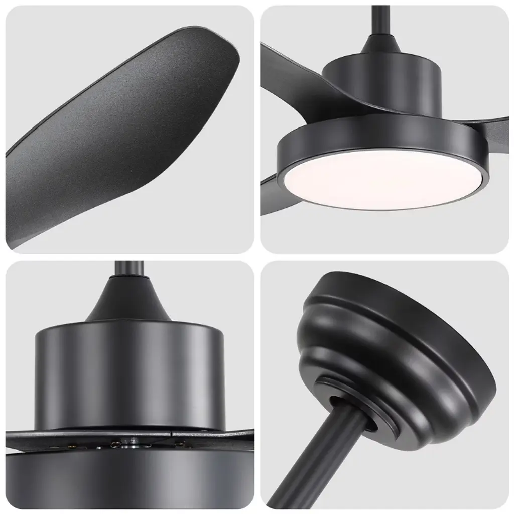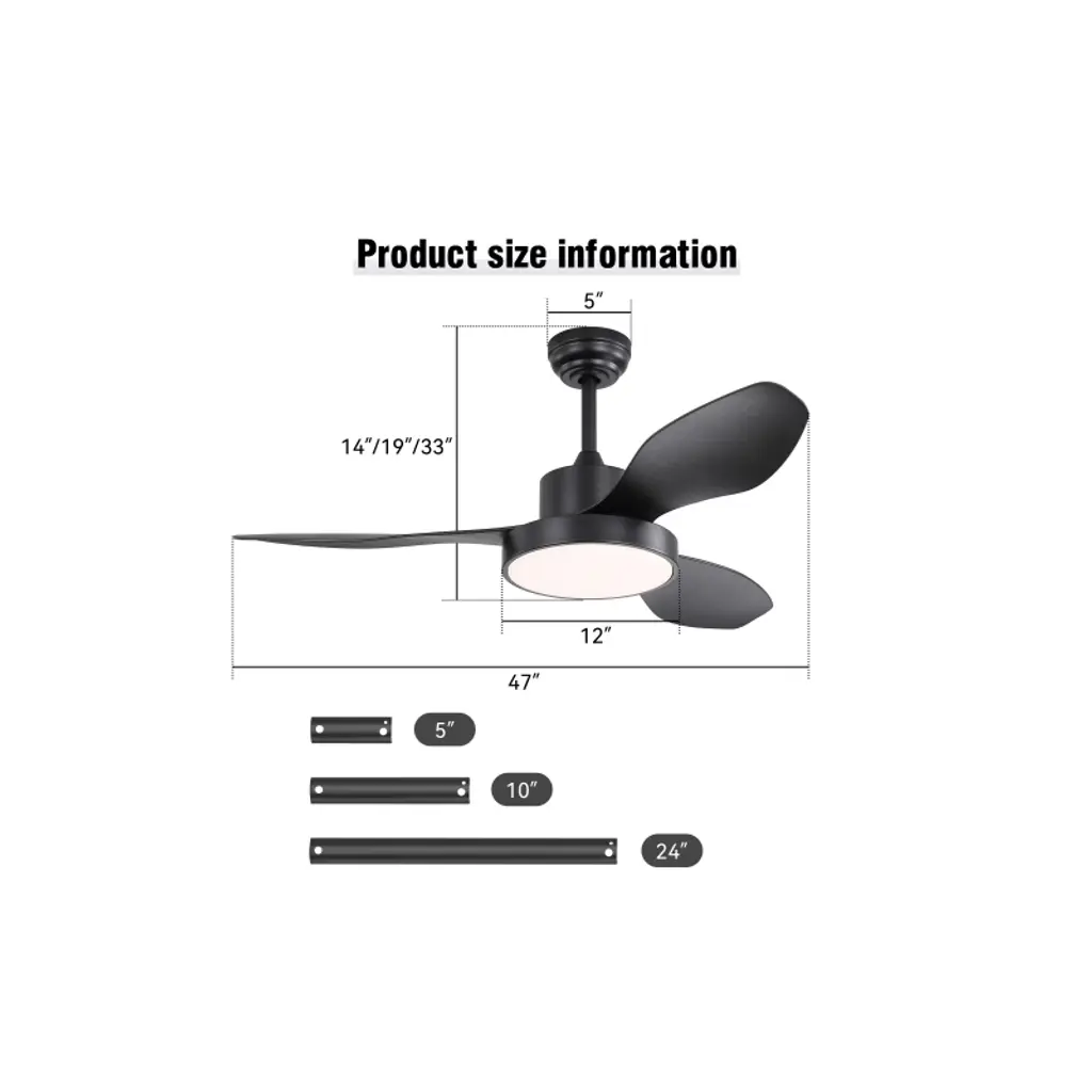 47 Inch Ceiling Fan with Light Color: Black Blades/ Black Body Blade Material: ABS Blades Size: 47" Voltage: 100-240V/50Hz-60Hz Light Source: 3CCT LED 22W Special Feature: Timer Certification: ETL Downrod: 5"/10"/24" Room Type: Farmhouse, Restaurant, Rustic, Garage, Living Room, Bedroom, Home Office, Kids Room, Balcony, Cabinet, Garage, Garden, Home, Shop, Dining Room High Quality Ceiling Fan This ceiling fan features a high-capacity pure copper DC motor, delivering powerful airflow and ensuring years of quiet performance. With its durable and modern design, this 47-inch ceiling fan is perfect for small to medium-sized rooms ranging about 80 sq.ft. Reversible Ceiling Fan Reversible DC Motor Quiet Energy saving, Function Includes Forward and Reverse for Summer and Winter 2 Airflow Modes, Cooling In Summer and Keeping Warm in Winter. Advanced Saving 3CCT LED Light The ceiling fan light has a built-in 22W LED light source that allows for three color dimming functions. You can choose soft warm white light, bright white light or cool white light according to their needs, creating the ideal atmosphere for different scenes.
