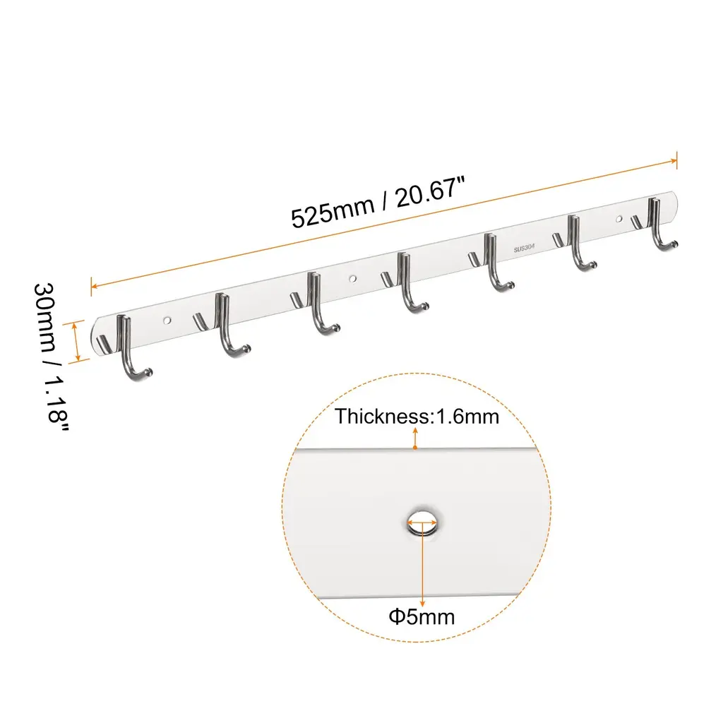 This coat hook rack is crafted from durable 304 stainless steel, ensuring long-lasting performance and resistance to rust and corrosion. Its polished finish and smooth surface prevent ruin to clothes and bags while offering ample hanging space. Suitable for humid environments and outdoor use, the hooks are securely mounted to the wall, providing reliable support for a variety of items. Ideal for organizing bags, pants, skirts, coats, hats, scarves, towels, umbrellas, keys, and more, this versatile hook rack can be installed in bedrooms, living rooms, bathrooms, cloakrooms, kitchens, and various other settings. The installation process is straightforward, with all necessary screws and dowels included. Simply clean the wall and use the provided mounting parts to secure the rack in your desired location, making it a functional addition to homes, offices, shops, and hotels.