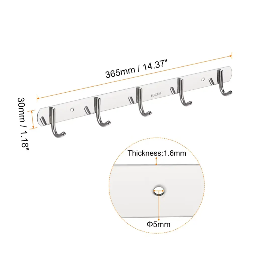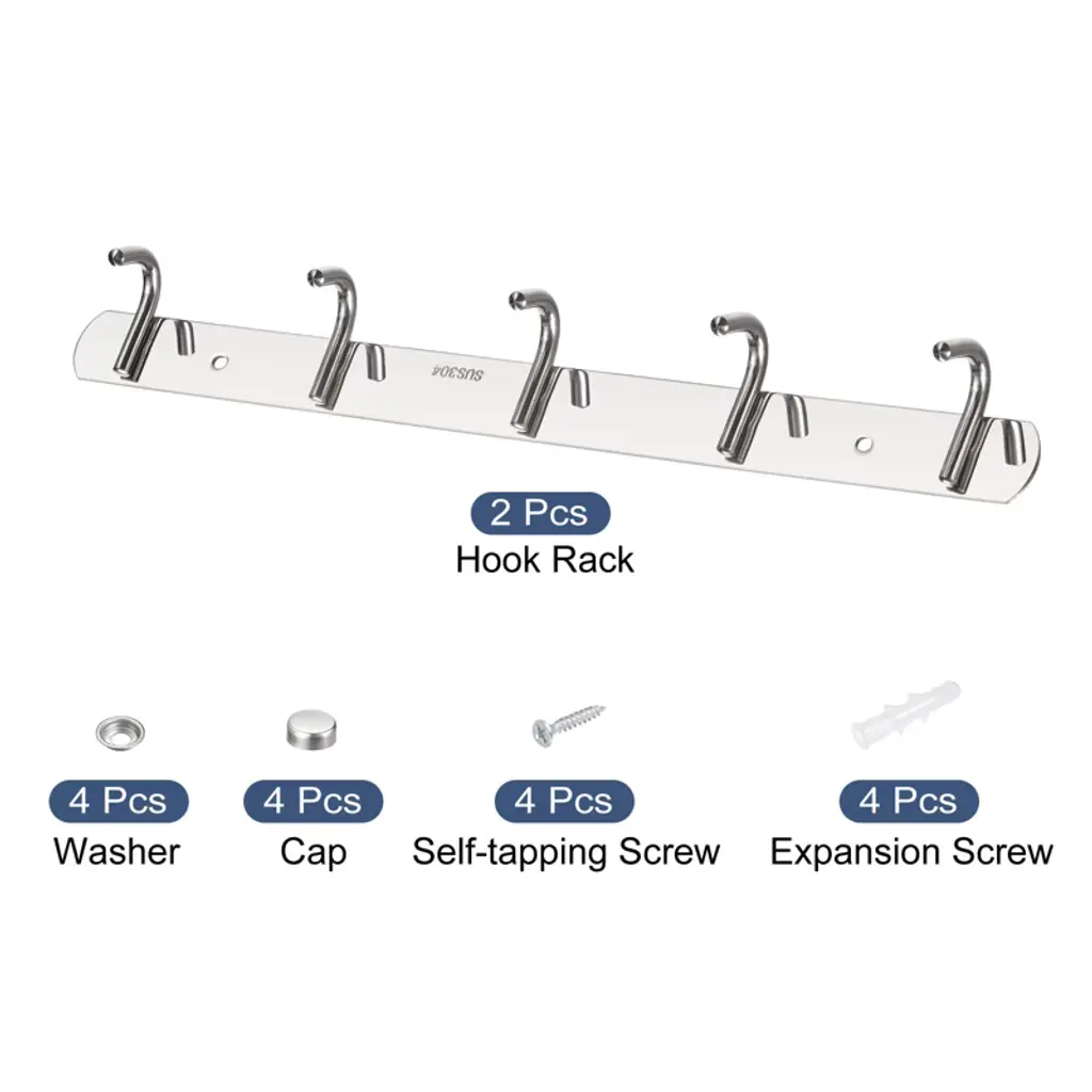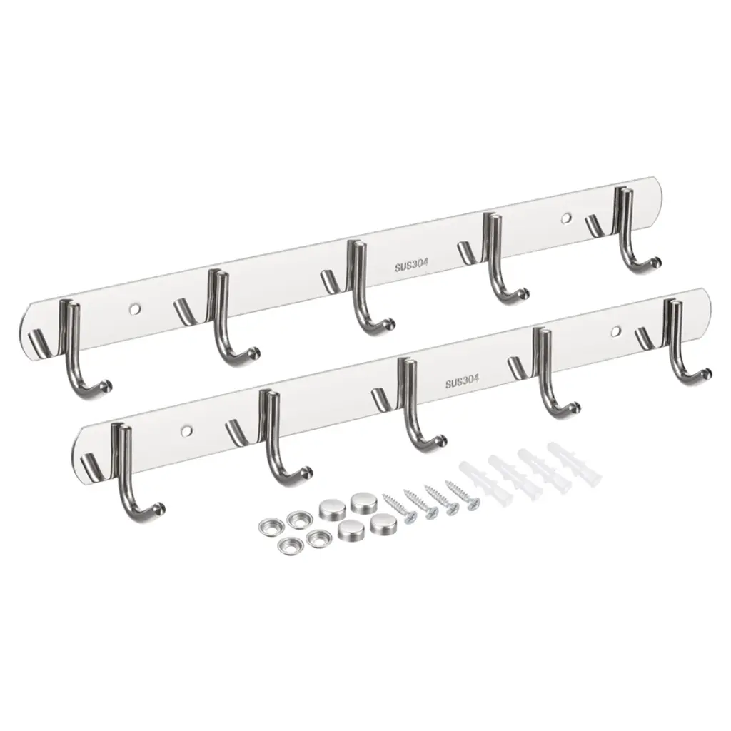 Unique Bargains 304 Stainless Steel Polished Wall Mounted Durable Coat Hooks 2 Pcs 5 Hooks