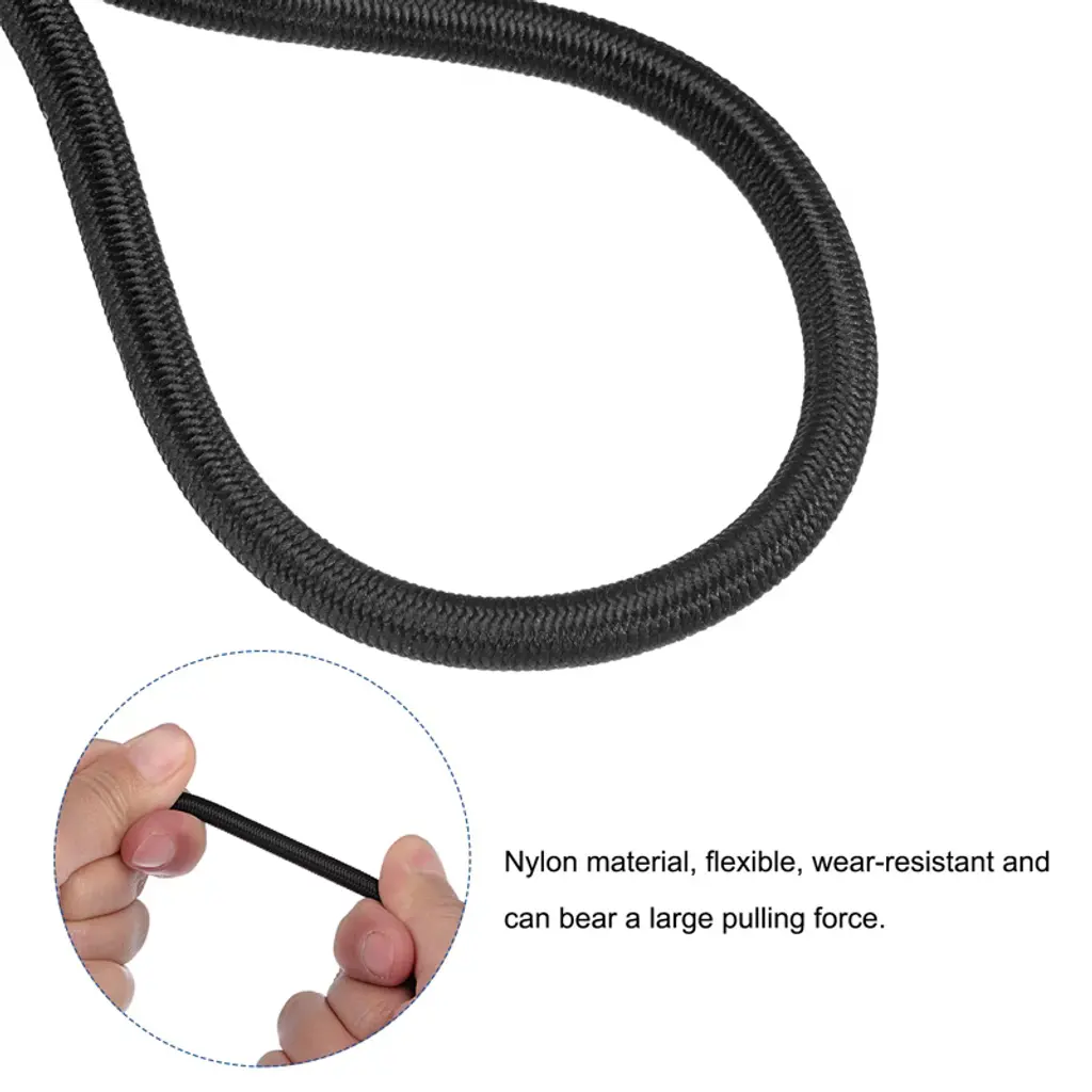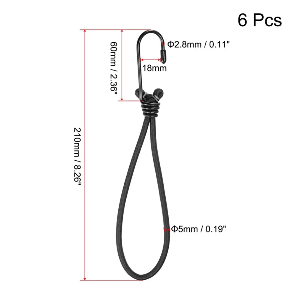 What is this? There are various applications in daily life, such as indoor or outdoor usages, fit for camping tents, canvases, cargo, hiking, boating, hauling, bundles, kayaks, awnings, and tying storage. What to get? Color: Black; Material: Polyester, Metal; Rope Diameter: 5mm / 0.19 inch; Hook Opening: 18mm / 0.70 inch; Overall Length: 210mm / 8.26 inch; Hook Size: 60 x 2.8mm / 2.36 x 0.11 inch (L*D); Package Content: 6 x Rope; Are there any advantages of this product? Made of Polyester and metal materials, it can stretch for your needs, wear-resistant, and can be last for a long time, flexible and practical in use. How to use it? Wrap an elastic rope through the cord, then hook the elastic cord together to hold it in place. What to notice? Do not stretch the rope excessively and be careful that the rope rebounds.