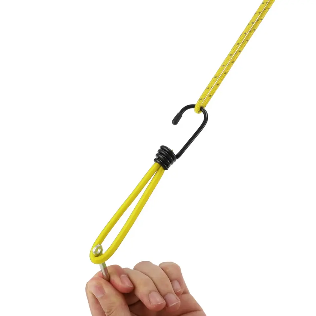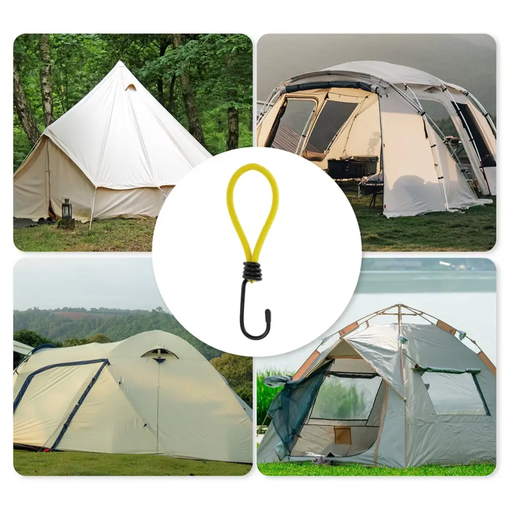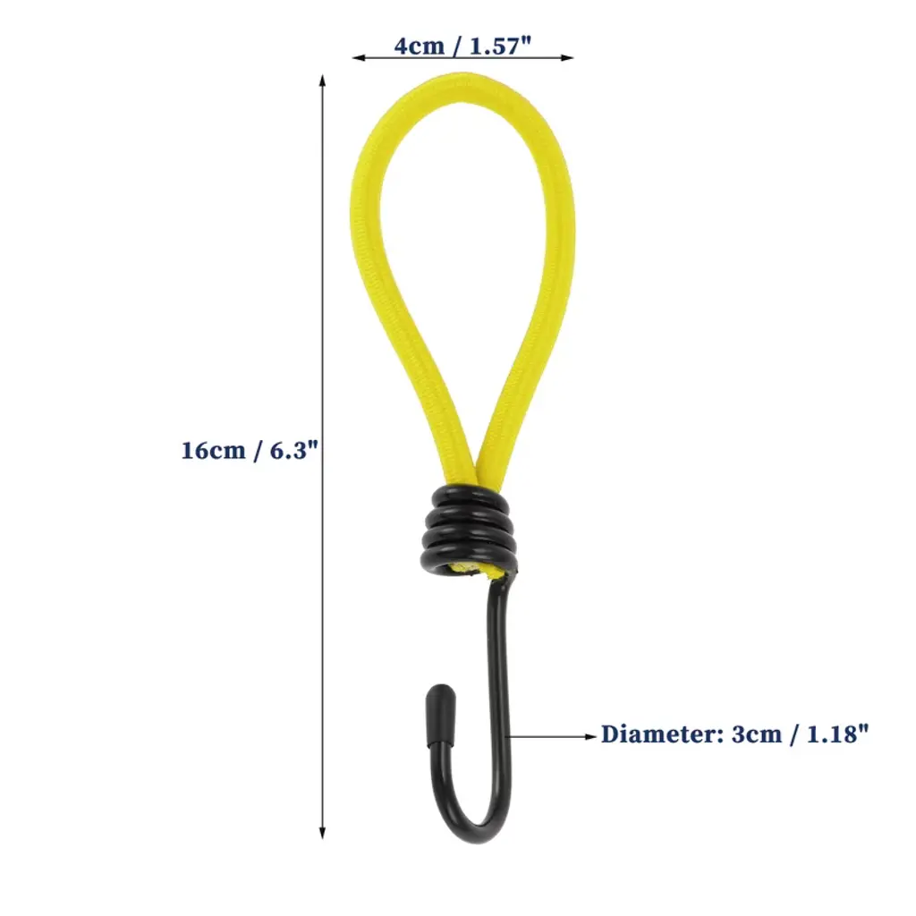 Item Function: 1. Made of quality latex and iron material, flexible and able to withstand a lot of tension. The hooks have rubber ends so they will not pierce fabric. 2. This cord hooks is lightweight and compact, therefore it is easy to carry and store, you can take it to whereever you like. It is easy to Use. Just put the loop through the eyelet of your tent, etc., put the hook through the loop and pull tight. Add them to the end of a mountaineering carabiner for a camping essential. 3. This cord hooks can help you hold things in place. For example it can be used to secure your tent/canopy to a ground anchor or use them to keep the entrance to your tent open. Specifications: Material: Latex, Iron; Hook Diameter: 3cm / 1.18"; Overall Size: 16x4cm / 6.3"x1.57"(L*W); Package List: 4 Pcs Cord Hooks.