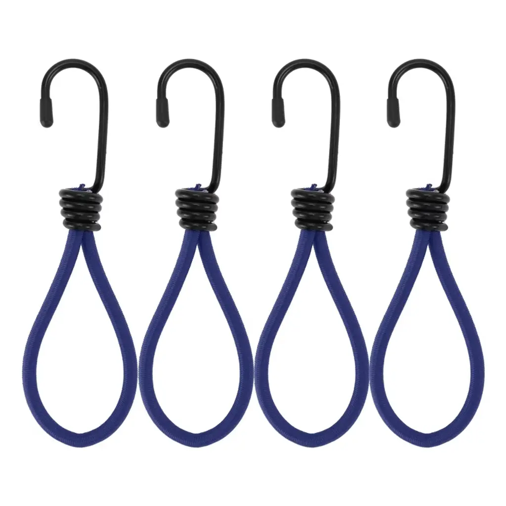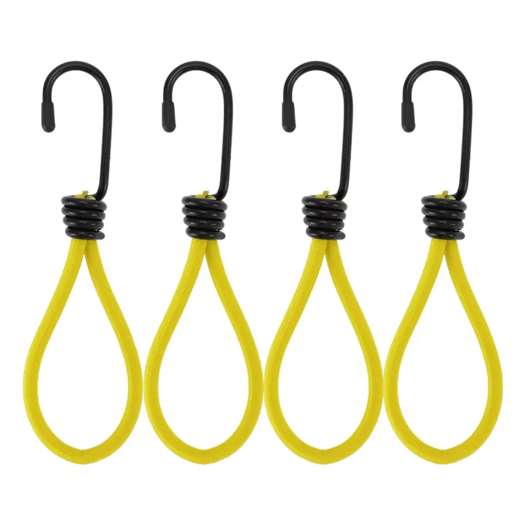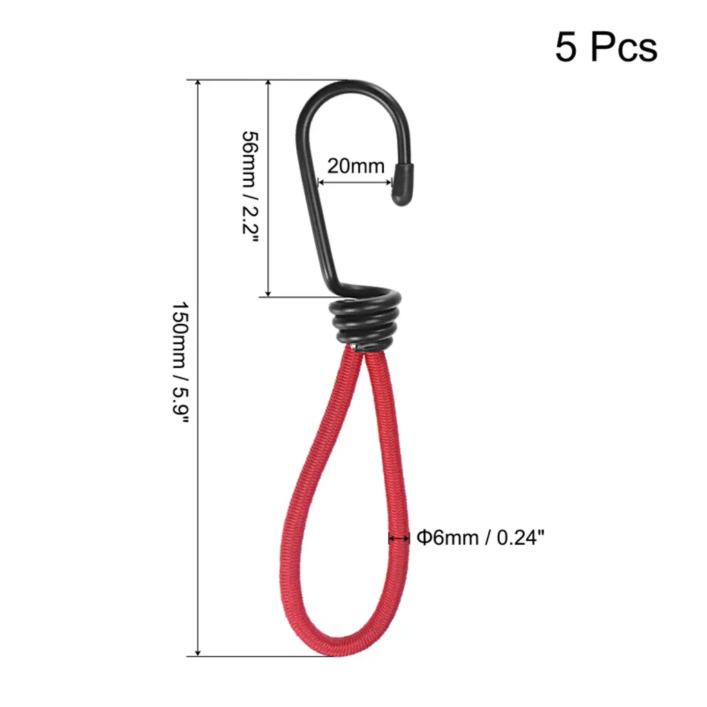 What is this? There are various applications in daily life, such as indoor or outdoor usages, fit for camping tents, canopies, canvases, cargo, hiking, boating, hauling, bundles, kayaks, awnings, and tying storage. What to get? Material: Nylon, Iron; Overall Length: 150mm / 5.9"; Rope Diameter: 6mm / 0.24"; Hook Length: 56mm / 2.2"; Hook Opening: 20mm / 0.79"; Package Content: 5 x Elastic Cords; Are there any advantages of this product? Made of nylon and metal materials, it can stretch for your needs, wear-resistant, and can be last for a long time, flexible and practical in use. How to use it? Wrap an elastic rope through the cord, then hook the elastic cord together to hold it in place. What to notice? Do not stretch the rope excessively and be careful that the rope rebounds.